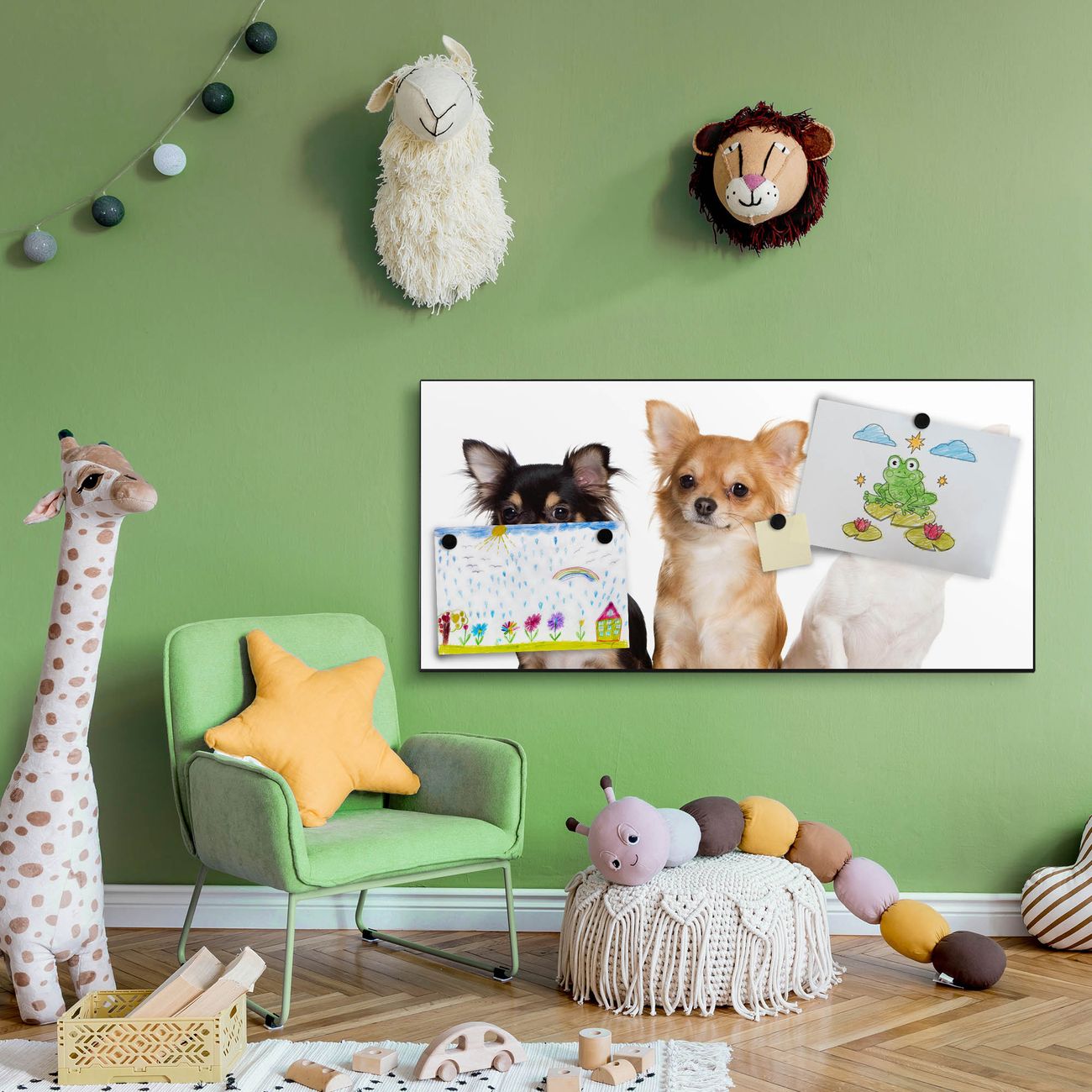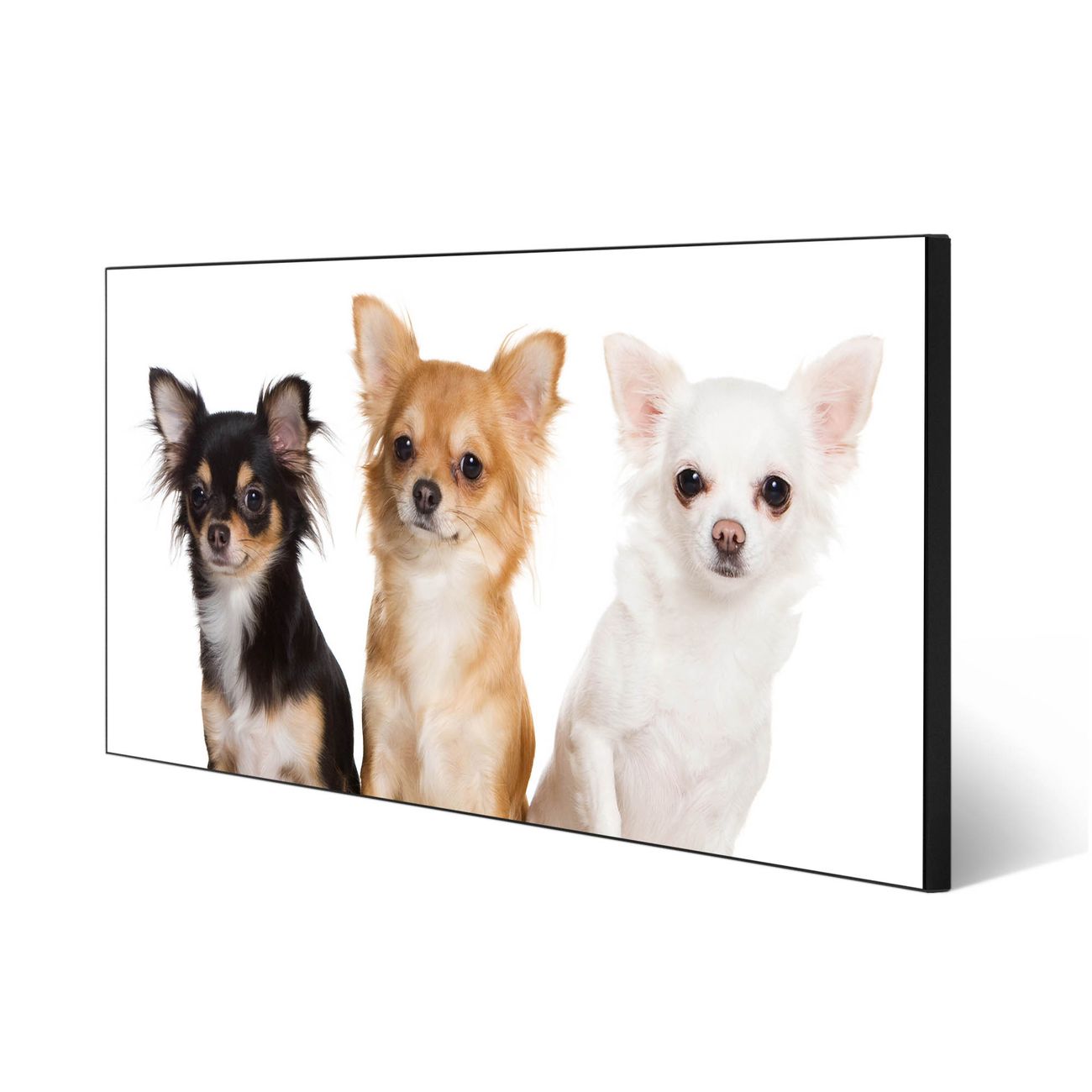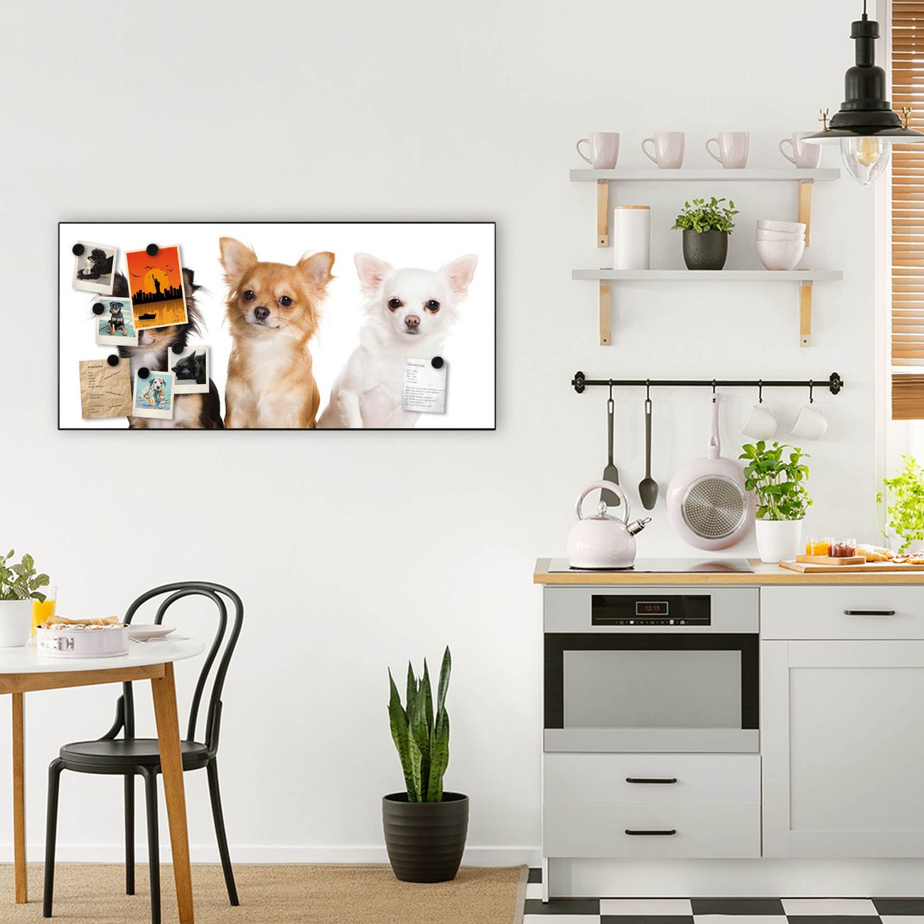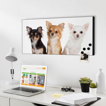 FUNKTION:  Die banjado Magnettafel mit Motiv Chihuahua Motiv bringt Ordnung in Ihr Zettelchaos. Fotos, Termine, Notizen oder Rezepte lassen Sich hier stilvoll mit Magneten ordnen, Sie behalten alles im Blick. An der Design Magnetwand halten alle handesüblichen Magnete. DESIGN:  Die Metall Pinnwand mit dem Motiv Motiv Chihuahua ist ein eleganter Begleiter im Alltag. Mit dieser Magnettafel haben Sie auch ohne Notizen und Magnete ein schönes Dekoelement. Das Format bietet Ihnen ausreichend Platz um alle wichtigen Informationen im Blick zu behalten. DETAILS: Die magnetische Pinnwand besteht aus silber-grau, weiß oder schwarz lackiertem Stahl. Sie hat eine Größe von 78cm x 37cm. Es befinden sich auf der Rückseite vorgefertigte Löcher die eine schnelle und unkomplizierte Anbringung ermöglichen. Das Motiv ist mit einem seidenmatten Laminat versehen und schützt so zusätzlich vor Kratzern. NUTZEN:  Sie können diese Magnettafel wunderbar als Wandbild nutzen, es halten alle handelsüblichen Magneten daran. Das Memoboard ist mit einem feuchten Lappen oder Schwamm abwischbar. Sie finden bei uns eine große Auswahl an passenden Magneten. BANJADO:  Wir sind ein kleines Team aus dem Herzen von Sachsen. Wir fertigen alle Artikel von Hand für Sie an, Sie erhalten keine preiswerte Importware. Auf Wunsch können Sie auch Ihr eigenes Foto auf die Magnettafel aufbringen, schreiben Sie uns an. Herzlichst, Ihr banjado-Team