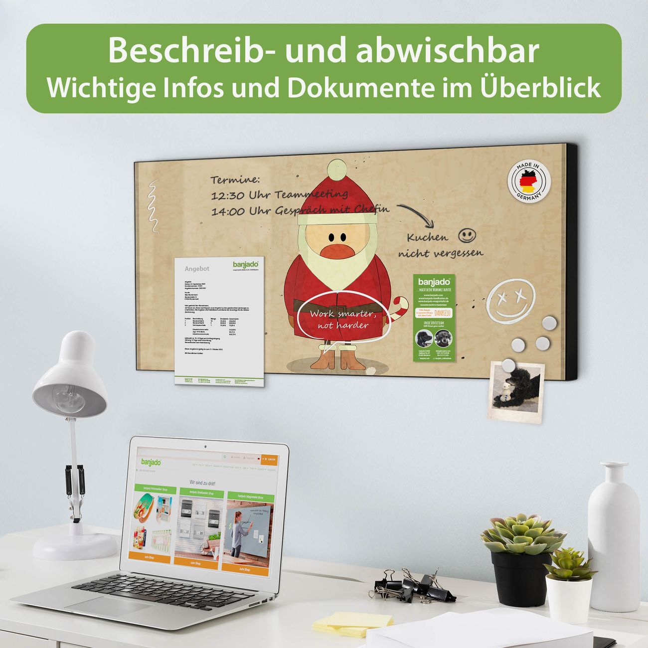 FUNKTION: Die banjado Magnettafel 78x37 cm im Design Motiv Cute Claus vereint Funktionalität und modernes Wohndesign auf stilvolle Weise. Diese hochwertige Magnetwand aus Metall hilft Ihnen dabei, Notizen, Fotos, Termine, Einkaufslisten oder Rezepte übersichtlich zu organisieren. Als praktisches Memoboard sorgt sie für Struktur im Alltag und setzt gleichzeitig einen dekorativen Akzent an Ihrer Wand. DESIGN: Die Metalltafel besteht aus robustem, lackiertem Stahl und ist mit allen handelsüblichen Magneten nutzbar. Besonders praktisch ist die beschreibbare Oberfläche. Sie können die Magnettafel ganz einfach mit Kreidestiften beschriften und die Inhalte bei Bedarf mit einem feuchten Tuch wieder entfernen. So eignet sich das Memoboard ideal für Wochenpläne, Menüpläne, To Do Listen oder kreative Botschaften. DETAILS: Mit ihrem großzügigen Querformat von 78x37 cm bietet die Magnettafel ausreichend Platz für Ihre Organisation. Das Motiv Motiv Cute Claus bringt eine warme, natürliche Optik in Küche, Flur, Büro oder Homeoffice und wirkt auch ohne Magnete oder Beschriftung wie ein modernes Wandbild. NUTZEN: Auf der Rückseite befinden sich vorgefertigte Löcher für eine schnelle und unkomplizierte Wandmontage. Jede banjado Magnettafel wird in Deutschland gefertigt und steht für Qualität, Langlebigkeit und liebevolle Verarbeitung. Dieses beschreibbare Memoboard ist die perfekte Kombination aus Metalltafel, Designobjekt und praktischer Magnetwand für Ihren Alltag. BANJADO: Wir sind ein kleines Team aus dem Herzen von Sachsen. Wir fertigen alle Artikel von Hand für Sie an, Sie erhalten keine preiswerte Importware. Auf Wunsch können Sie auch Ihr eigenes Foto auf die Magnettafel aufbringen, schreiben Sie uns an. Herzlichst, Ihr banjado-Team