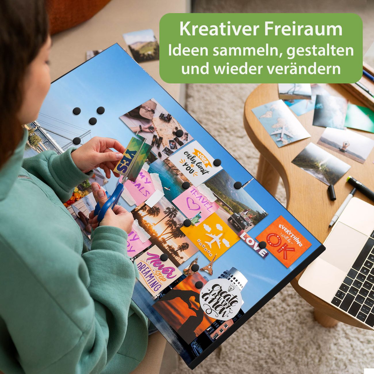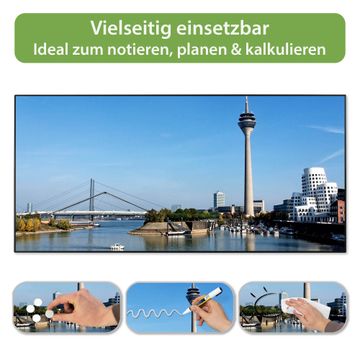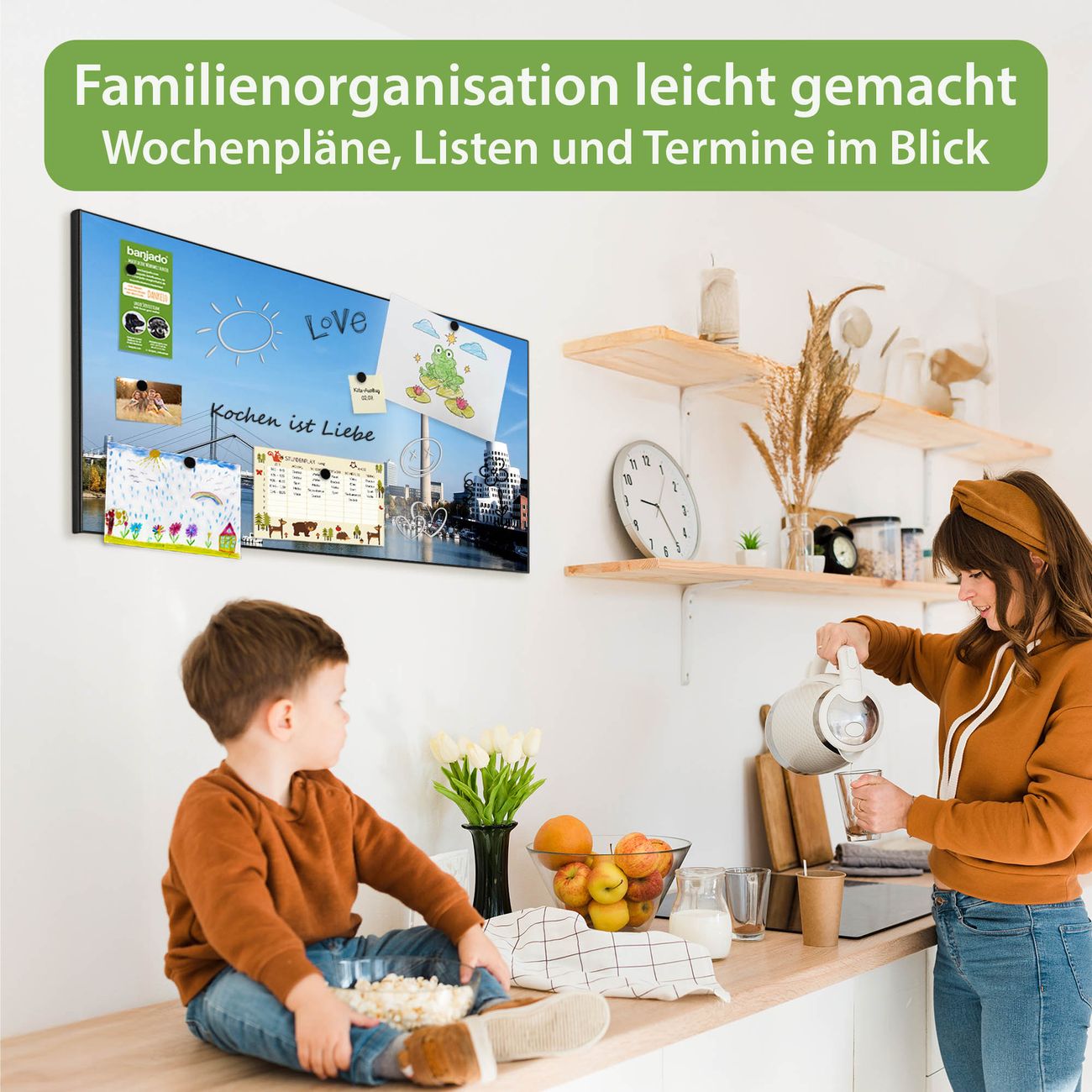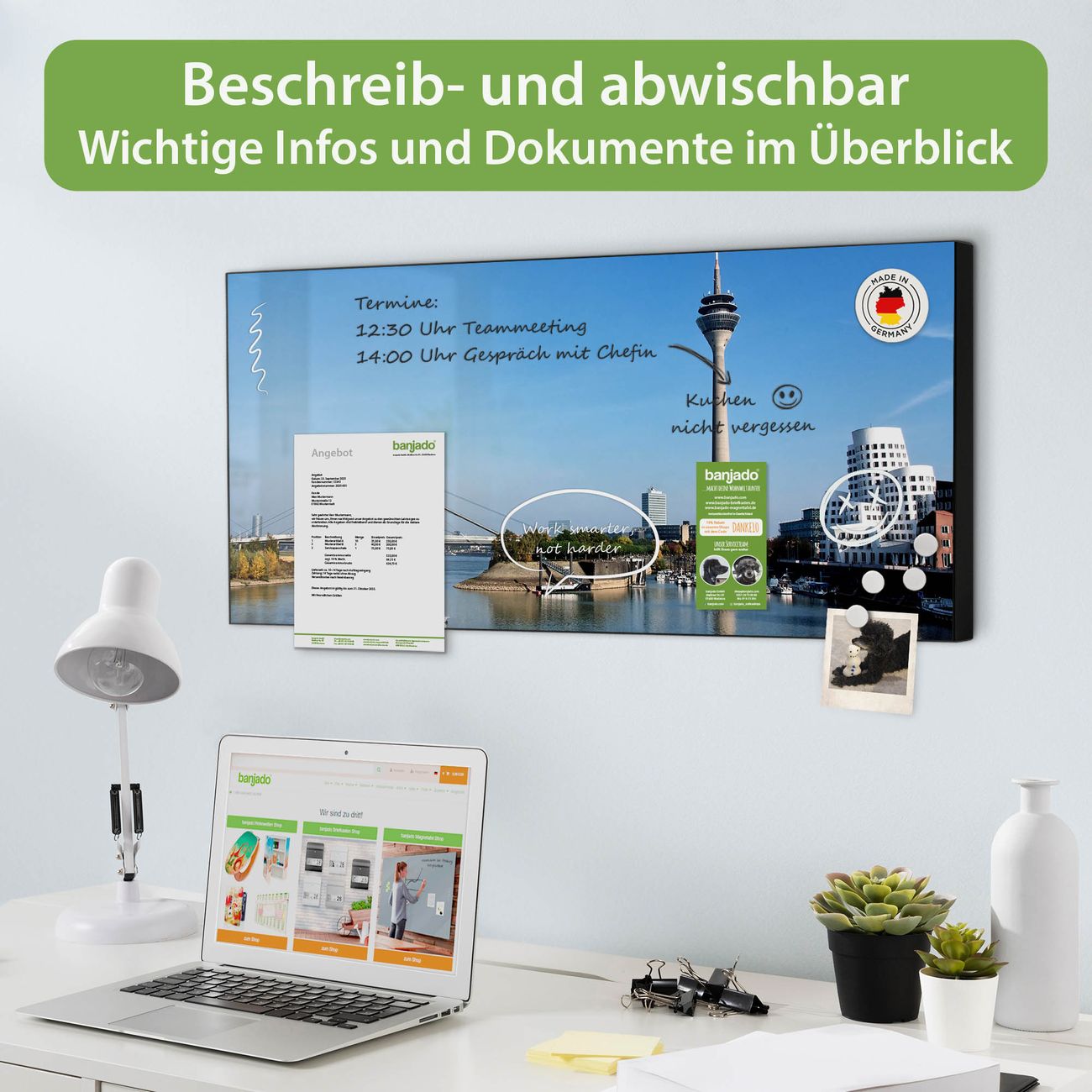 FUNKTION: Die banjado Magnettafel 78x37 cm im Design Motiv Düsseldorf vereint Funktionalität und modernes Wohndesign auf stilvolle Weise. Diese hochwertige Magnetwand aus Metall hilft Ihnen dabei, Notizen, Fotos, Termine, Einkaufslisten oder Rezepte übersichtlich zu organisieren. Als praktisches Memoboard sorgt sie für Struktur im Alltag und setzt gleichzeitig einen dekorativen Akzent an Ihrer Wand. DESIGN: Die Metalltafel besteht aus robustem, lackiertem Stahl und ist mit allen handelsüblichen Magneten nutzbar. Besonders praktisch ist die beschreibbare Oberfläche. Sie können die Magnettafel ganz einfach mit Kreidestiften beschriften und die Inhalte bei Bedarf mit einem feuchten Tuch wieder entfernen. So eignet sich das Memoboard ideal für Wochenpläne, Menüpläne, To Do Listen oder kreative Botschaften. DETAILS: Mit ihrem großzügigen Querformat von 78x37 cm bietet die Magnettafel ausreichend Platz für Ihre Organisation. Das Motiv Motiv Düsseldorf bringt eine warme, natürliche Optik in Küche, Flur, Büro oder Homeoffice und wirkt auch ohne Magnete oder Beschriftung wie ein modernes Wandbild. NUTZEN: Auf der Rückseite befinden sich vorgefertigte Löcher für eine schnelle und unkomplizierte Wandmontage. Jede banjado Magnettafel wird in Deutschland gefertigt und steht für Qualität, Langlebigkeit und liebevolle Verarbeitung. Dieses beschreibbare Memoboard ist die perfekte Kombination aus Metalltafel, Designobjekt und praktischer Magnetwand für Ihren Alltag. BANJADO: Wir sind ein kleines Team aus dem Herzen von Sachsen. Wir fertigen alle Artikel von Hand für Sie an, Sie erhalten keine preiswerte Importware. Auf Wunsch können Sie auch Ihr eigenes Foto auf die Magnettafel aufbringen, schreiben Sie uns an. Herzlichst, Ihr banjado-Team