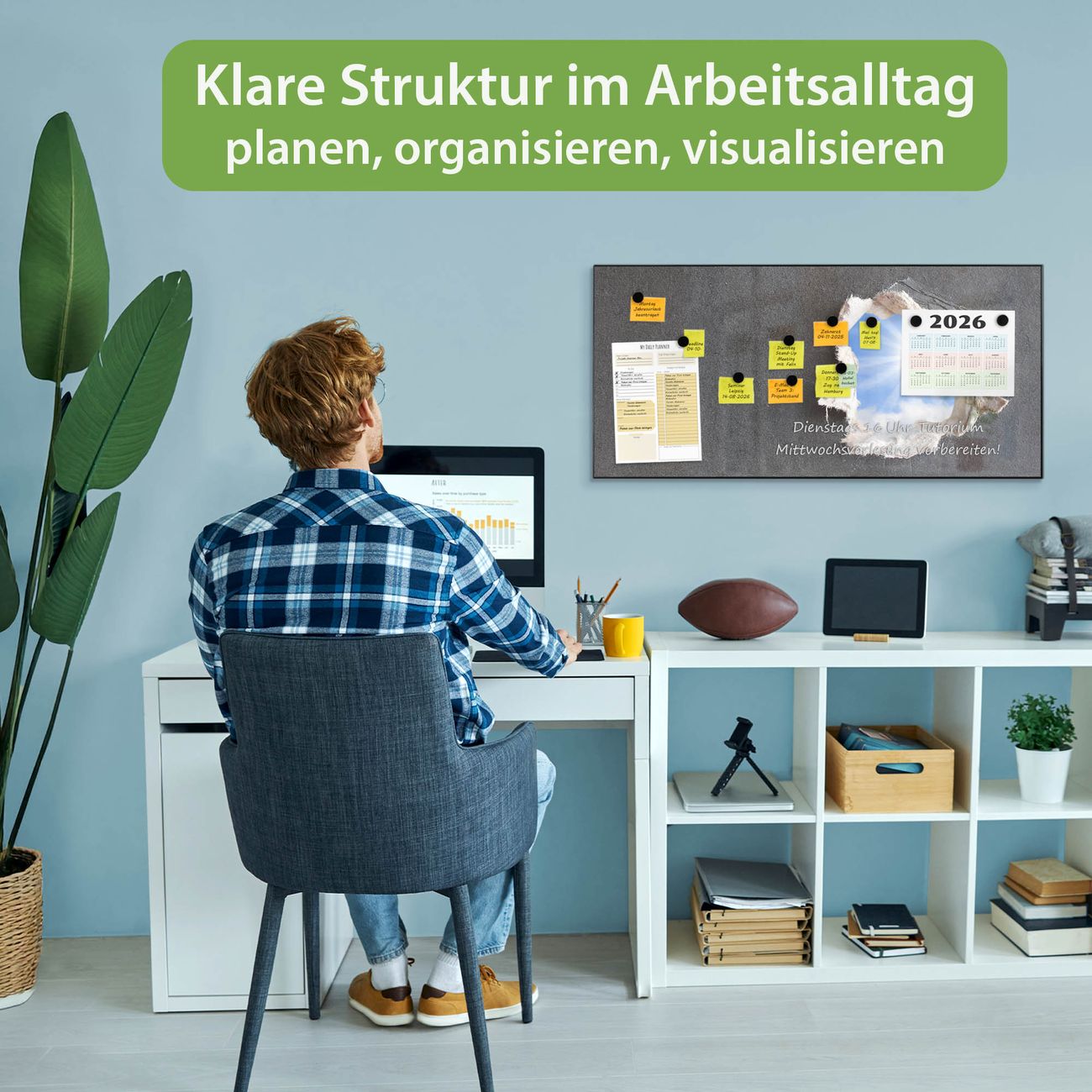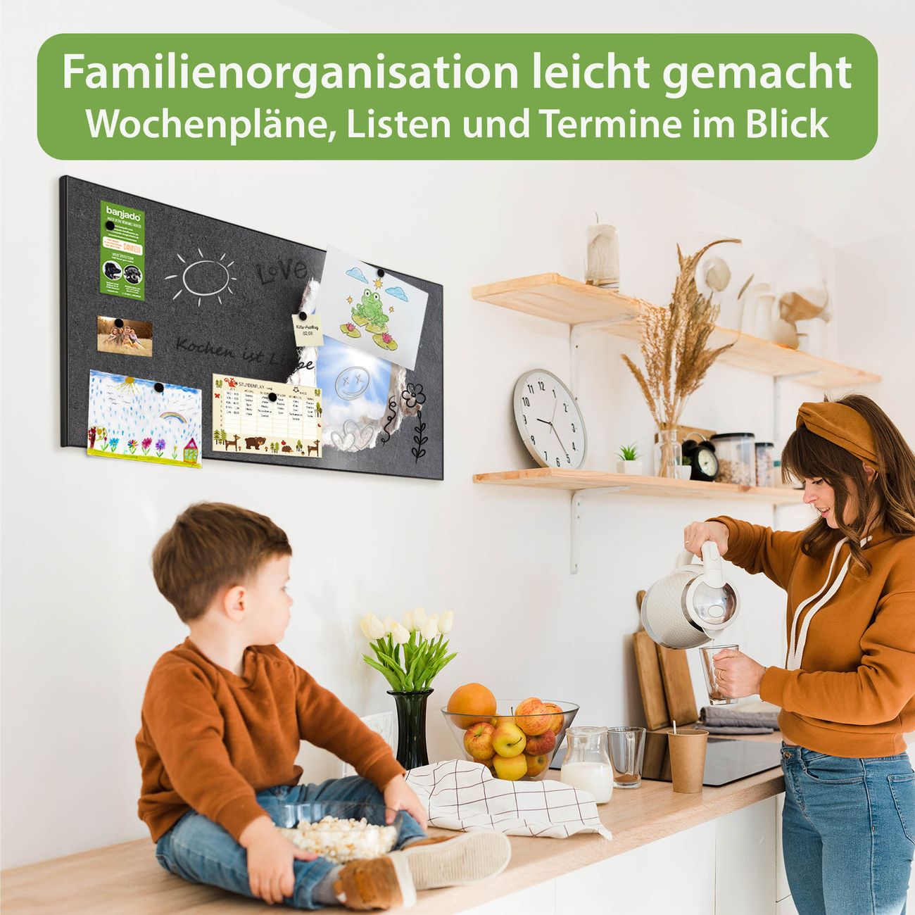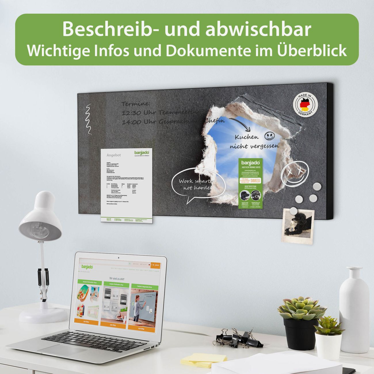 FUNKTION: Die banjado Magnettafel 78x37 cm im Design Motiv Durchblick vereint Funktionalität und modernes Wohndesign auf stilvolle Weise. Diese hochwertige Magnetwand aus Metall hilft Ihnen dabei, Notizen, Fotos, Termine, Einkaufslisten oder Rezepte übersichtlich zu organisieren. Als praktisches Memoboard sorgt sie für Struktur im Alltag und setzt gleichzeitig einen dekorativen Akzent an Ihrer Wand. DESIGN: Die Metalltafel besteht aus robustem, lackiertem Stahl und ist mit allen handelsüblichen Magneten nutzbar. Besonders praktisch ist die beschreibbare Oberfläche. Sie können die Magnettafel ganz einfach mit Kreidestiften beschriften und die Inhalte bei Bedarf mit einem feuchten Tuch wieder entfernen. So eignet sich das Memoboard ideal für Wochenpläne, Menüpläne, To Do Listen oder kreative Botschaften. DETAILS: Mit ihrem großzügigen Querformat von 78x37 cm bietet die Magnettafel ausreichend Platz für Ihre Organisation. Das Motiv Motiv Durchblick bringt eine warme, natürliche Optik in Küche, Flur, Büro oder Homeoffice und wirkt auch ohne Magnete oder Beschriftung wie ein modernes Wandbild. NUTZEN: Auf der Rückseite befinden sich vorgefertigte Löcher für eine schnelle und unkomplizierte Wandmontage. Jede banjado Magnettafel wird in Deutschland gefertigt und steht für Qualität, Langlebigkeit und liebevolle Verarbeitung. Dieses beschreibbare Memoboard ist die perfekte Kombination aus Metalltafel, Designobjekt und praktischer Magnetwand für Ihren Alltag. BANJADO: Wir sind ein kleines Team aus dem Herzen von Sachsen. Wir fertigen alle Artikel von Hand für Sie an, Sie erhalten keine preiswerte Importware. Auf Wunsch können Sie auch Ihr eigenes Foto auf die Magnettafel aufbringen, schreiben Sie uns an. Herzlichst, Ihr banjado-Team