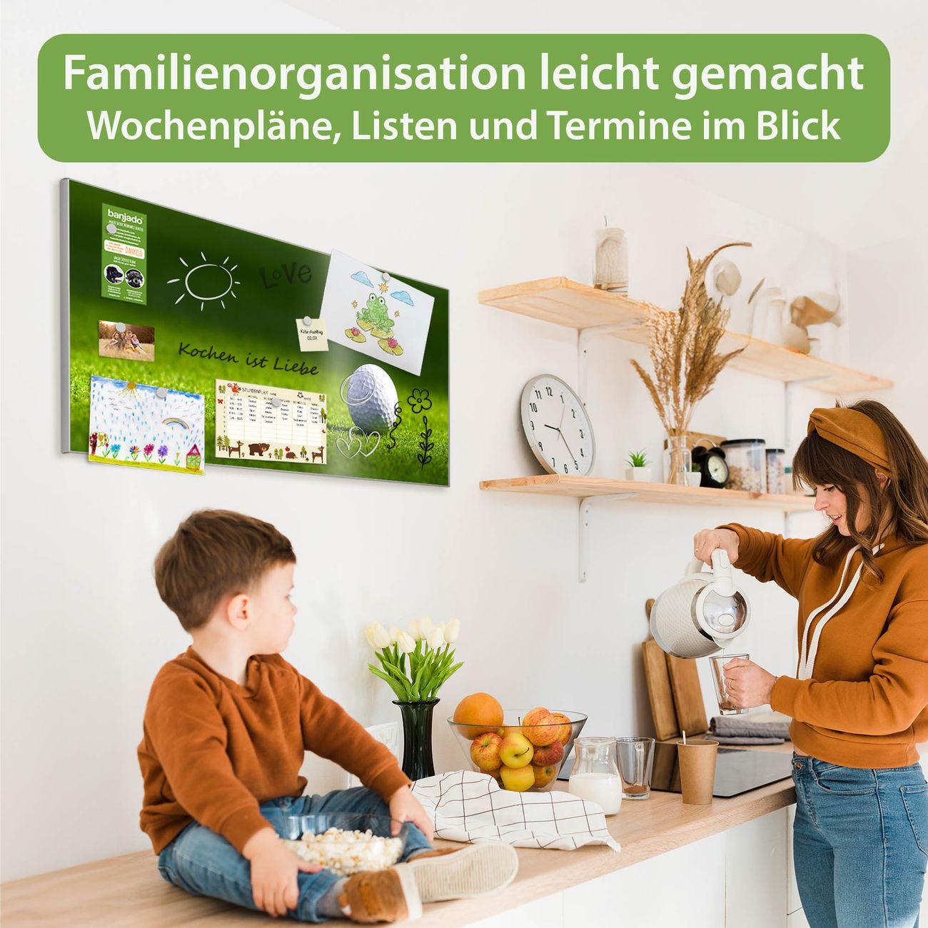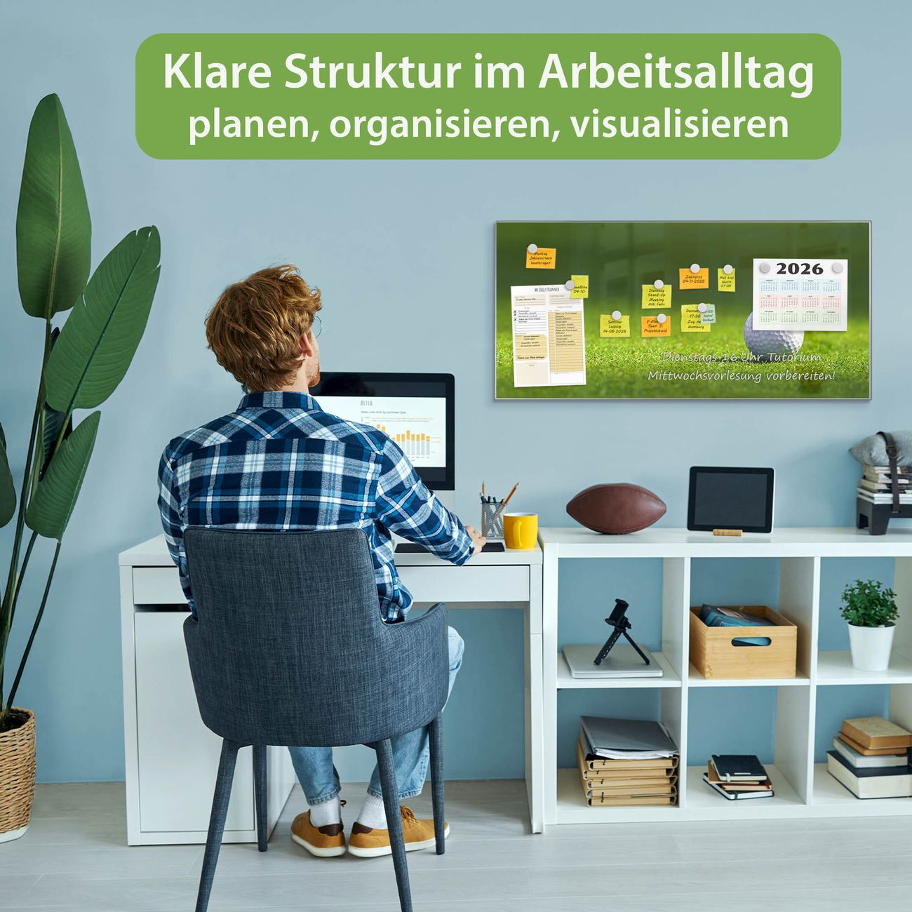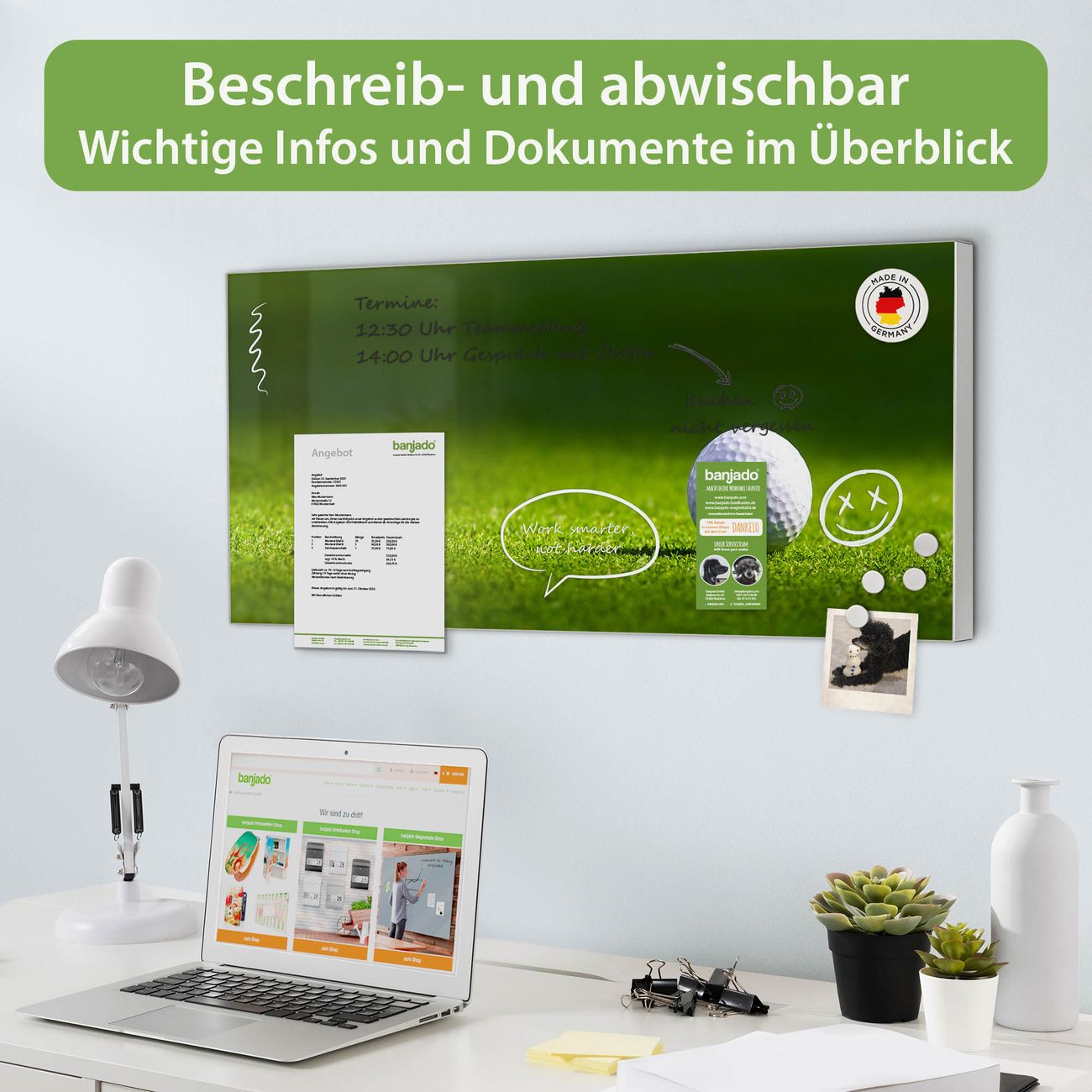 FUNKTION: Die banjado Magnettafel 78x37 cm im Design Motiv Einsamer Golfball vereint Funktionalität und modernes Wohndesign auf stilvolle Weise. Diese hochwertige Magnetwand aus Metall hilft Ihnen dabei, Notizen, Fotos, Termine, Einkaufslisten oder Rezepte übersichtlich zu organisieren. Als praktisches Memoboard sorgt sie für Struktur im Alltag und setzt gleichzeitig einen dekorativen Akzent an Ihrer Wand. DESIGN: Die Metalltafel besteht aus robustem, lackiertem Stahl und ist mit allen handelsüblichen Magneten nutzbar. Besonders praktisch ist die beschreibbare Oberfläche. Sie können die Magnettafel ganz einfach mit Kreidestiften beschriften und die Inhalte bei Bedarf mit einem feuchten Tuch wieder entfernen. So eignet sich das Memoboard ideal für Wochenpläne, Menüpläne, To Do Listen oder kreative Botschaften. DETAILS: Mit ihrem großzügigen Querformat von 78x37 cm bietet die Magnettafel ausreichend Platz für Ihre Organisation. Das Motiv Motiv Einsamer Golfball bringt eine warme, natürliche Optik in Küche, Flur, Büro oder Homeoffice und wirkt auch ohne Magnete oder Beschriftung wie ein modernes Wandbild. NUTZEN: Auf der Rückseite befinden sich vorgefertigte Löcher für eine schnelle und unkomplizierte Wandmontage. Jede banjado Magnettafel wird in Deutschland gefertigt und steht für Qualität, Langlebigkeit und liebevolle Verarbeitung. Dieses beschreibbare Memoboard ist die perfekte Kombination aus Metalltafel, Designobjekt und praktischer Magnetwand für Ihren Alltag. BANJADO: Wir sind ein kleines Team aus dem Herzen von Sachsen. Wir fertigen alle Artikel von Hand für Sie an, Sie erhalten keine preiswerte Importware. Auf Wunsch können Sie auch Ihr eigenes Foto auf die Magnettafel aufbringen, schreiben Sie uns an. Herzlichst, Ihr banjado-Team