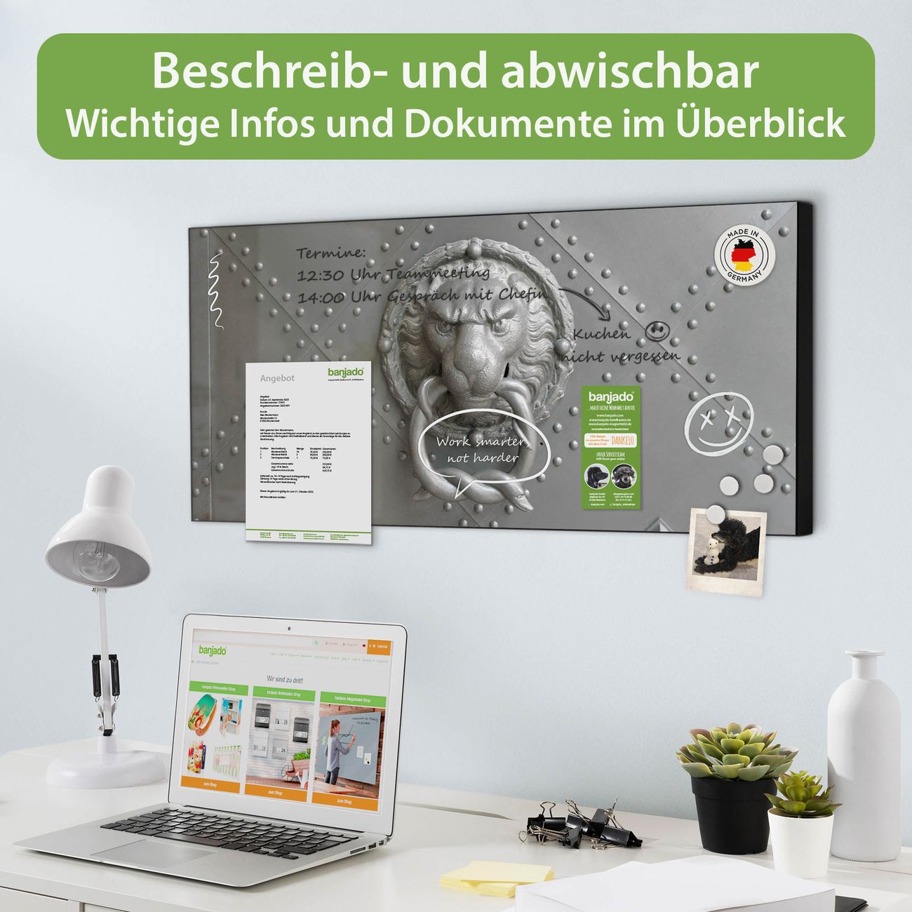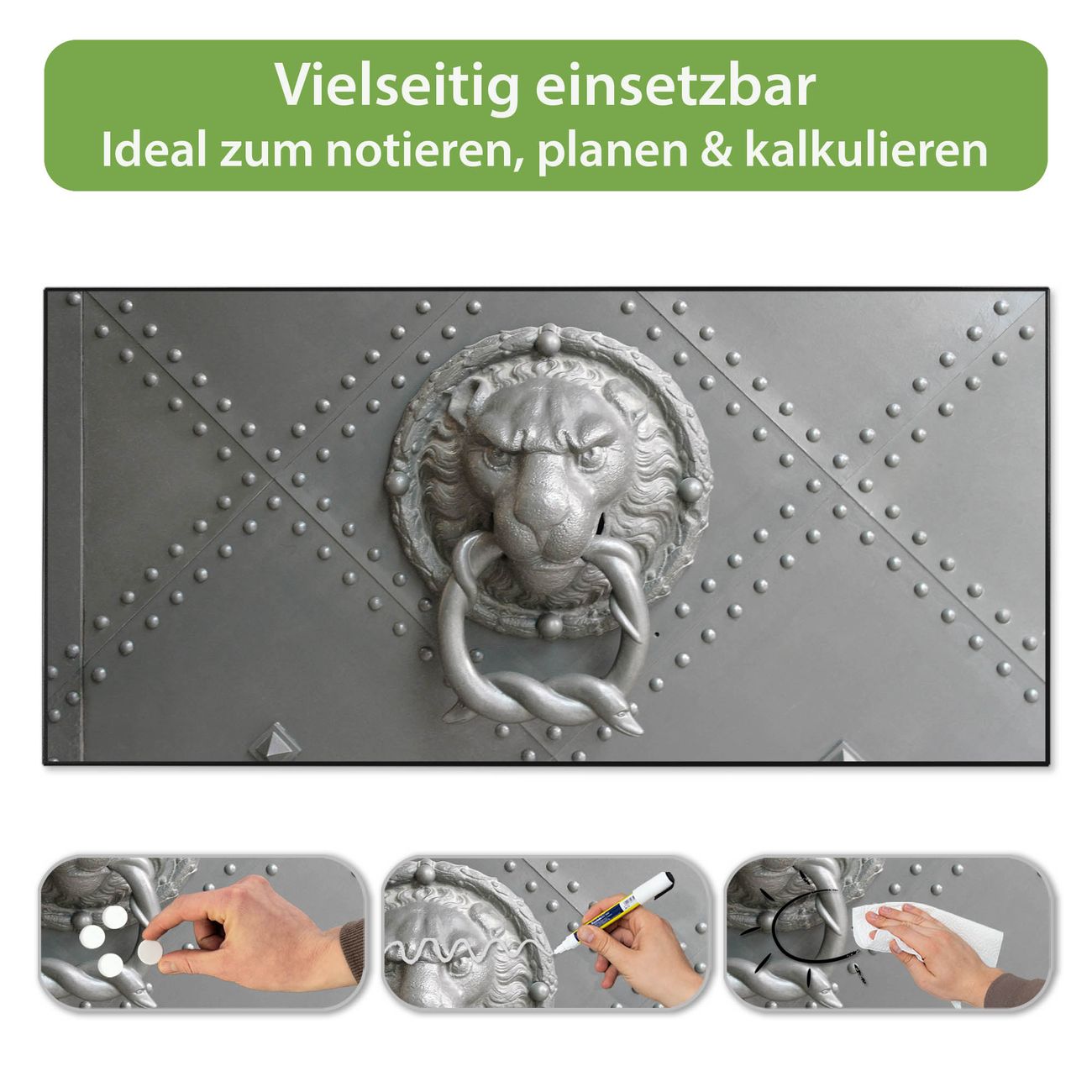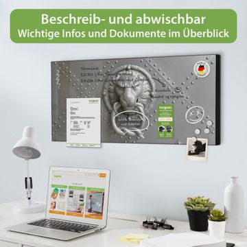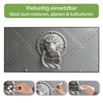 FUNKTION: Die banjado Magnettafel 78x37 cm im Design Motiv Eisentor vereint Funktionalität und modernes Wohndesign auf stilvolle Weise. Diese hochwertige Magnetwand aus Metall hilft Ihnen dabei, Notizen, Fotos, Termine, Einkaufslisten oder Rezepte übersichtlich zu organisieren. Als praktisches Memoboard sorgt sie für Struktur im Alltag und setzt gleichzeitig einen dekorativen Akzent an Ihrer Wand. DESIGN: Die Metalltafel besteht aus robustem, lackiertem Stahl und ist mit allen handelsüblichen Magneten nutzbar. Besonders praktisch ist die beschreibbare Oberfläche. Sie können die Magnettafel ganz einfach mit Kreidestiften beschriften und die Inhalte bei Bedarf mit einem feuchten Tuch wieder entfernen. So eignet sich das Memoboard ideal für Wochenpläne, Menüpläne, To Do Listen oder kreative Botschaften. DETAILS: Mit ihrem großzügigen Querformat von 78x37 cm bietet die Magnettafel ausreichend Platz für Ihre Organisation. Das Motiv Motiv Eisentor bringt eine warme, natürliche Optik in Küche, Flur, Büro oder Homeoffice und wirkt auch ohne Magnete oder Beschriftung wie ein modernes Wandbild. NUTZEN: Auf der Rückseite befinden sich vorgefertigte Löcher für eine schnelle und unkomplizierte Wandmontage. Jede banjado Magnettafel wird in Deutschland gefertigt und steht für Qualität, Langlebigkeit und liebevolle Verarbeitung. Dieses beschreibbare Memoboard ist die perfekte Kombination aus Metalltafel, Designobjekt und praktischer Magnetwand für Ihren Alltag. BANJADO: Wir sind ein kleines Team aus dem Herzen von Sachsen. Wir fertigen alle Artikel von Hand für Sie an, Sie erhalten keine preiswerte Importware. Auf Wunsch können Sie auch Ihr eigenes Foto auf die Magnettafel aufbringen, schreiben Sie uns an. Herzlichst, Ihr banjado-Team