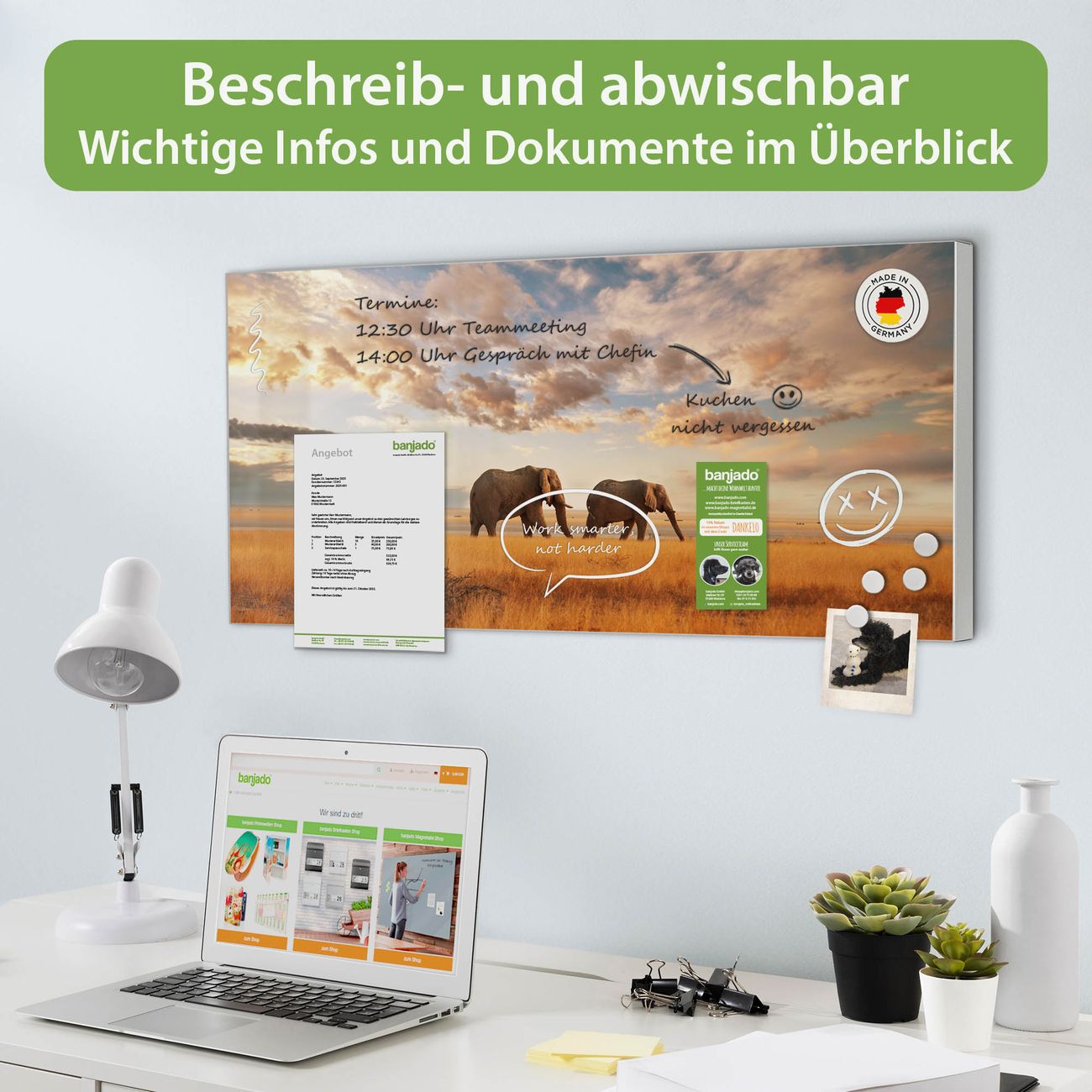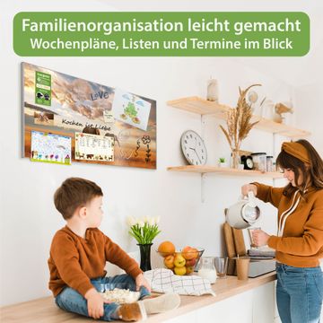 FUNKTION: Die banjado Magnettafel 78x37 cm im Design Motiv Elefanten vereint Funktionalität und modernes Wohndesign auf stilvolle Weise. Diese hochwertige Magnetwand aus Metall hilft Ihnen dabei, Notizen, Fotos, Termine, Einkaufslisten oder Rezepte übersichtlich zu organisieren. Als praktisches Memoboard sorgt sie für Struktur im Alltag und setzt gleichzeitig einen dekorativen Akzent an Ihrer Wand. DESIGN: Die Metalltafel besteht aus robustem, lackiertem Stahl und ist mit allen handelsüblichen Magneten nutzbar. Besonders praktisch ist die beschreibbare Oberfläche. Sie können die Magnettafel ganz einfach mit Kreidestiften beschriften und die Inhalte bei Bedarf mit einem feuchten Tuch wieder entfernen. So eignet sich das Memoboard ideal für Wochenpläne, Menüpläne, To Do Listen oder kreative Botschaften. DETAILS: Mit ihrem großzügigen Querformat von 78x37 cm bietet die Magnettafel ausreichend Platz für Ihre Organisation. Das Motiv Motiv Elefanten bringt eine warme, natürliche Optik in Küche, Flur, Büro oder Homeoffice und wirkt auch ohne Magnete oder Beschriftung wie ein modernes Wandbild. NUTZEN: Auf der Rückseite befinden sich vorgefertigte Löcher für eine schnelle und unkomplizierte Wandmontage. Jede banjado Magnettafel wird in Deutschland gefertigt und steht für Qualität, Langlebigkeit und liebevolle Verarbeitung. Dieses beschreibbare Memoboard ist die perfekte Kombination aus Metalltafel, Designobjekt und praktischer Magnetwand für Ihren Alltag. BANJADO: Wir sind ein kleines Team aus dem Herzen von Sachsen. Wir fertigen alle Artikel von Hand für Sie an, Sie erhalten keine preiswerte Importware. Auf Wunsch können Sie auch Ihr eigenes Foto auf die Magnettafel aufbringen, schreiben Sie uns an. Herzlichst, Ihr banjado-Team