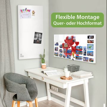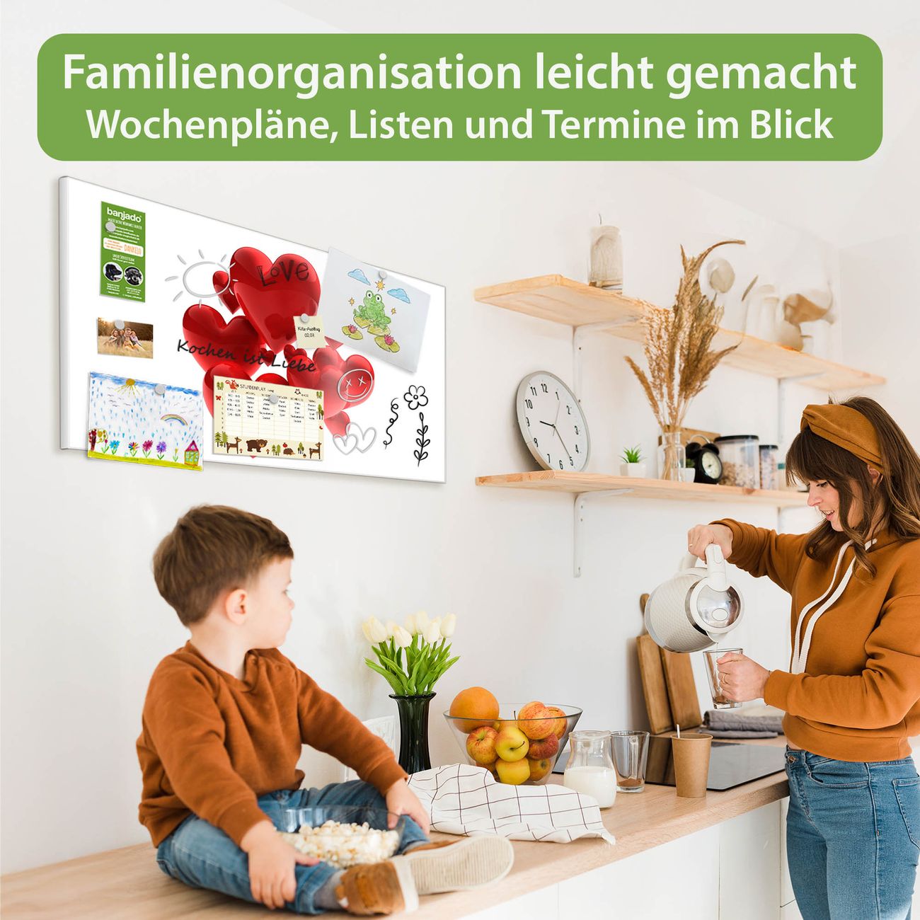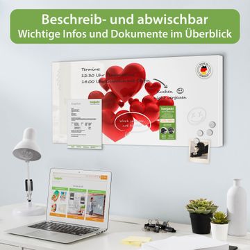 FUNKTION: Die banjado Magnettafel 78x37 cm im Design Motiv Fliegende Herzen vereint Funktionalität und modernes Wohndesign auf stilvolle Weise. Diese hochwertige Magnetwand aus Metall hilft Ihnen dabei, Notizen, Fotos, Termine, Einkaufslisten oder Rezepte übersichtlich zu organisieren. Als praktisches Memoboard sorgt sie für Struktur im Alltag und setzt gleichzeitig einen dekorativen Akzent an Ihrer Wand. DESIGN: Die Metalltafel besteht aus robustem, lackiertem Stahl und ist mit allen handelsüblichen Magneten nutzbar. Besonders praktisch ist die beschreibbare Oberfläche. Sie können die Magnettafel ganz einfach mit Kreidestiften beschriften und die Inhalte bei Bedarf mit einem feuchten Tuch wieder entfernen. So eignet sich das Memoboard ideal für Wochenpläne, Menüpläne, To Do Listen oder kreative Botschaften. DETAILS: Mit ihrem großzügigen Querformat von 78x37 cm bietet die Magnettafel ausreichend Platz für Ihre Organisation. Das Motiv Motiv Fliegende Herzen bringt eine warme, natürliche Optik in Küche, Flur, Büro oder Homeoffice und wirkt auch ohne Magnete oder Beschriftung wie ein modernes Wandbild. NUTZEN: Auf der Rückseite befinden sich vorgefertigte Löcher für eine schnelle und unkomplizierte Wandmontage. Jede banjado Magnettafel wird in Deutschland gefertigt und steht für Qualität, Langlebigkeit und liebevolle Verarbeitung. Dieses beschreibbare Memoboard ist die perfekte Kombination aus Metalltafel, Designobjekt und praktischer Magnetwand für Ihren Alltag. BANJADO: Wir sind ein kleines Team aus dem Herzen von Sachsen. Wir fertigen alle Artikel von Hand für Sie an, Sie erhalten keine preiswerte Importware. Auf Wunsch können Sie auch Ihr eigenes Foto auf die Magnettafel aufbringen, schreiben Sie uns an. Herzlichst, Ihr banjado-Team