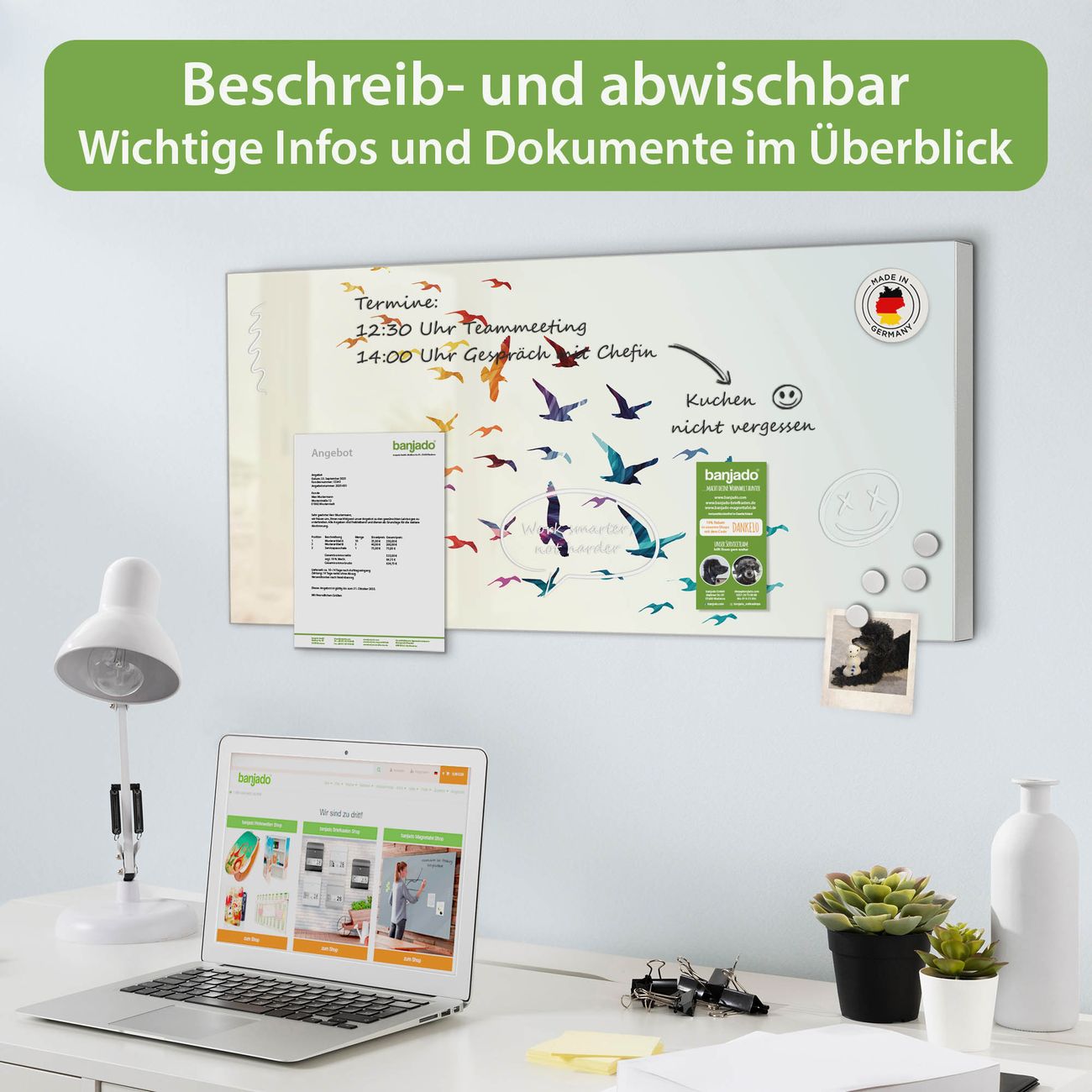 FUNKTION: Die banjado Magnettafel 78x37 cm im Design Motiv Fliegende Vögel vereint Funktionalität und modernes Wohndesign auf stilvolle Weise. Diese hochwertige Magnetwand aus Metall hilft Ihnen dabei, Notizen, Fotos, Termine, Einkaufslisten oder Rezepte übersichtlich zu organisieren. Als praktisches Memoboard sorgt sie für Struktur im Alltag und setzt gleichzeitig einen dekorativen Akzent an Ihrer Wand. DESIGN: Die Metalltafel besteht aus robustem, lackiertem Stahl und ist mit allen handelsüblichen Magneten nutzbar. Besonders praktisch ist die beschreibbare Oberfläche. Sie können die Magnettafel ganz einfach mit Kreidestiften beschriften und die Inhalte bei Bedarf mit einem feuchten Tuch wieder entfernen. So eignet sich das Memoboard ideal für Wochenpläne, Menüpläne, To Do Listen oder kreative Botschaften. DETAILS: Mit ihrem großzügigen Querformat von 78x37 cm bietet die Magnettafel ausreichend Platz für Ihre Organisation. Das Motiv Motiv Fliegende Vögel bringt eine warme, natürliche Optik in Küche, Flur, Büro oder Homeoffice und wirkt auch ohne Magnete oder Beschriftung wie ein modernes Wandbild. NUTZEN: Auf der Rückseite befinden sich vorgefertigte Löcher für eine schnelle und unkomplizierte Wandmontage. Jede banjado Magnettafel wird in Deutschland gefertigt und steht für Qualität, Langlebigkeit und liebevolle Verarbeitung. Dieses beschreibbare Memoboard ist die perfekte Kombination aus Metalltafel, Designobjekt und praktischer Magnetwand für Ihren Alltag. BANJADO: Wir sind ein kleines Team aus dem Herzen von Sachsen. Wir fertigen alle Artikel von Hand für Sie an, Sie erhalten keine preiswerte Importware. Auf Wunsch können Sie auch Ihr eigenes Foto auf die Magnettafel aufbringen, schreiben Sie uns an. Herzlichst, Ihr banjado-Team