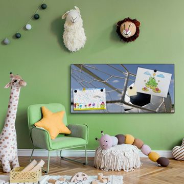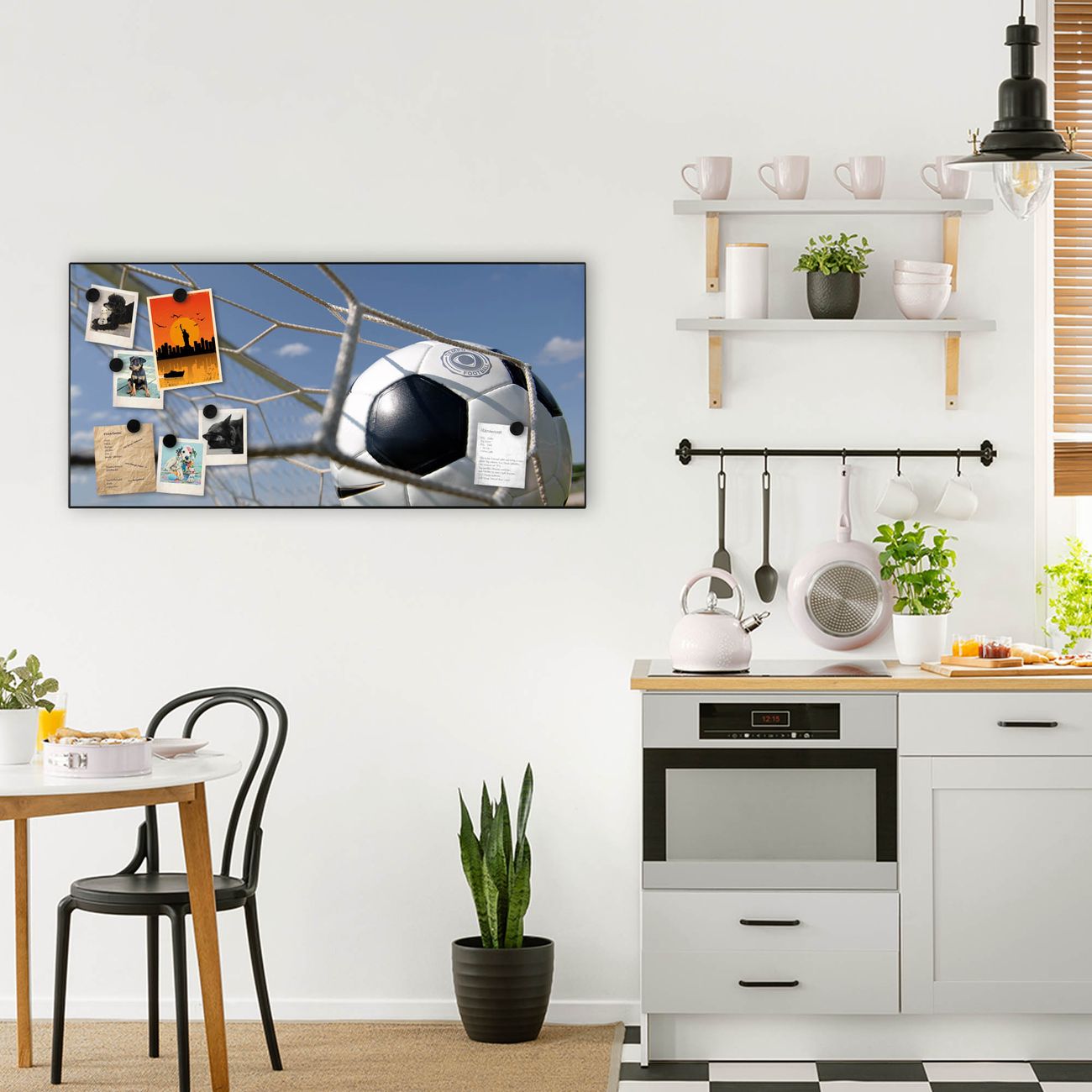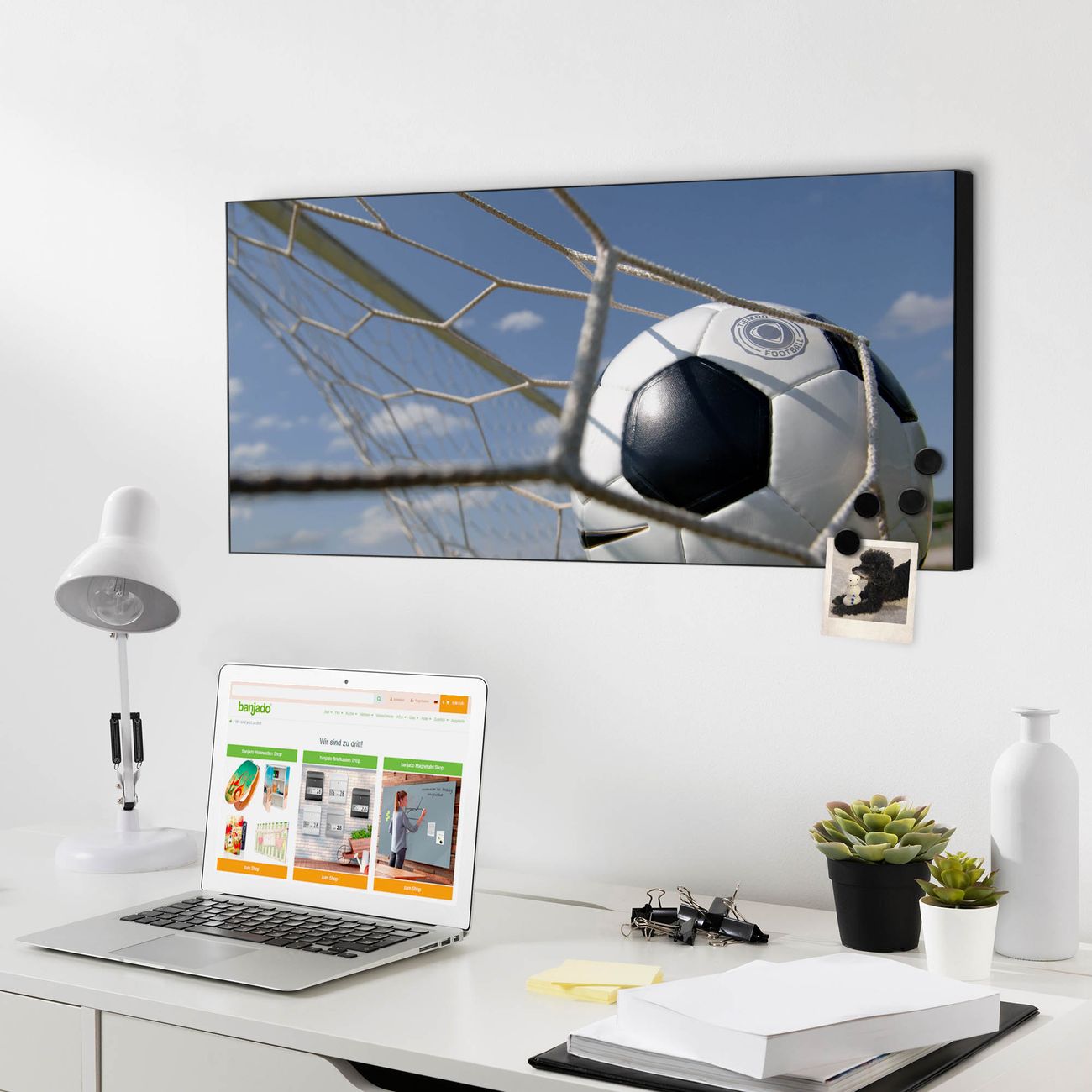 FUNKTION:  Die banjado Magnettafel mit Motiv Fußball Motiv bringt Ordnung in Ihr Zettelchaos. Fotos, Termine, Notizen oder Rezepte lassen Sich hier stilvoll mit Magneten ordnen, Sie behalten alles im Blick. An der Design Magnetwand halten alle handesüblichen Magnete. DESIGN:  Die Metall Pinnwand mit dem Motiv Motiv Fußball ist ein eleganter Begleiter im Alltag. Mit dieser Magnettafel haben Sie auch ohne Notizen und Magnete ein schönes Dekoelement. Das Format bietet Ihnen ausreichend Platz um alle wichtigen Informationen im Blick zu behalten. DETAILS: Die magnetische Pinnwand besteht aus silber-grau, weiß oder schwarz lackiertem Stahl. Sie hat eine Größe von 78cm x 37cm. Es befinden sich auf der Rückseite vorgefertigte Löcher die eine schnelle und unkomplizierte Anbringung ermöglichen. Das Motiv ist mit einem seidenmatten Laminat versehen und schützt so zusätzlich vor Kratzern. NUTZEN:  Sie können diese Magnettafel wunderbar als Wandbild nutzen, es halten alle handelsüblichen Magneten daran. Das Memoboard ist mit einem feuchten Lappen oder Schwamm abwischbar. Sie finden bei uns eine große Auswahl an passenden Magneten. BANJADO:  Wir sind ein kleines Team aus dem Herzen von Sachsen. Wir fertigen alle Artikel von Hand für Sie an, Sie erhalten keine preiswerte Importware. Auf Wunsch können Sie auch Ihr eigenes Foto auf die Magnettafel aufbringen, schreiben Sie uns an. Herzlichst, Ihr banjado-Team