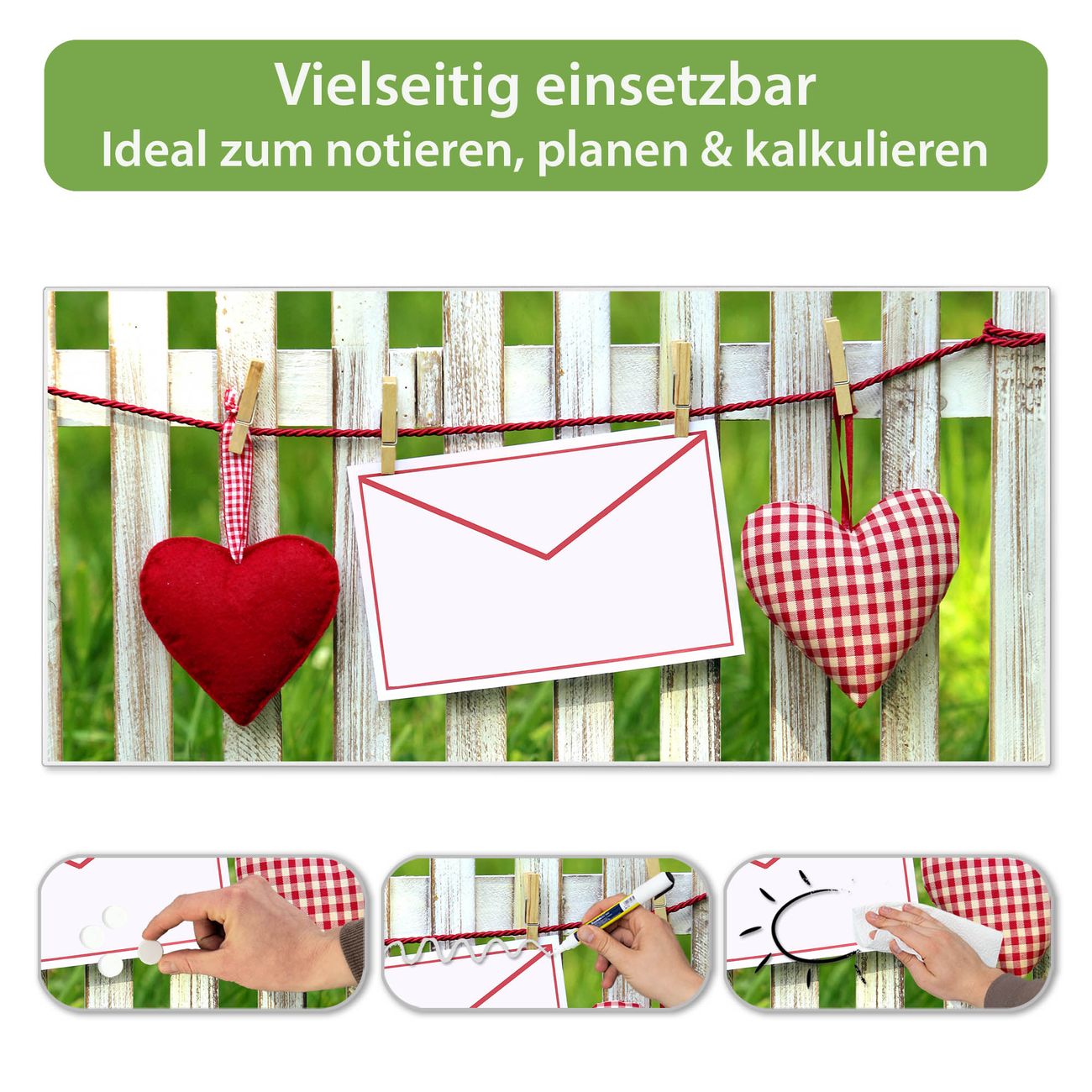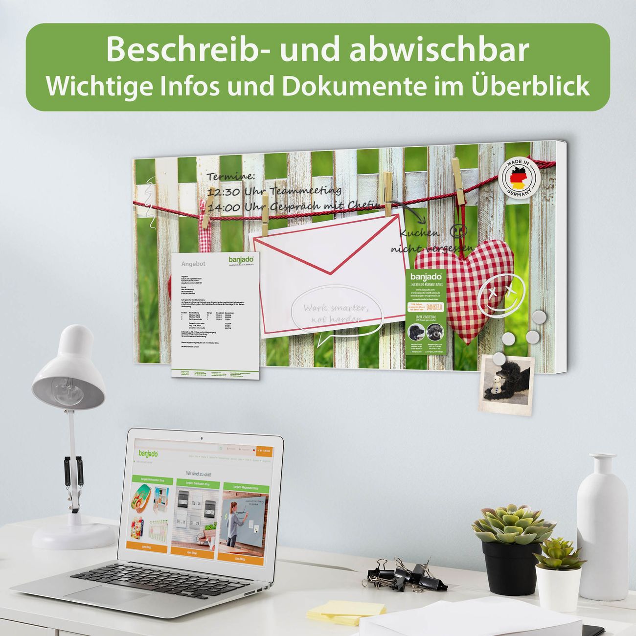 FUNKTION: Die banjado Magnettafel 78x37 cm im Design Motiv Gartenzaun vereint Funktionalität und modernes Wohndesign auf stilvolle Weise. Diese hochwertige Magnetwand aus Metall hilft Ihnen dabei, Notizen, Fotos, Termine, Einkaufslisten oder Rezepte übersichtlich zu organisieren. Als praktisches Memoboard sorgt sie für Struktur im Alltag und setzt gleichzeitig einen dekorativen Akzent an Ihrer Wand. DESIGN: Die Metalltafel besteht aus robustem, lackiertem Stahl und ist mit allen handelsüblichen Magneten nutzbar. Besonders praktisch ist die beschreibbare Oberfläche. Sie können die Magnettafel ganz einfach mit Kreidestiften beschriften und die Inhalte bei Bedarf mit einem feuchten Tuch wieder entfernen. So eignet sich das Memoboard ideal für Wochenpläne, Menüpläne, To Do Listen oder kreative Botschaften. DETAILS: Mit ihrem großzügigen Querformat von 78x37 cm bietet die Magnettafel ausreichend Platz für Ihre Organisation. Das Motiv Motiv Gartenzaun bringt eine warme, natürliche Optik in Küche, Flur, Büro oder Homeoffice und wirkt auch ohne Magnete oder Beschriftung wie ein modernes Wandbild. NUTZEN: Auf der Rückseite befinden sich vorgefertigte Löcher für eine schnelle und unkomplizierte Wandmontage. Jede banjado Magnettafel wird in Deutschland gefertigt und steht für Qualität, Langlebigkeit und liebevolle Verarbeitung. Dieses beschreibbare Memoboard ist die perfekte Kombination aus Metalltafel, Designobjekt und praktischer Magnetwand für Ihren Alltag. BANJADO: Wir sind ein kleines Team aus dem Herzen von Sachsen. Wir fertigen alle Artikel von Hand für Sie an, Sie erhalten keine preiswerte Importware. Auf Wunsch können Sie auch Ihr eigenes Foto auf die Magnettafel aufbringen, schreiben Sie uns an. Herzlichst, Ihr banjado-Team
