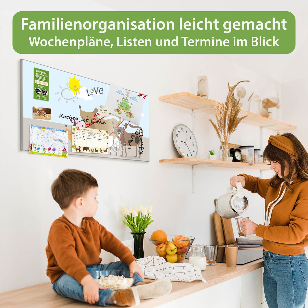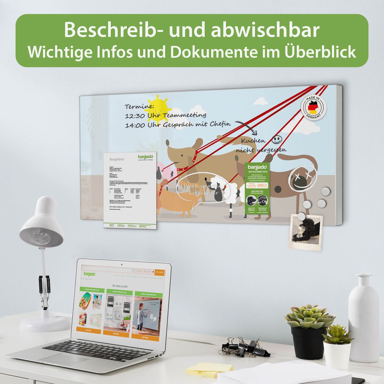 FUNKTION: Die banjado Magnettafel 78x37 cm im Design Motiv Gassi Gehen vereint Funktionalität und modernes Wohndesign auf stilvolle Weise. Diese hochwertige Magnetwand aus Metall hilft Ihnen dabei, Notizen, Fotos, Termine, Einkaufslisten oder Rezepte übersichtlich zu organisieren. Als praktisches Memoboard sorgt sie für Struktur im Alltag und setzt gleichzeitig einen dekorativen Akzent an Ihrer Wand. DESIGN: Die Metalltafel besteht aus robustem, lackiertem Stahl und ist mit allen handelsüblichen Magneten nutzbar. Besonders praktisch ist die beschreibbare Oberfläche. Sie können die Magnettafel ganz einfach mit Kreidestiften beschriften und die Inhalte bei Bedarf mit einem feuchten Tuch wieder entfernen. So eignet sich das Memoboard ideal für Wochenpläne, Menüpläne, To Do Listen oder kreative Botschaften. DETAILS: Mit ihrem großzügigen Querformat von 78x37 cm bietet die Magnettafel ausreichend Platz für Ihre Organisation. Das Motiv Motiv Gassi Gehen bringt eine warme, natürliche Optik in Küche, Flur, Büro oder Homeoffice und wirkt auch ohne Magnete oder Beschriftung wie ein modernes Wandbild. NUTZEN: Auf der Rückseite befinden sich vorgefertigte Löcher für eine schnelle und unkomplizierte Wandmontage. Jede banjado Magnettafel wird in Deutschland gefertigt und steht für Qualität, Langlebigkeit und liebevolle Verarbeitung. Dieses beschreibbare Memoboard ist die perfekte Kombination aus Metalltafel, Designobjekt und praktischer Magnetwand für Ihren Alltag. BANJADO: Wir sind ein kleines Team aus dem Herzen von Sachsen. Wir fertigen alle Artikel von Hand für Sie an, Sie erhalten keine preiswerte Importware. Auf Wunsch können Sie auch Ihr eigenes Foto auf die Magnettafel aufbringen, schreiben Sie uns an. Herzlichst, Ihr banjado-Team
