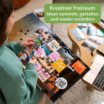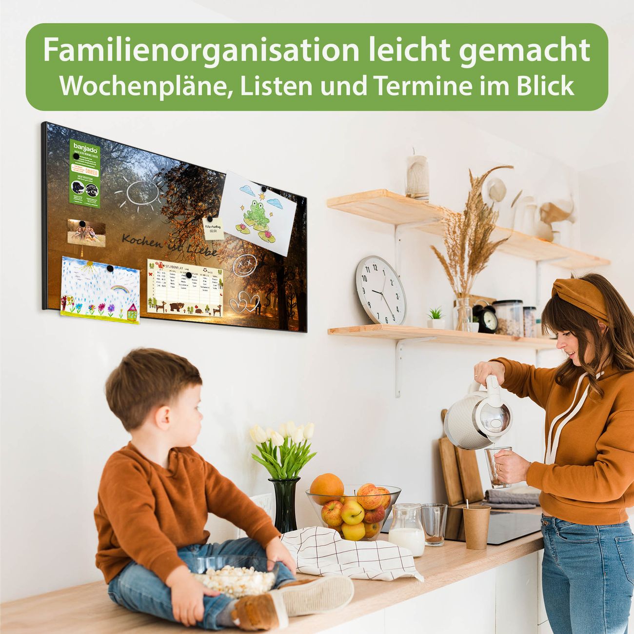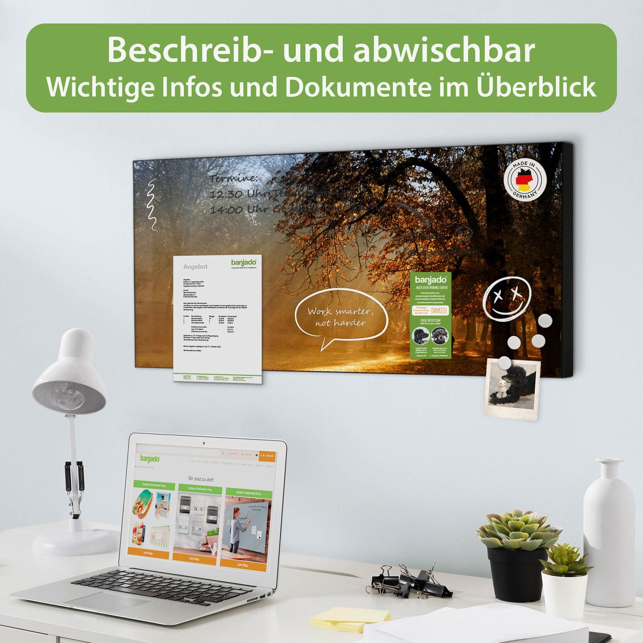 FUNKTION: Die banjado Magnettafel 78x37 cm im Design Motiv Goldener Herbst vereint Funktionalität und modernes Wohndesign auf stilvolle Weise. Diese hochwertige Magnetwand aus Metall hilft Ihnen dabei, Notizen, Fotos, Termine, Einkaufslisten oder Rezepte übersichtlich zu organisieren. Als praktisches Memoboard sorgt sie für Struktur im Alltag und setzt gleichzeitig einen dekorativen Akzent an Ihrer Wand. DESIGN: Die Metalltafel besteht aus robustem, lackiertem Stahl und ist mit allen handelsüblichen Magneten nutzbar. Besonders praktisch ist die beschreibbare Oberfläche. Sie können die Magnettafel ganz einfach mit Kreidestiften beschriften und die Inhalte bei Bedarf mit einem feuchten Tuch wieder entfernen. So eignet sich das Memoboard ideal für Wochenpläne, Menüpläne, To Do Listen oder kreative Botschaften. DETAILS: Mit ihrem großzügigen Querformat von 78x37 cm bietet die Magnettafel ausreichend Platz für Ihre Organisation. Das Motiv Motiv Goldener Herbst bringt eine warme, natürliche Optik in Küche, Flur, Büro oder Homeoffice und wirkt auch ohne Magnete oder Beschriftung wie ein modernes Wandbild. NUTZEN: Auf der Rückseite befinden sich vorgefertigte Löcher für eine schnelle und unkomplizierte Wandmontage. Jede banjado Magnettafel wird in Deutschland gefertigt und steht für Qualität, Langlebigkeit und liebevolle Verarbeitung. Dieses beschreibbare Memoboard ist die perfekte Kombination aus Metalltafel, Designobjekt und praktischer Magnetwand für Ihren Alltag. BANJADO: Wir sind ein kleines Team aus dem Herzen von Sachsen. Wir fertigen alle Artikel von Hand für Sie an, Sie erhalten keine preiswerte Importware. Auf Wunsch können Sie auch Ihr eigenes Foto auf die Magnettafel aufbringen, schreiben Sie uns an. Herzlichst, Ihr banjado-Team