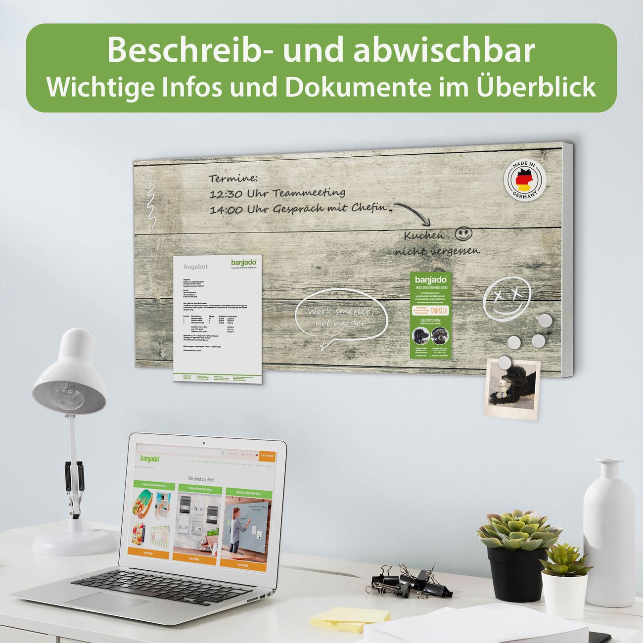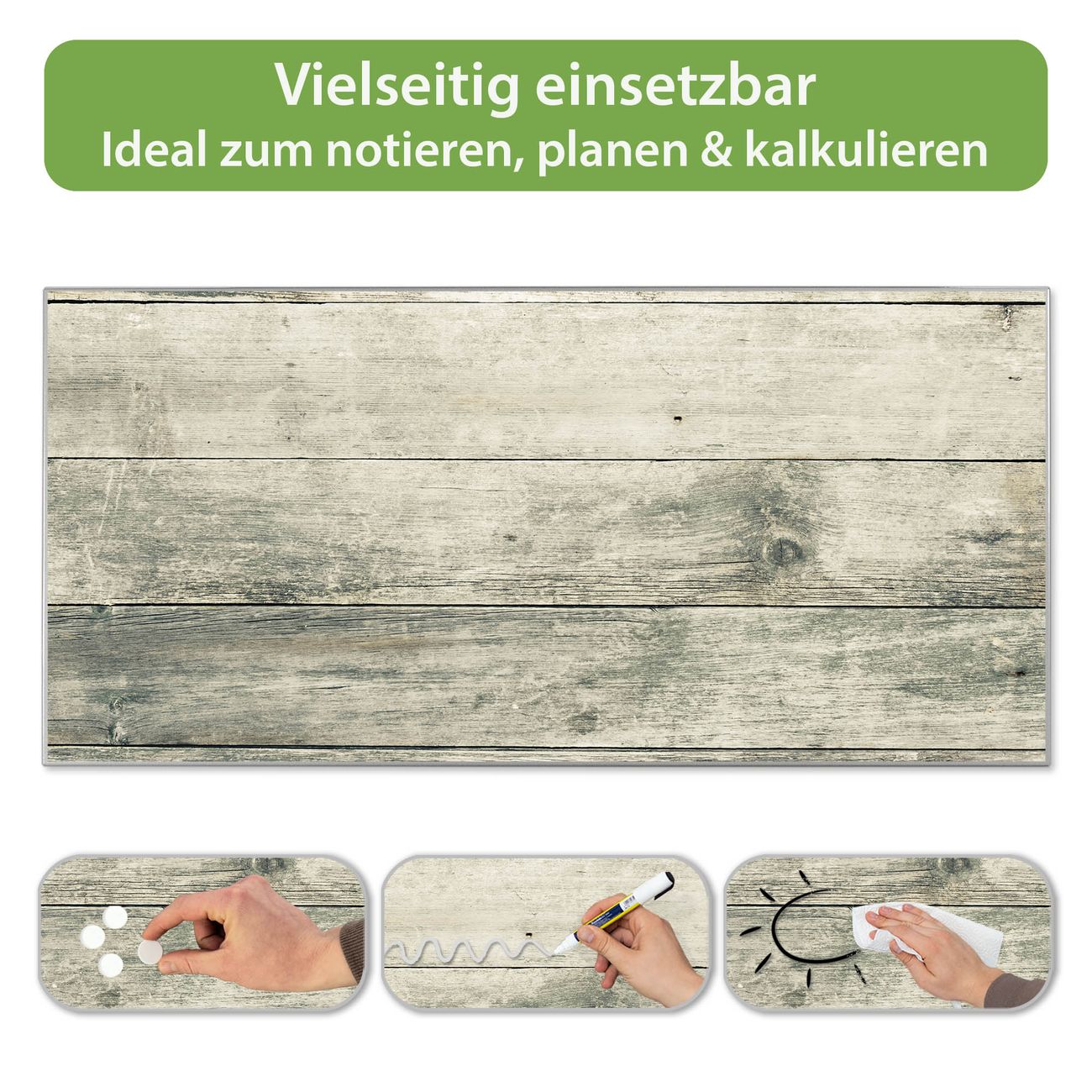 FUNKTION: Die banjado Magnettafel 78x37 cm im Design Motiv Graue Planken vereint Funktionalität und modernes Wohndesign auf stilvolle Weise. Diese hochwertige Magnetwand aus Metall hilft Ihnen dabei, Notizen, Fotos, Termine, Einkaufslisten oder Rezepte übersichtlich zu organisieren. Als praktisches Memoboard sorgt sie für Struktur im Alltag und setzt gleichzeitig einen dekorativen Akzent an Ihrer Wand. DESIGN: Die Metalltafel besteht aus robustem, lackiertem Stahl und ist mit allen handelsüblichen Magneten nutzbar. Besonders praktisch ist die beschreibbare Oberfläche. Sie können die Magnettafel ganz einfach mit Kreidestiften beschriften und die Inhalte bei Bedarf mit einem feuchten Tuch wieder entfernen. So eignet sich das Memoboard ideal für Wochenpläne, Menüpläne, To Do Listen oder kreative Botschaften. DETAILS: Mit ihrem großzügigen Querformat von 78x37 cm bietet die Magnettafel ausreichend Platz für Ihre Organisation. Das Motiv Motiv Graue Planken bringt eine warme, natürliche Optik in Küche, Flur, Büro oder Homeoffice und wirkt auch ohne Magnete oder Beschriftung wie ein modernes Wandbild. NUTZEN: Auf der Rückseite befinden sich vorgefertigte Löcher für eine schnelle und unkomplizierte Wandmontage. Jede banjado Magnettafel wird in Deutschland gefertigt und steht für Qualität, Langlebigkeit und liebevolle Verarbeitung. Dieses beschreibbare Memoboard ist die perfekte Kombination aus Metalltafel, Designobjekt und praktischer Magnetwand für Ihren Alltag. BANJADO: Wir sind ein kleines Team aus dem Herzen von Sachsen. Wir fertigen alle Artikel von Hand für Sie an, Sie erhalten keine preiswerte Importware. Auf Wunsch können Sie auch Ihr eigenes Foto auf die Magnettafel aufbringen, schreiben Sie uns an. Herzlichst, Ihr banjado-Team