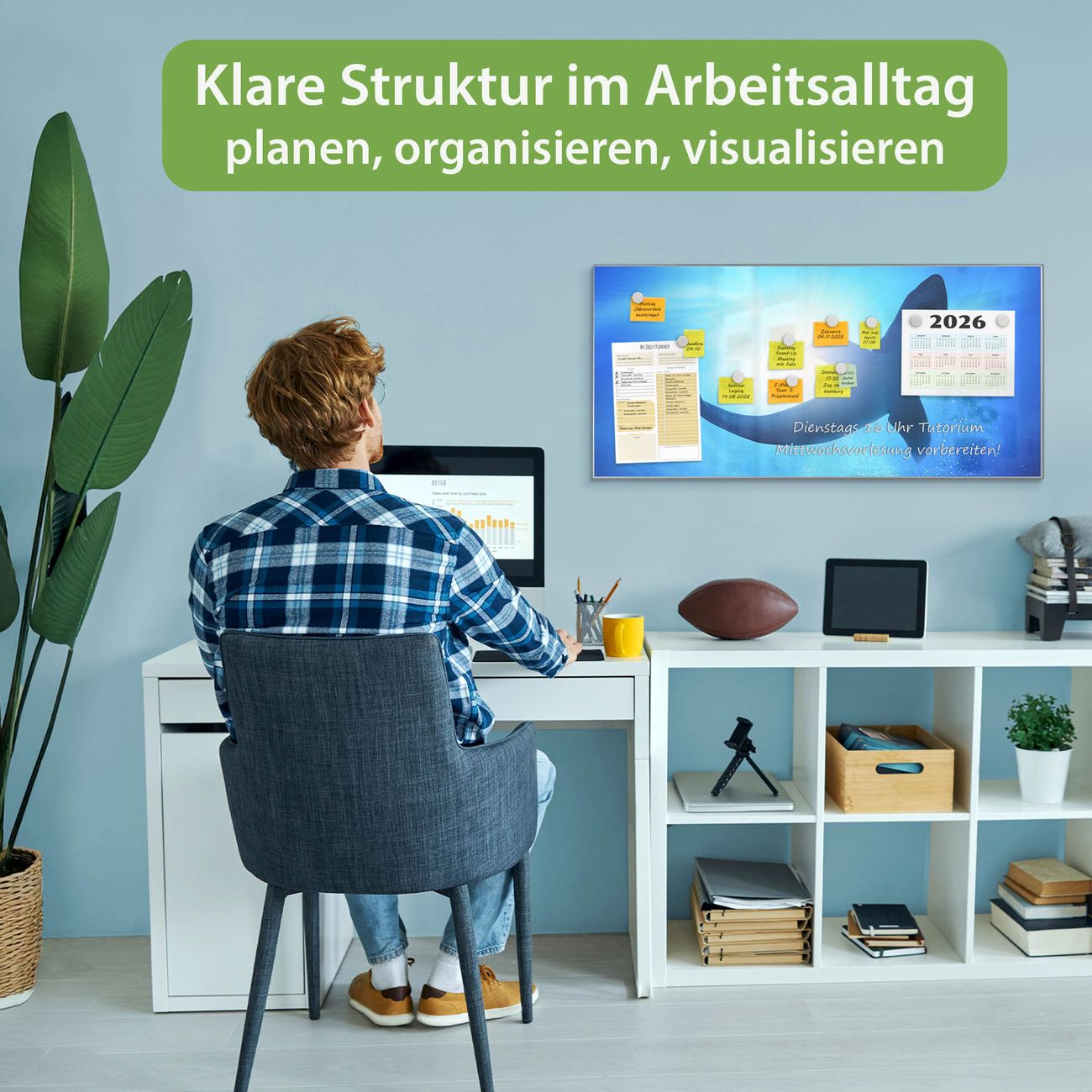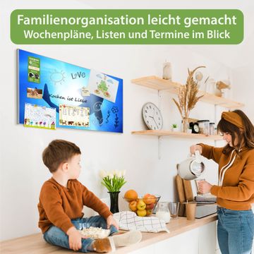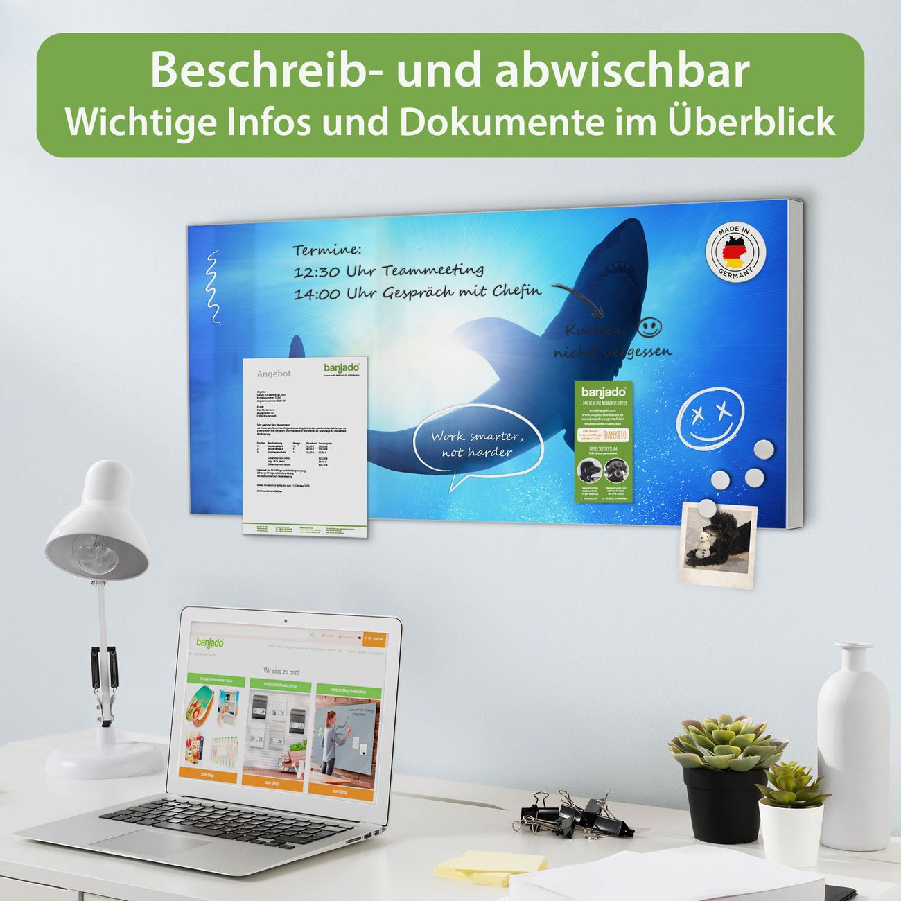 FUNKTION: Die banjado Magnettafel 78x37 cm im Design Motiv Hai vereint Funktionalität und modernes Wohndesign auf stilvolle Weise. Diese hochwertige Magnetwand aus Metall hilft Ihnen dabei, Notizen, Fotos, Termine, Einkaufslisten oder Rezepte übersichtlich zu organisieren. Als praktisches Memoboard sorgt sie für Struktur im Alltag und setzt gleichzeitig einen dekorativen Akzent an Ihrer Wand. DESIGN: Die Metalltafel besteht aus robustem, lackiertem Stahl und ist mit allen handelsüblichen Magneten nutzbar. Besonders praktisch ist die beschreibbare Oberfläche. Sie können die Magnettafel ganz einfach mit Kreidestiften beschriften und die Inhalte bei Bedarf mit einem feuchten Tuch wieder entfernen. So eignet sich das Memoboard ideal für Wochenpläne, Menüpläne, To Do Listen oder kreative Botschaften. DETAILS: Mit ihrem großzügigen Querformat von 78x37 cm bietet die Magnettafel ausreichend Platz für Ihre Organisation. Das Motiv Motiv Hai bringt eine warme, natürliche Optik in Küche, Flur, Büro oder Homeoffice und wirkt auch ohne Magnete oder Beschriftung wie ein modernes Wandbild. NUTZEN: Auf der Rückseite befinden sich vorgefertigte Löcher für eine schnelle und unkomplizierte Wandmontage. Jede banjado Magnettafel wird in Deutschland gefertigt und steht für Qualität, Langlebigkeit und liebevolle Verarbeitung. Dieses beschreibbare Memoboard ist die perfekte Kombination aus Metalltafel, Designobjekt und praktischer Magnetwand für Ihren Alltag. BANJADO: Wir sind ein kleines Team aus dem Herzen von Sachsen. Wir fertigen alle Artikel von Hand für Sie an, Sie erhalten keine preiswerte Importware. Auf Wunsch können Sie auch Ihr eigenes Foto auf die Magnettafel aufbringen, schreiben Sie uns an. Herzlichst, Ihr banjado-Team
