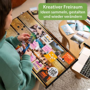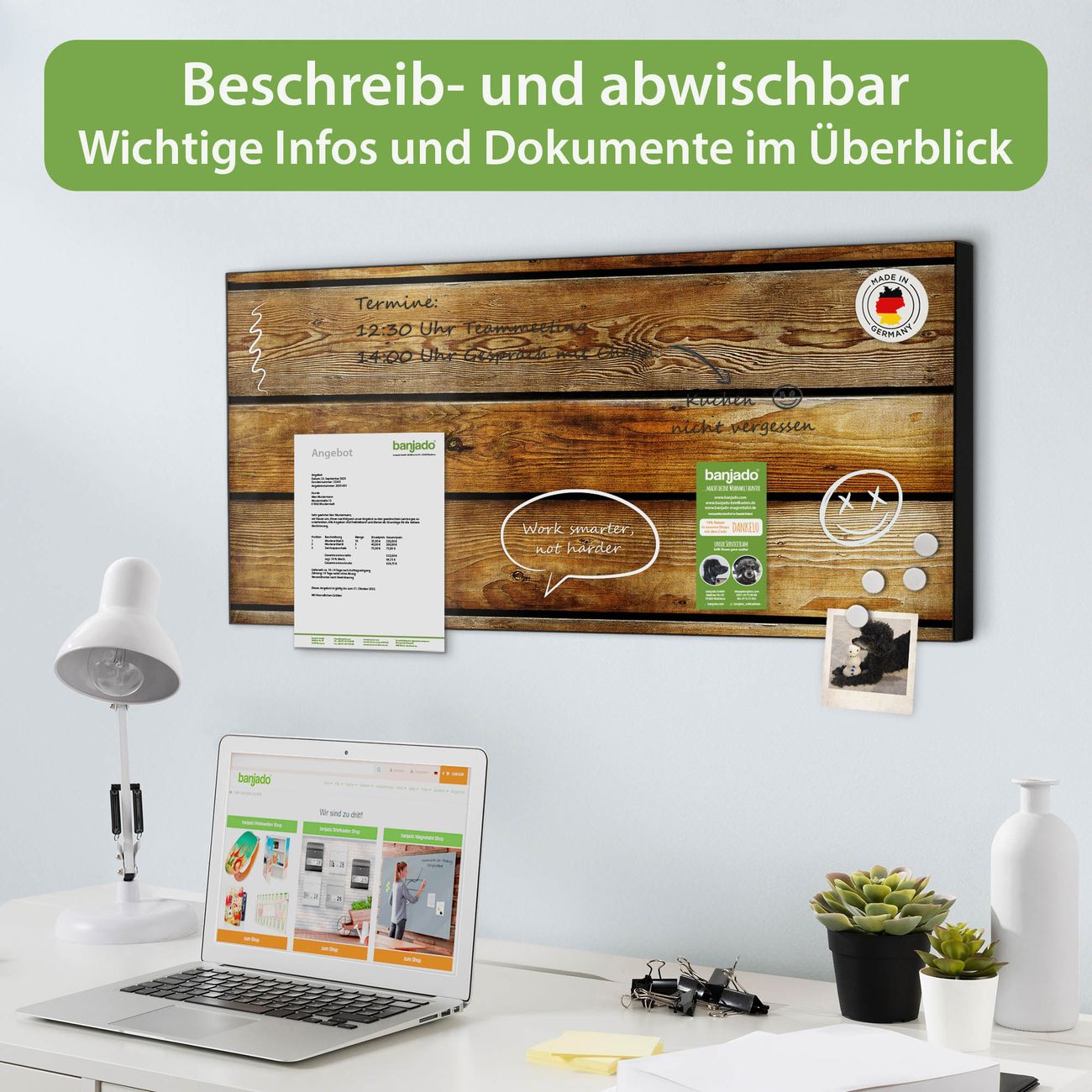 FUNKTION: Die banjado Magnettafel 78x37 cm im Design Motiv Holzbretter vereint Funktionalität und modernes Wohndesign auf stilvolle Weise. Diese hochwertige Magnetwand aus Metall hilft Ihnen dabei, Notizen, Fotos, Termine, Einkaufslisten oder Rezepte übersichtlich zu organisieren. Als praktisches Memoboard sorgt sie für Struktur im Alltag und setzt gleichzeitig einen dekorativen Akzent an Ihrer Wand. DESIGN: Die Metalltafel besteht aus robustem, lackiertem Stahl und ist mit allen handelsüblichen Magneten nutzbar. Besonders praktisch ist die beschreibbare Oberfläche. Sie können die Magnettafel ganz einfach mit Kreidestiften beschriften und die Inhalte bei Bedarf mit einem feuchten Tuch wieder entfernen. So eignet sich das Memoboard ideal für Wochenpläne, Menüpläne, To Do Listen oder kreative Botschaften. DETAILS: Mit ihrem großzügigen Querformat von 78x37 cm bietet die Magnettafel ausreichend Platz für Ihre Organisation. Das Motiv Motiv Holzbretter bringt eine warme, natürliche Optik in Küche, Flur, Büro oder Homeoffice und wirkt auch ohne Magnete oder Beschriftung wie ein modernes Wandbild. NUTZEN: Auf der Rückseite befinden sich vorgefertigte Löcher für eine schnelle und unkomplizierte Wandmontage. Jede banjado Magnettafel wird in Deutschland gefertigt und steht für Qualität, Langlebigkeit und liebevolle Verarbeitung. Dieses beschreibbare Memoboard ist die perfekte Kombination aus Metalltafel, Designobjekt und praktischer Magnetwand für Ihren Alltag. BANJADO: Wir sind ein kleines Team aus dem Herzen von Sachsen. Wir fertigen alle Artikel von Hand für Sie an, Sie erhalten keine preiswerte Importware. Auf Wunsch können Sie auch Ihr eigenes Foto auf die Magnettafel aufbringen, schreiben Sie uns an. Herzlichst, Ihr banjado-Team