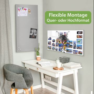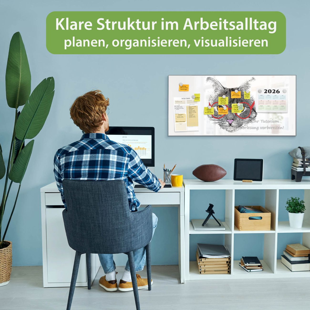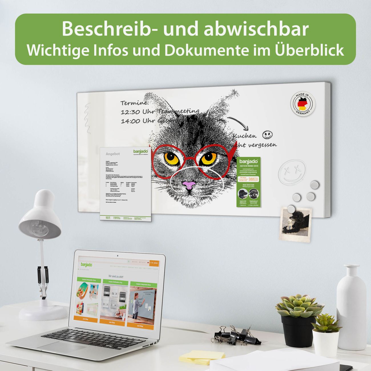 FUNKTION: Die banjado Magnettafel 78x37 cm im Design Motiv Intellicat vereint Funktionalität und modernes Wohndesign auf stilvolle Weise. Diese hochwertige Magnetwand aus Metall hilft Ihnen dabei, Notizen, Fotos, Termine, Einkaufslisten oder Rezepte übersichtlich zu organisieren. Als praktisches Memoboard sorgt sie für Struktur im Alltag und setzt gleichzeitig einen dekorativen Akzent an Ihrer Wand. DESIGN: Die Metalltafel besteht aus robustem, lackiertem Stahl und ist mit allen handelsüblichen Magneten nutzbar. Besonders praktisch ist die beschreibbare Oberfläche. Sie können die Magnettafel ganz einfach mit Kreidestiften beschriften und die Inhalte bei Bedarf mit einem feuchten Tuch wieder entfernen. So eignet sich das Memoboard ideal für Wochenpläne, Menüpläne, To Do Listen oder kreative Botschaften. DETAILS: Mit ihrem großzügigen Querformat von 78x37 cm bietet die Magnettafel ausreichend Platz für Ihre Organisation. Das Motiv Motiv Intellicat bringt eine warme, natürliche Optik in Küche, Flur, Büro oder Homeoffice und wirkt auch ohne Magnete oder Beschriftung wie ein modernes Wandbild. NUTZEN: Auf der Rückseite befinden sich vorgefertigte Löcher für eine schnelle und unkomplizierte Wandmontage. Jede banjado Magnettafel wird in Deutschland gefertigt und steht für Qualität, Langlebigkeit und liebevolle Verarbeitung. Dieses beschreibbare Memoboard ist die perfekte Kombination aus Metalltafel, Designobjekt und praktischer Magnetwand für Ihren Alltag. BANJADO: Wir sind ein kleines Team aus dem Herzen von Sachsen. Wir fertigen alle Artikel von Hand für Sie an, Sie erhalten keine preiswerte Importware. Auf Wunsch können Sie auch Ihr eigenes Foto auf die Magnettafel aufbringen, schreiben Sie uns an. Herzlichst, Ihr banjado-Team