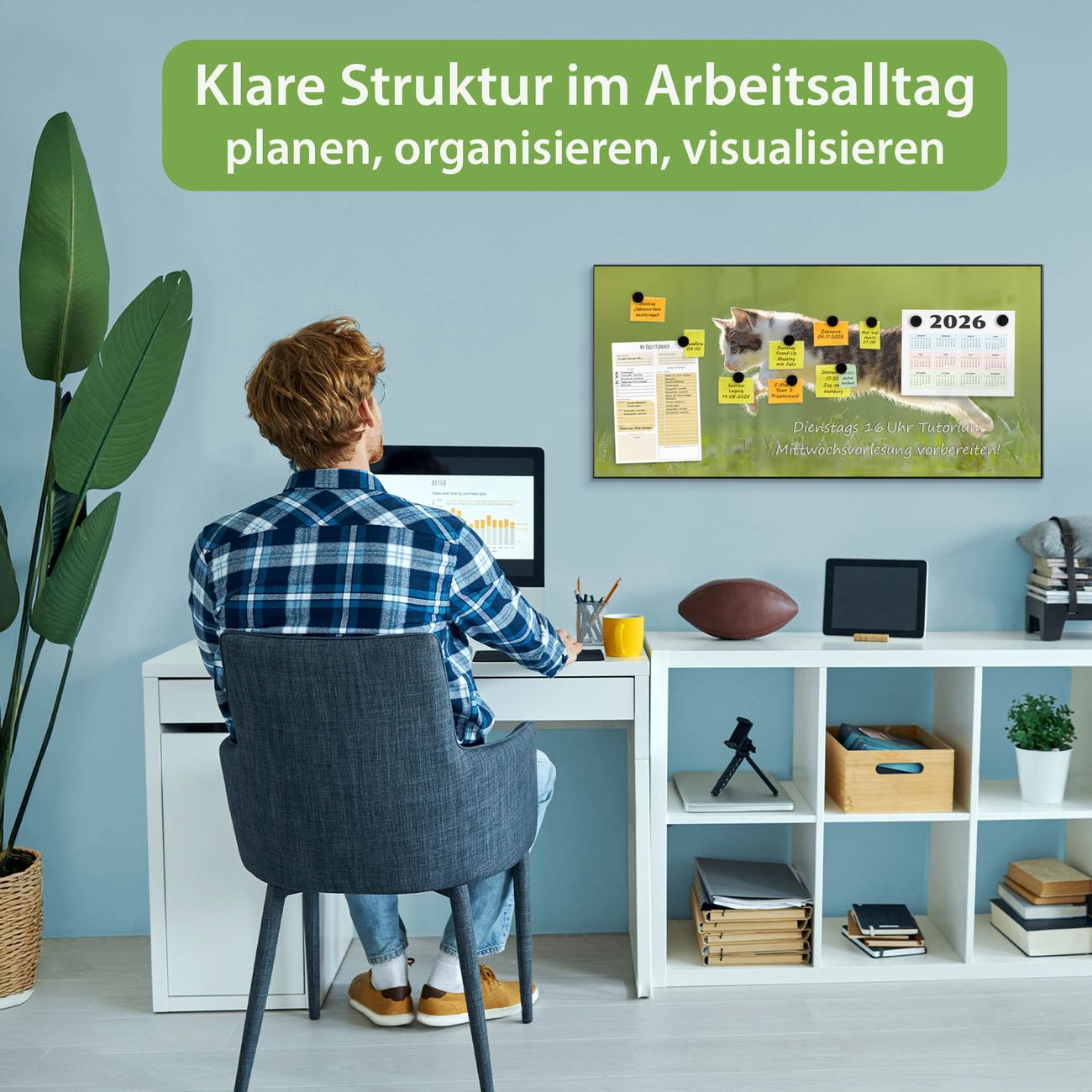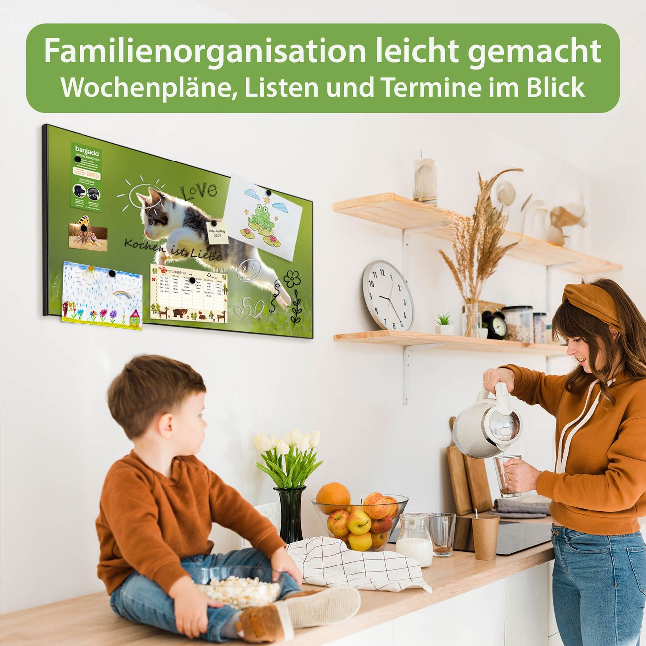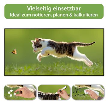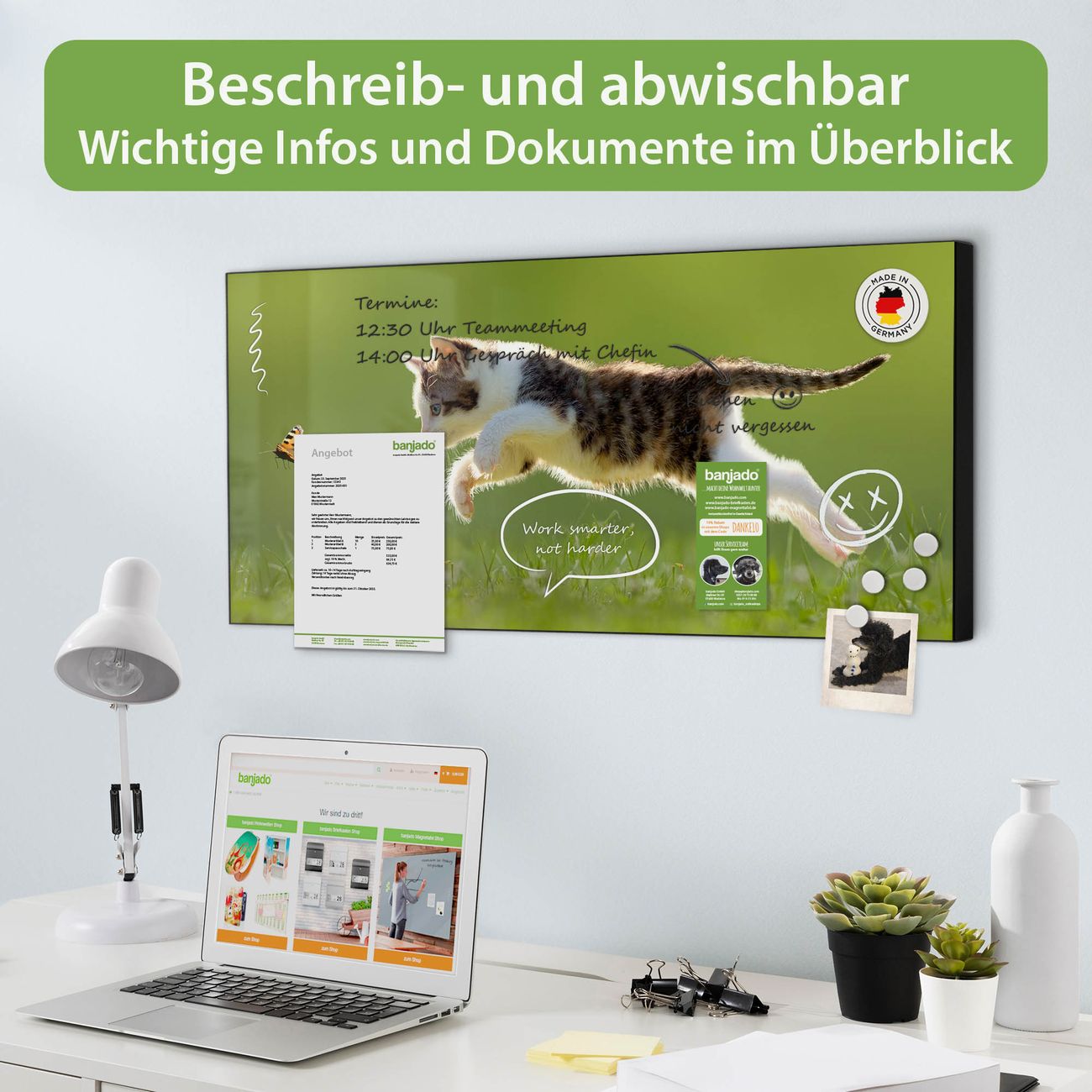 FUNKTION: Die banjado Magnettafel 78x37 cm im Design Motiv Jagende Katze vereint Funktionalität und modernes Wohndesign auf stilvolle Weise. Diese hochwertige Magnetwand aus Metall hilft Ihnen dabei, Notizen, Fotos, Termine, Einkaufslisten oder Rezepte übersichtlich zu organisieren. Als praktisches Memoboard sorgt sie für Struktur im Alltag und setzt gleichzeitig einen dekorativen Akzent an Ihrer Wand. DESIGN: Die Metalltafel besteht aus robustem, lackiertem Stahl und ist mit allen handelsüblichen Magneten nutzbar. Besonders praktisch ist die beschreibbare Oberfläche. Sie können die Magnettafel ganz einfach mit Kreidestiften beschriften und die Inhalte bei Bedarf mit einem feuchten Tuch wieder entfernen. So eignet sich das Memoboard ideal für Wochenpläne, Menüpläne, To Do Listen oder kreative Botschaften. DETAILS: Mit ihrem großzügigen Querformat von 78x37 cm bietet die Magnettafel ausreichend Platz für Ihre Organisation. Das Motiv Motiv Jagende Katze bringt eine warme, natürliche Optik in Küche, Flur, Büro oder Homeoffice und wirkt auch ohne Magnete oder Beschriftung wie ein modernes Wandbild. NUTZEN: Auf der Rückseite befinden sich vorgefertigte Löcher für eine schnelle und unkomplizierte Wandmontage. Jede banjado Magnettafel wird in Deutschland gefertigt und steht für Qualität, Langlebigkeit und liebevolle Verarbeitung. Dieses beschreibbare Memoboard ist die perfekte Kombination aus Metalltafel, Designobjekt und praktischer Magnetwand für Ihren Alltag. BANJADO: Wir sind ein kleines Team aus dem Herzen von Sachsen. Wir fertigen alle Artikel von Hand für Sie an, Sie erhalten keine preiswerte Importware. Auf Wunsch können Sie auch Ihr eigenes Foto auf die Magnettafel aufbringen, schreiben Sie uns an. Herzlichst, Ihr banjado-Team