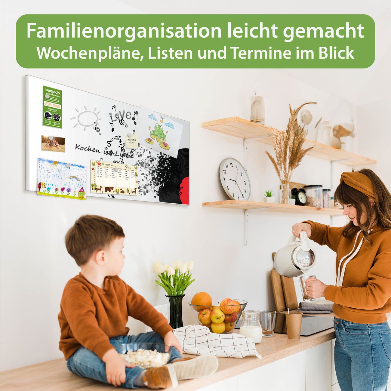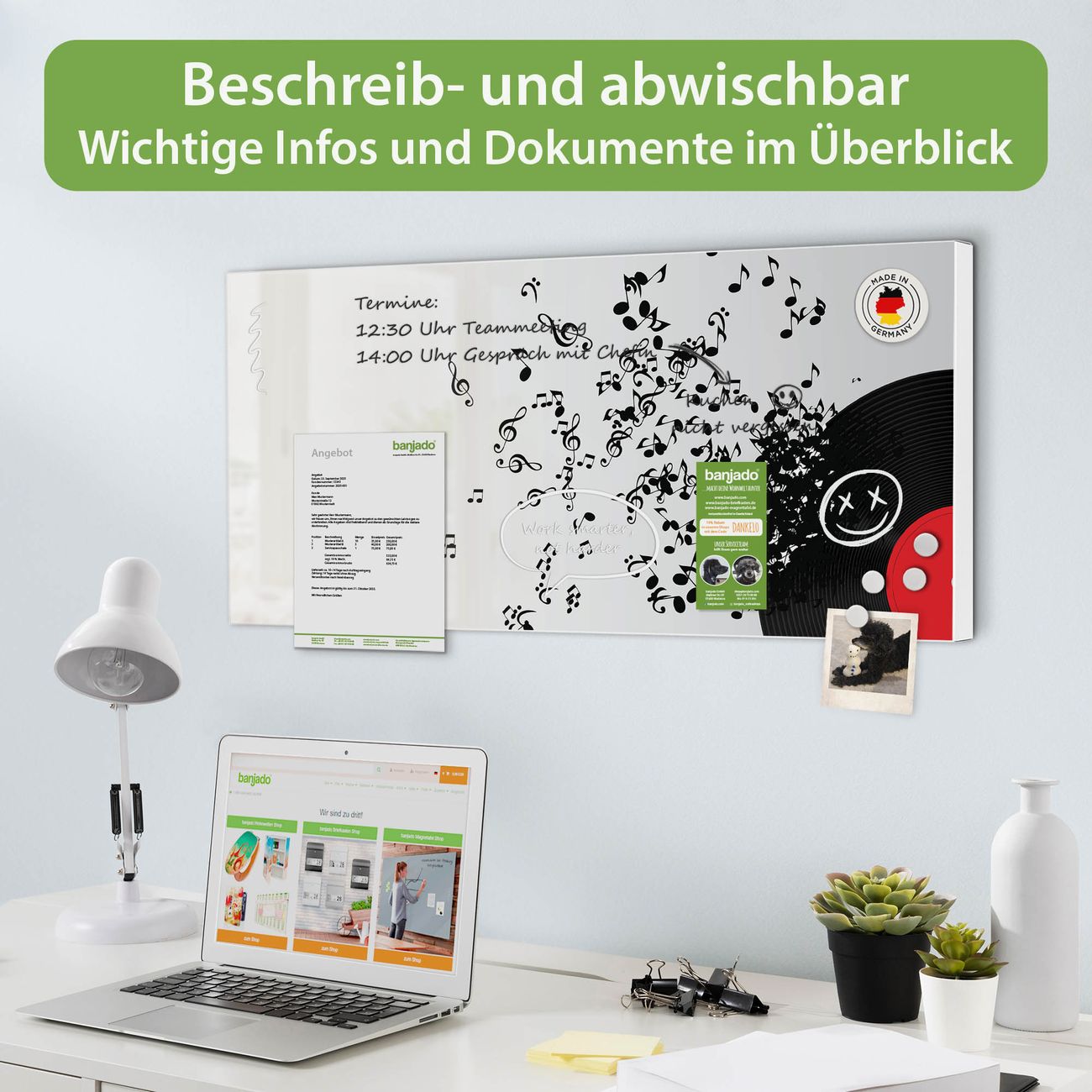 FUNKTION: Die banjado Magnettafel 78x37 cm im Design Motiv Juke Box vereint Funktionalität und modernes Wohndesign auf stilvolle Weise. Diese hochwertige Magnetwand aus Metall hilft Ihnen dabei, Notizen, Fotos, Termine, Einkaufslisten oder Rezepte übersichtlich zu organisieren. Als praktisches Memoboard sorgt sie für Struktur im Alltag und setzt gleichzeitig einen dekorativen Akzent an Ihrer Wand. DESIGN: Die Metalltafel besteht aus robustem, lackiertem Stahl und ist mit allen handelsüblichen Magneten nutzbar. Besonders praktisch ist die beschreibbare Oberfläche. Sie können die Magnettafel ganz einfach mit Kreidestiften beschriften und die Inhalte bei Bedarf mit einem feuchten Tuch wieder entfernen. So eignet sich das Memoboard ideal für Wochenpläne, Menüpläne, To Do Listen oder kreative Botschaften. DETAILS: Mit ihrem großzügigen Querformat von 78x37 cm bietet die Magnettafel ausreichend Platz für Ihre Organisation. Das Motiv Motiv Juke Box bringt eine warme, natürliche Optik in Küche, Flur, Büro oder Homeoffice und wirkt auch ohne Magnete oder Beschriftung wie ein modernes Wandbild. NUTZEN: Auf der Rückseite befinden sich vorgefertigte Löcher für eine schnelle und unkomplizierte Wandmontage. Jede banjado Magnettafel wird in Deutschland gefertigt und steht für Qualität, Langlebigkeit und liebevolle Verarbeitung. Dieses beschreibbare Memoboard ist die perfekte Kombination aus Metalltafel, Designobjekt und praktischer Magnetwand für Ihren Alltag. BANJADO: Wir sind ein kleines Team aus dem Herzen von Sachsen. Wir fertigen alle Artikel von Hand für Sie an, Sie erhalten keine preiswerte Importware. Auf Wunsch können Sie auch Ihr eigenes Foto auf die Magnettafel aufbringen, schreiben Sie uns an. Herzlichst, Ihr banjado-Team