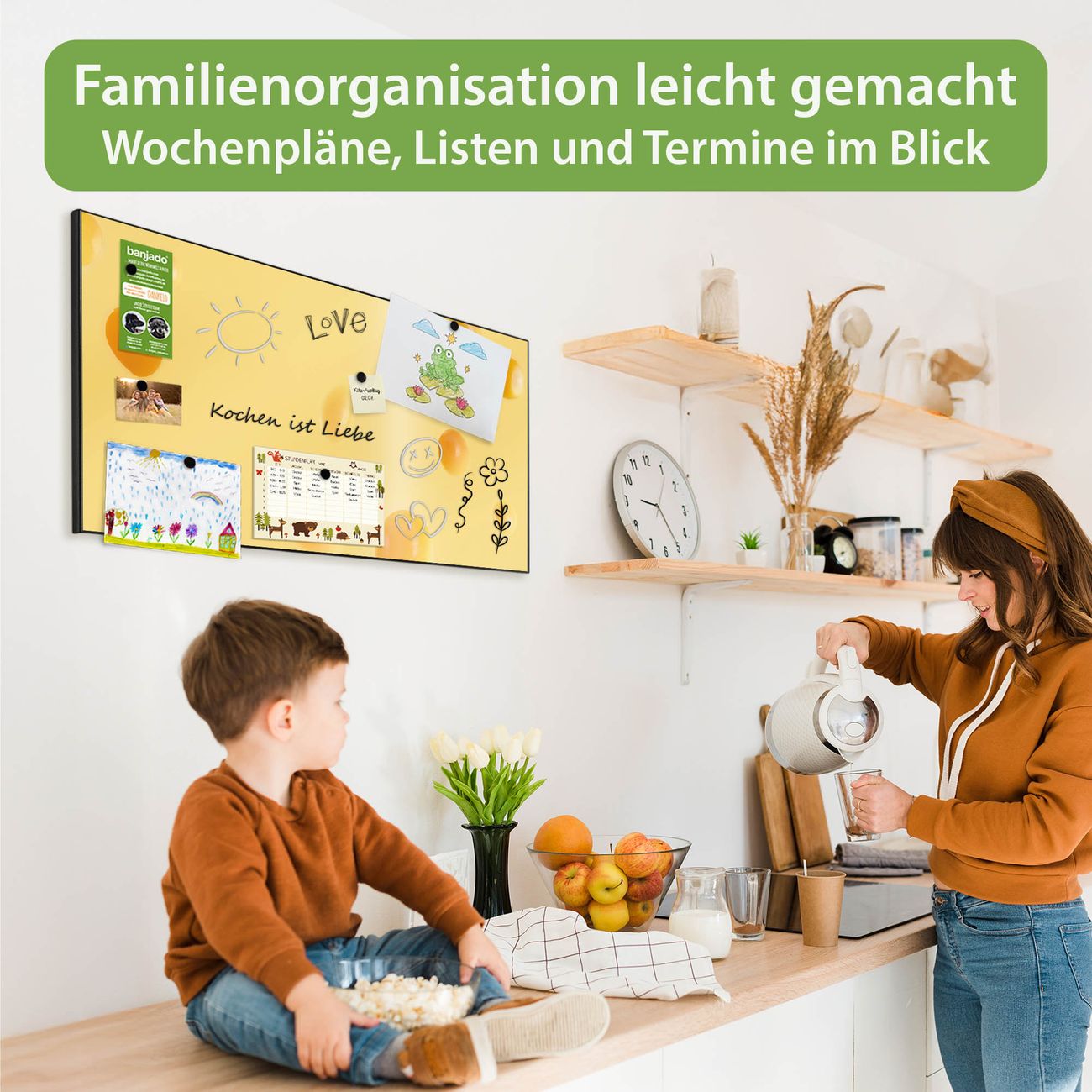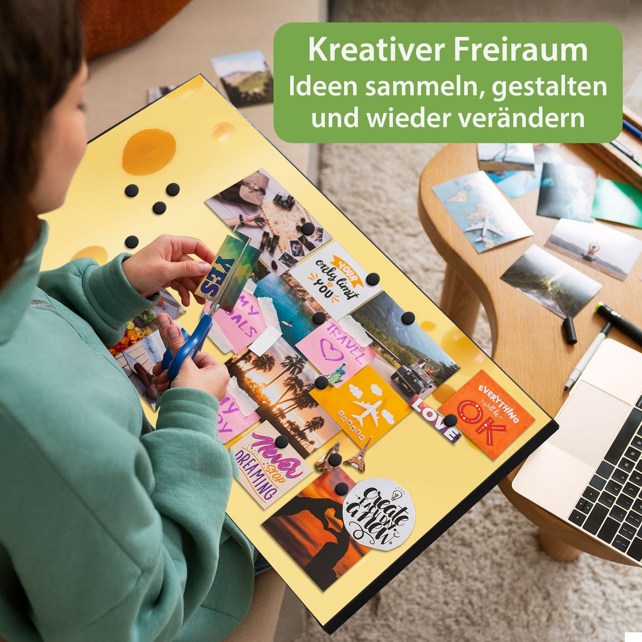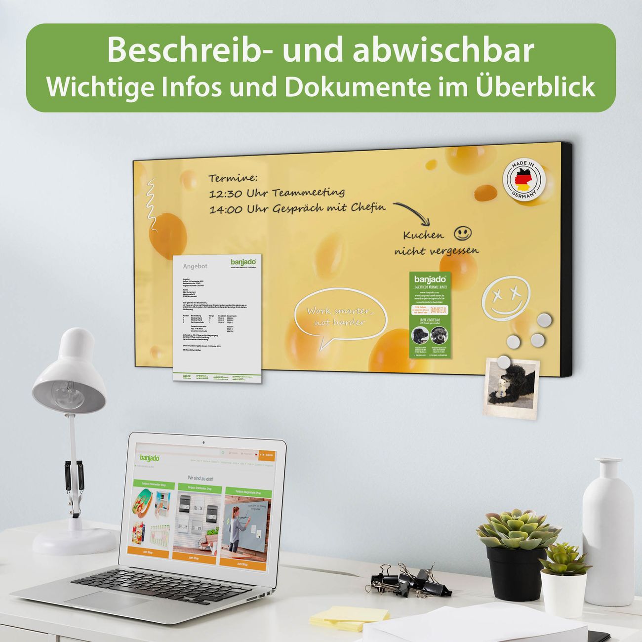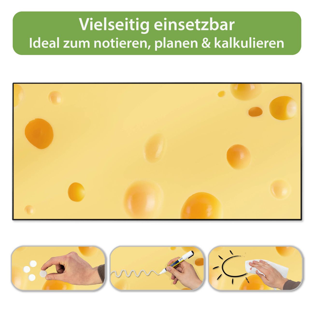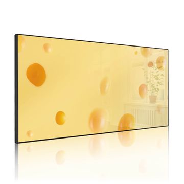 FUNKTION: Die banjado Magnettafel 78x37 cm im Design Motiv Käse vereint Funktionalität und modernes Wohndesign auf stilvolle Weise. Diese hochwertige Magnetwand aus Metall hilft Ihnen dabei, Notizen, Fotos, Termine, Einkaufslisten oder Rezepte übersichtlich zu organisieren. Als praktisches Memoboard sorgt sie für Struktur im Alltag und setzt gleichzeitig einen dekorativen Akzent an Ihrer Wand. DESIGN: Die Metalltafel besteht aus robustem, lackiertem Stahl und ist mit allen handelsüblichen Magneten nutzbar. Besonders praktisch ist die beschreibbare Oberfläche. Sie können die Magnettafel ganz einfach mit Kreidestiften beschriften und die Inhalte bei Bedarf mit einem feuchten Tuch wieder entfernen. So eignet sich das Memoboard ideal für Wochenpläne, Menüpläne, To Do Listen oder kreative Botschaften. DETAILS: Mit ihrem großzügigen Querformat von 78x37 cm bietet die Magnettafel ausreichend Platz für Ihre Organisation. Das Motiv Motiv Käse bringt eine warme, natürliche Optik in Küche, Flur, Büro oder Homeoffice und wirkt auch ohne Magnete oder Beschriftung wie ein modernes Wandbild. NUTZEN: Auf der Rückseite befinden sich vorgefertigte Löcher für eine schnelle und unkomplizierte Wandmontage. Jede banjado Magnettafel wird in Deutschland gefertigt und steht für Qualität, Langlebigkeit und liebevolle Verarbeitung. Dieses beschreibbare Memoboard ist die perfekte Kombination aus Metalltafel, Designobjekt und praktischer Magnetwand für Ihren Alltag. BANJADO: Wir sind ein kleines Team aus dem Herzen von Sachsen. Wir fertigen alle Artikel von Hand für Sie an, Sie erhalten keine preiswerte Importware. Auf Wunsch können Sie auch Ihr eigenes Foto auf die Magnettafel aufbringen, schreiben Sie uns an. Herzlichst, Ihr banjado-Team