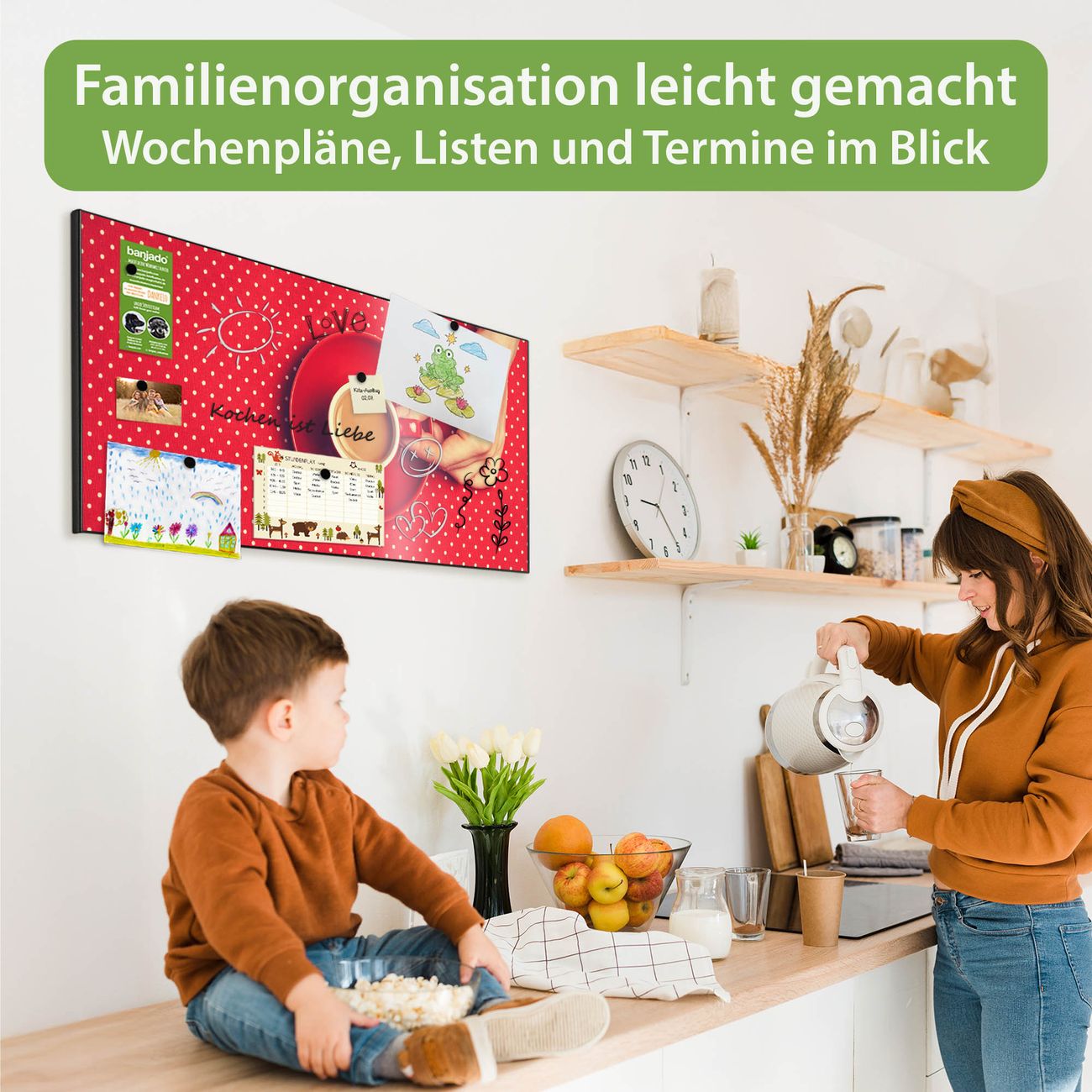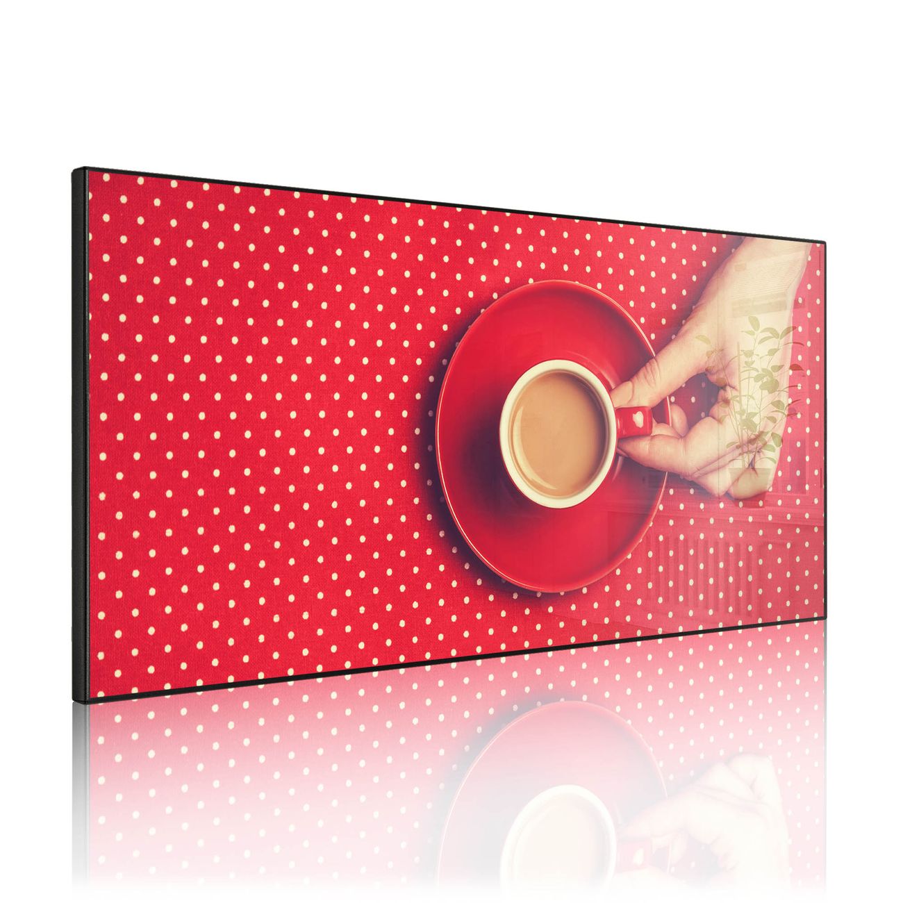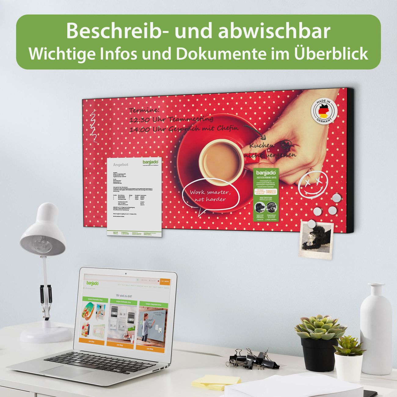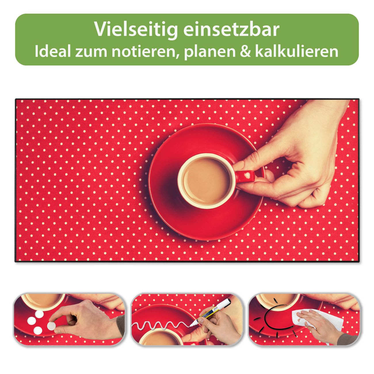 FUNKTION: Die banjado Magnettafel 78x37 cm im Design Motiv Kaffee Rot Weiss vereint Funktionalität und modernes Wohndesign auf stilvolle Weise. Diese hochwertige Magnetwand aus Metall hilft Ihnen dabei, Notizen, Fotos, Termine, Einkaufslisten oder Rezepte übersichtlich zu organisieren. Als praktisches Memoboard sorgt sie für Struktur im Alltag und setzt gleichzeitig einen dekorativen Akzent an Ihrer Wand. DESIGN: Die Metalltafel besteht aus robustem, lackiertem Stahl und ist mit allen handelsüblichen Magneten nutzbar. Besonders praktisch ist die beschreibbare Oberfläche. Sie können die Magnettafel ganz einfach mit Kreidestiften beschriften und die Inhalte bei Bedarf mit einem feuchten Tuch wieder entfernen. So eignet sich das Memoboard ideal für Wochenpläne, Menüpläne, To Do Listen oder kreative Botschaften. DETAILS: Mit ihrem großzügigen Querformat von 78x37 cm bietet die Magnettafel ausreichend Platz für Ihre Organisation. Das Motiv Motiv Kaffee Rot Weiss bringt eine warme, natürliche Optik in Küche, Flur, Büro oder Homeoffice und wirkt auch ohne Magnete oder Beschriftung wie ein modernes Wandbild. NUTZEN: Auf der Rückseite befinden sich vorgefertigte Löcher für eine schnelle und unkomplizierte Wandmontage. Jede banjado Magnettafel wird in Deutschland gefertigt und steht für Qualität, Langlebigkeit und liebevolle Verarbeitung. Dieses beschreibbare Memoboard ist die perfekte Kombination aus Metalltafel, Designobjekt und praktischer Magnetwand für Ihren Alltag. BANJADO: Wir sind ein kleines Team aus dem Herzen von Sachsen. Wir fertigen alle Artikel von Hand für Sie an, Sie erhalten keine preiswerte Importware. Auf Wunsch können Sie auch Ihr eigenes Foto auf die Magnettafel aufbringen, schreiben Sie uns an. Herzlichst, Ihr banjado-Team