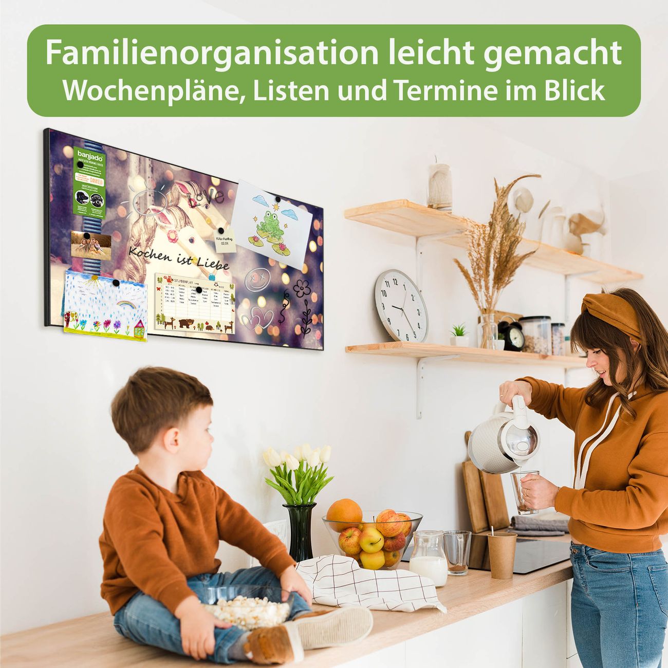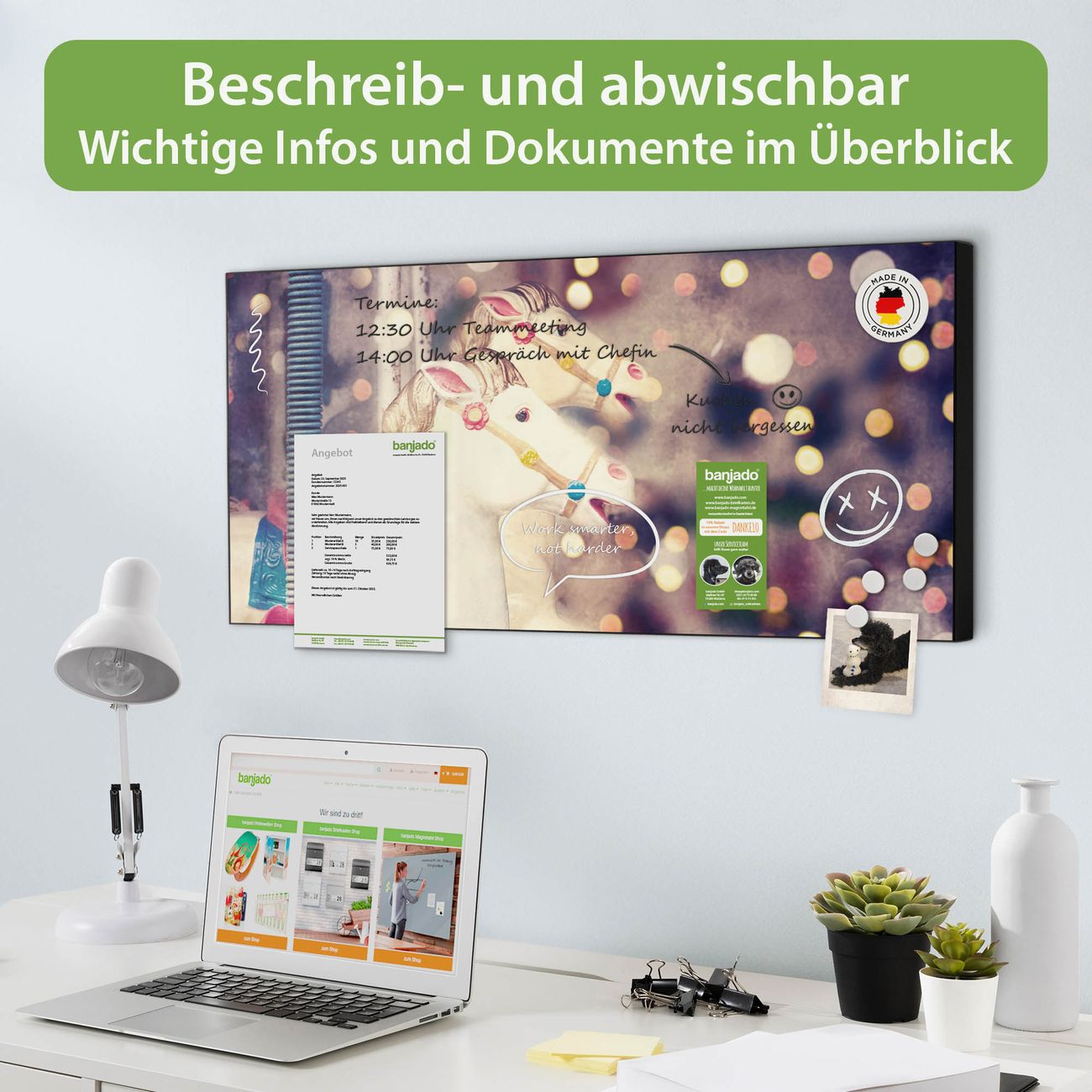 FUNKTION: Die banjado Magnettafel 78x37 cm im Design Motiv Kinderkarussell vereint Funktionalität und modernes Wohndesign auf stilvolle Weise. Diese hochwertige Magnetwand aus Metall hilft Ihnen dabei, Notizen, Fotos, Termine, Einkaufslisten oder Rezepte übersichtlich zu organisieren. Als praktisches Memoboard sorgt sie für Struktur im Alltag und setzt gleichzeitig einen dekorativen Akzent an Ihrer Wand. DESIGN: Die Metalltafel besteht aus robustem, lackiertem Stahl und ist mit allen handelsüblichen Magneten nutzbar. Besonders praktisch ist die beschreibbare Oberfläche. Sie können die Magnettafel ganz einfach mit Kreidestiften beschriften und die Inhalte bei Bedarf mit einem feuchten Tuch wieder entfernen. So eignet sich das Memoboard ideal für Wochenpläne, Menüpläne, To Do Listen oder kreative Botschaften. DETAILS: Mit ihrem großzügigen Querformat von 78x37 cm bietet die Magnettafel ausreichend Platz für Ihre Organisation. Das Motiv Motiv Kinderkarussell bringt eine warme, natürliche Optik in Küche, Flur, Büro oder Homeoffice und wirkt auch ohne Magnete oder Beschriftung wie ein modernes Wandbild. NUTZEN: Auf der Rückseite befinden sich vorgefertigte Löcher für eine schnelle und unkomplizierte Wandmontage. Jede banjado Magnettafel wird in Deutschland gefertigt und steht für Qualität, Langlebigkeit und liebevolle Verarbeitung. Dieses beschreibbare Memoboard ist die perfekte Kombination aus Metalltafel, Designobjekt und praktischer Magnetwand für Ihren Alltag. BANJADO: Wir sind ein kleines Team aus dem Herzen von Sachsen. Wir fertigen alle Artikel von Hand für Sie an, Sie erhalten keine preiswerte Importware. Auf Wunsch können Sie auch Ihr eigenes Foto auf die Magnettafel aufbringen, schreiben Sie uns an. Herzlichst, Ihr banjado-Team