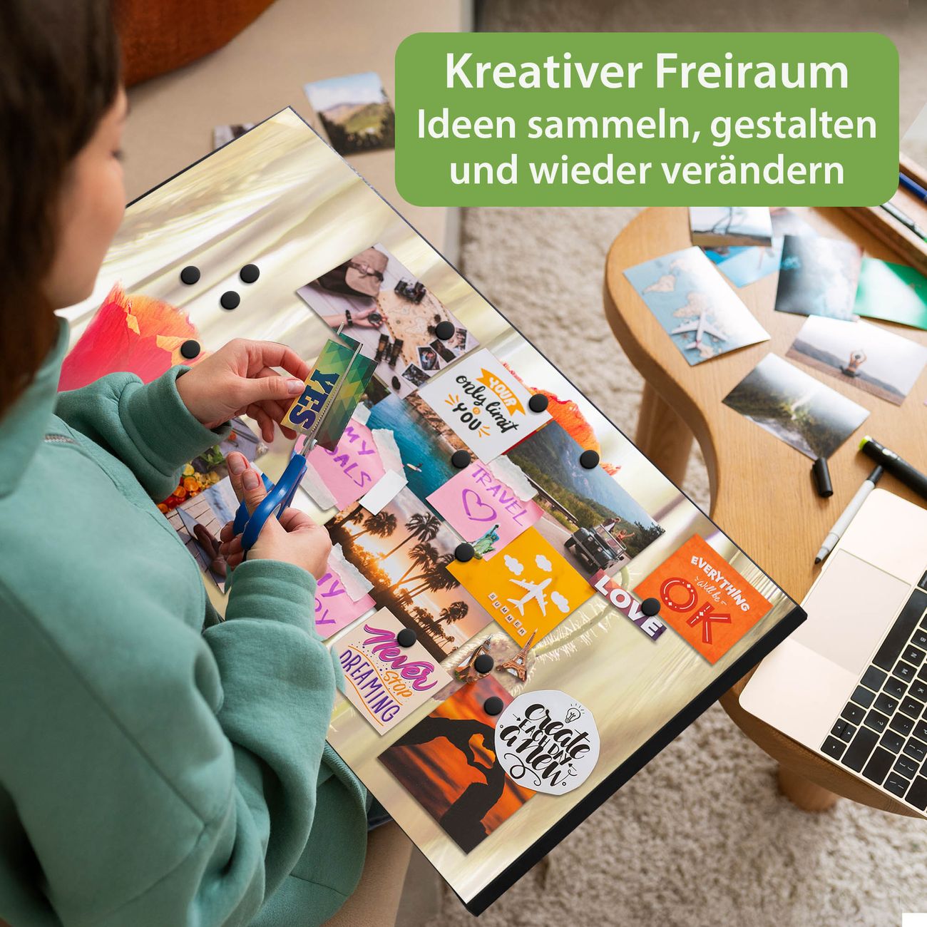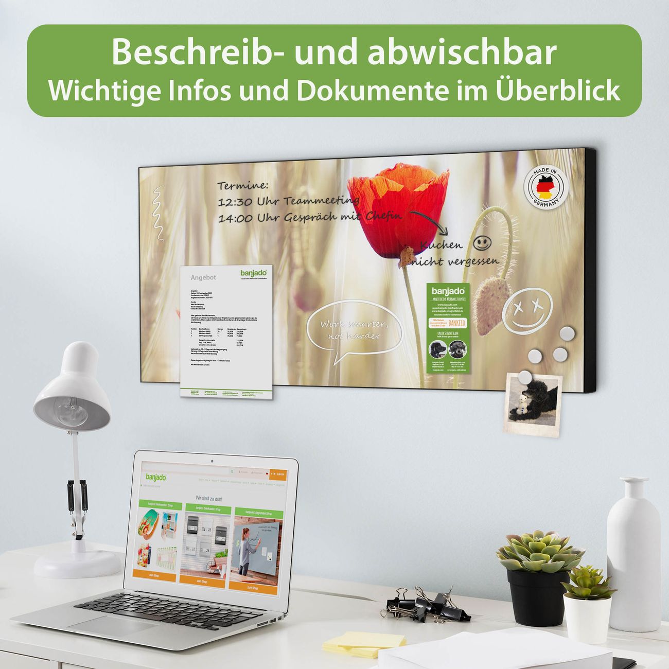 FUNKTION: Die banjado Magnettafel 78x37 cm im Design Motiv Klatschmohn vereint Funktionalität und modernes Wohndesign auf stilvolle Weise. Diese hochwertige Magnetwand aus Metall hilft Ihnen dabei, Notizen, Fotos, Termine, Einkaufslisten oder Rezepte übersichtlich zu organisieren. Als praktisches Memoboard sorgt sie für Struktur im Alltag und setzt gleichzeitig einen dekorativen Akzent an Ihrer Wand. DESIGN: Die Metalltafel besteht aus robustem, lackiertem Stahl und ist mit allen handelsüblichen Magneten nutzbar. Besonders praktisch ist die beschreibbare Oberfläche. Sie können die Magnettafel ganz einfach mit Kreidestiften beschriften und die Inhalte bei Bedarf mit einem feuchten Tuch wieder entfernen. So eignet sich das Memoboard ideal für Wochenpläne, Menüpläne, To Do Listen oder kreative Botschaften. DETAILS: Mit ihrem großzügigen Querformat von 78x37 cm bietet die Magnettafel ausreichend Platz für Ihre Organisation. Das Motiv Motiv Klatschmohn bringt eine warme, natürliche Optik in Küche, Flur, Büro oder Homeoffice und wirkt auch ohne Magnete oder Beschriftung wie ein modernes Wandbild. NUTZEN: Auf der Rückseite befinden sich vorgefertigte Löcher für eine schnelle und unkomplizierte Wandmontage. Jede banjado Magnettafel wird in Deutschland gefertigt und steht für Qualität, Langlebigkeit und liebevolle Verarbeitung. Dieses beschreibbare Memoboard ist die perfekte Kombination aus Metalltafel, Designobjekt und praktischer Magnetwand für Ihren Alltag. BANJADO: Wir sind ein kleines Team aus dem Herzen von Sachsen. Wir fertigen alle Artikel von Hand für Sie an, Sie erhalten keine preiswerte Importware. Auf Wunsch können Sie auch Ihr eigenes Foto auf die Magnettafel aufbringen, schreiben Sie uns an. Herzlichst, Ihr banjado-Team