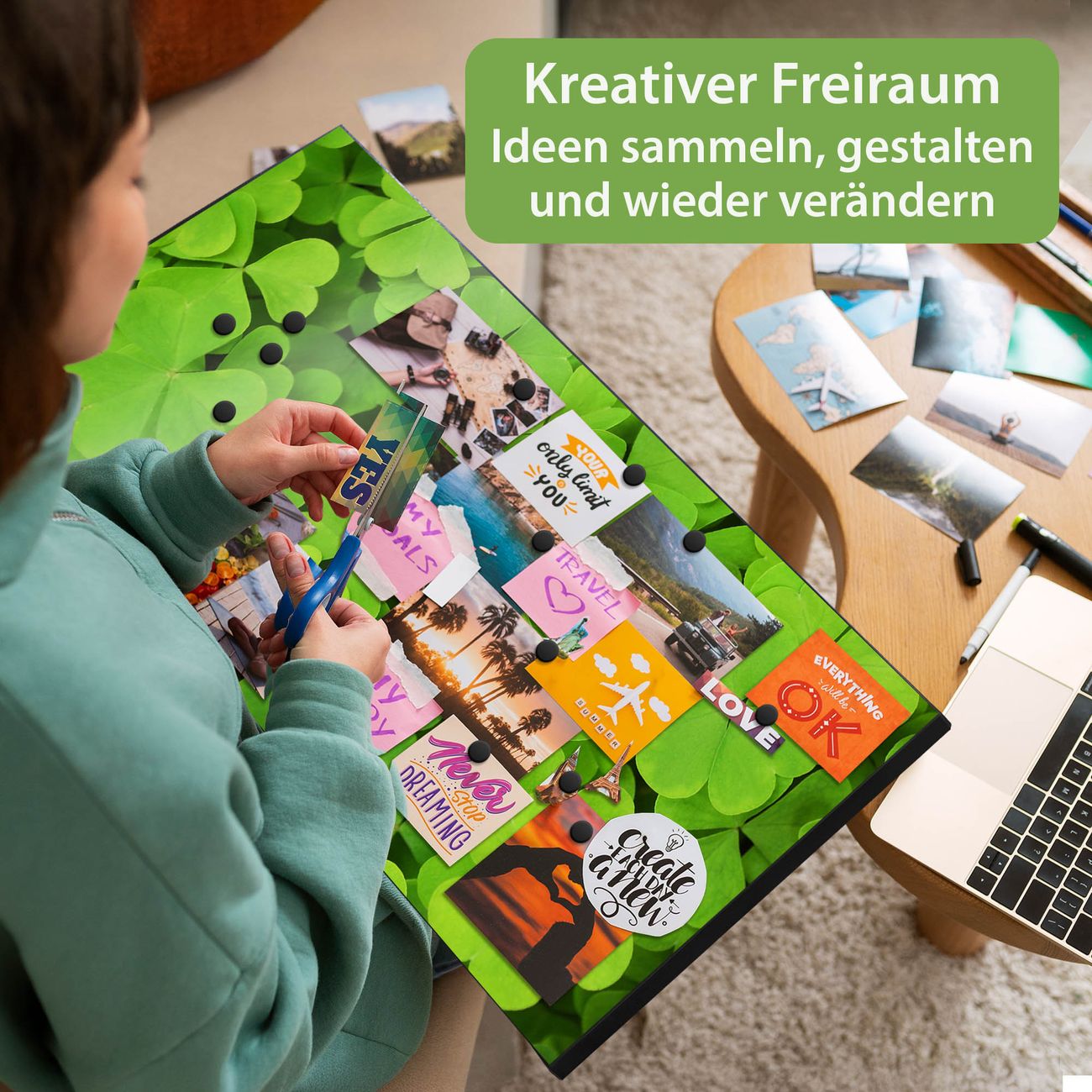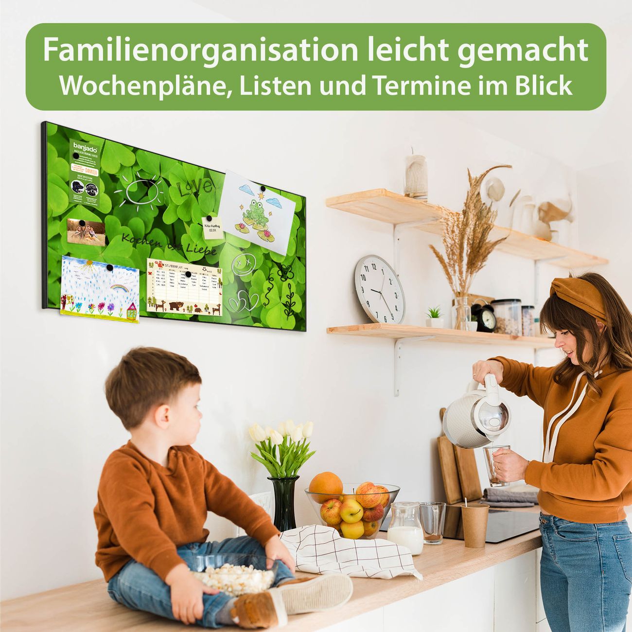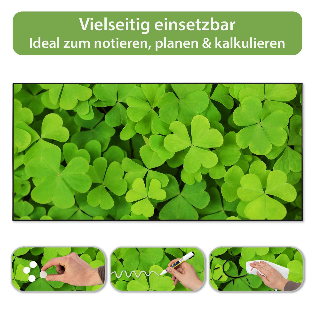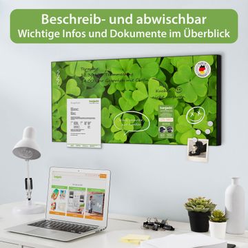 FUNKTION: Die banjado Magnettafel 78x37 cm im Design Motiv Klee vereint Funktionalität und modernes Wohndesign auf stilvolle Weise. Diese hochwertige Magnetwand aus Metall hilft Ihnen dabei, Notizen, Fotos, Termine, Einkaufslisten oder Rezepte übersichtlich zu organisieren. Als praktisches Memoboard sorgt sie für Struktur im Alltag und setzt gleichzeitig einen dekorativen Akzent an Ihrer Wand. DESIGN: Die Metalltafel besteht aus robustem, lackiertem Stahl und ist mit allen handelsüblichen Magneten nutzbar. Besonders praktisch ist die beschreibbare Oberfläche. Sie können die Magnettafel ganz einfach mit Kreidestiften beschriften und die Inhalte bei Bedarf mit einem feuchten Tuch wieder entfernen. So eignet sich das Memoboard ideal für Wochenpläne, Menüpläne, To Do Listen oder kreative Botschaften. DETAILS: Mit ihrem großzügigen Querformat von 78x37 cm bietet die Magnettafel ausreichend Platz für Ihre Organisation. Das Motiv Motiv Klee bringt eine warme, natürliche Optik in Küche, Flur, Büro oder Homeoffice und wirkt auch ohne Magnete oder Beschriftung wie ein modernes Wandbild. NUTZEN: Auf der Rückseite befinden sich vorgefertigte Löcher für eine schnelle und unkomplizierte Wandmontage. Jede banjado Magnettafel wird in Deutschland gefertigt und steht für Qualität, Langlebigkeit und liebevolle Verarbeitung. Dieses beschreibbare Memoboard ist die perfekte Kombination aus Metalltafel, Designobjekt und praktischer Magnetwand für Ihren Alltag. BANJADO: Wir sind ein kleines Team aus dem Herzen von Sachsen. Wir fertigen alle Artikel von Hand für Sie an, Sie erhalten keine preiswerte Importware. Auf Wunsch können Sie auch Ihr eigenes Foto auf die Magnettafel aufbringen, schreiben Sie uns an. Herzlichst, Ihr banjado-Team