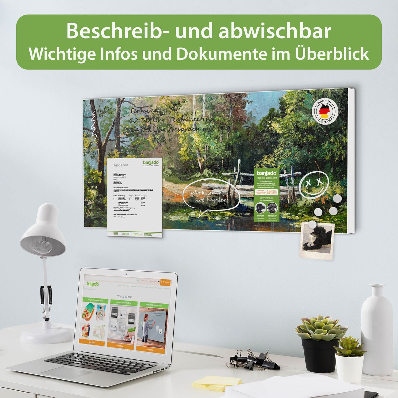 FUNKTION: Die banjado Magnettafel 78x37 cm im Design Motiv Kleine Brücke vereint Funktionalität und modernes Wohndesign auf stilvolle Weise. Diese hochwertige Magnetwand aus Metall hilft Ihnen dabei, Notizen, Fotos, Termine, Einkaufslisten oder Rezepte übersichtlich zu organisieren. Als praktisches Memoboard sorgt sie für Struktur im Alltag und setzt gleichzeitig einen dekorativen Akzent an Ihrer Wand. DESIGN: Die Metalltafel besteht aus robustem, lackiertem Stahl und ist mit allen handelsüblichen Magneten nutzbar. Besonders praktisch ist die beschreibbare Oberfläche. Sie können die Magnettafel ganz einfach mit Kreidestiften beschriften und die Inhalte bei Bedarf mit einem feuchten Tuch wieder entfernen. So eignet sich das Memoboard ideal für Wochenpläne, Menüpläne, To Do Listen oder kreative Botschaften. DETAILS: Mit ihrem großzügigen Querformat von 78x37 cm bietet die Magnettafel ausreichend Platz für Ihre Organisation. Das Motiv Motiv Kleine Brücke bringt eine warme, natürliche Optik in Küche, Flur, Büro oder Homeoffice und wirkt auch ohne Magnete oder Beschriftung wie ein modernes Wandbild. NUTZEN: Auf der Rückseite befinden sich vorgefertigte Löcher für eine schnelle und unkomplizierte Wandmontage. Jede banjado Magnettafel wird in Deutschland gefertigt und steht für Qualität, Langlebigkeit und liebevolle Verarbeitung. Dieses beschreibbare Memoboard ist die perfekte Kombination aus Metalltafel, Designobjekt und praktischer Magnetwand für Ihren Alltag. BANJADO: Wir sind ein kleines Team aus dem Herzen von Sachsen. Wir fertigen alle Artikel von Hand für Sie an, Sie erhalten keine preiswerte Importware. Auf Wunsch können Sie auch Ihr eigenes Foto auf die Magnettafel aufbringen, schreiben Sie uns an. Herzlichst, Ihr banjado-Team