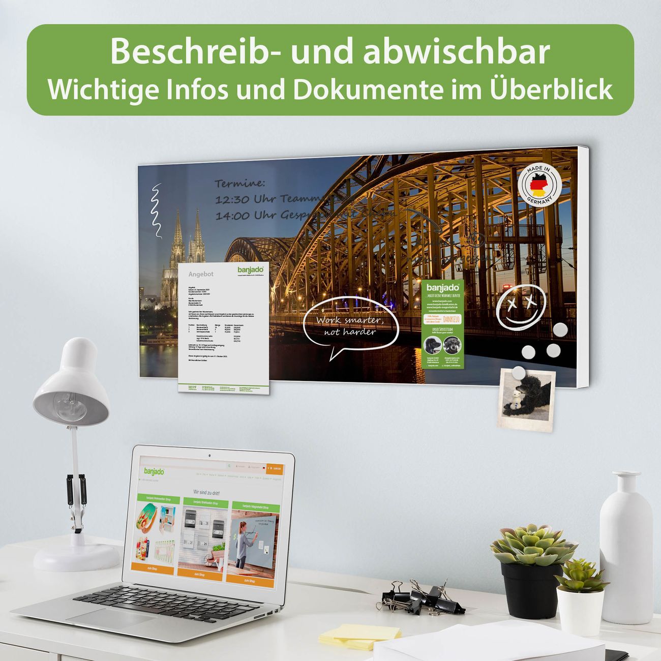 FUNKTION: Die banjado Magnettafel 78x37 cm im Design Motiv Köln vereint Funktionalität und modernes Wohndesign auf stilvolle Weise. Diese hochwertige Magnetwand aus Metall hilft Ihnen dabei, Notizen, Fotos, Termine, Einkaufslisten oder Rezepte übersichtlich zu organisieren. Als praktisches Memoboard sorgt sie für Struktur im Alltag und setzt gleichzeitig einen dekorativen Akzent an Ihrer Wand. DESIGN: Die Metalltafel besteht aus robustem, lackiertem Stahl und ist mit allen handelsüblichen Magneten nutzbar. Besonders praktisch ist die beschreibbare Oberfläche. Sie können die Magnettafel ganz einfach mit Kreidestiften beschriften und die Inhalte bei Bedarf mit einem feuchten Tuch wieder entfernen. So eignet sich das Memoboard ideal für Wochenpläne, Menüpläne, To Do Listen oder kreative Botschaften. DETAILS: Mit ihrem großzügigen Querformat von 78x37 cm bietet die Magnettafel ausreichend Platz für Ihre Organisation. Das Motiv Motiv Köln bringt eine warme, natürliche Optik in Küche, Flur, Büro oder Homeoffice und wirkt auch ohne Magnete oder Beschriftung wie ein modernes Wandbild. NUTZEN: Auf der Rückseite befinden sich vorgefertigte Löcher für eine schnelle und unkomplizierte Wandmontage. Jede banjado Magnettafel wird in Deutschland gefertigt und steht für Qualität, Langlebigkeit und liebevolle Verarbeitung. Dieses beschreibbare Memoboard ist die perfekte Kombination aus Metalltafel, Designobjekt und praktischer Magnetwand für Ihren Alltag. BANJADO: Wir sind ein kleines Team aus dem Herzen von Sachsen. Wir fertigen alle Artikel von Hand für Sie an, Sie erhalten keine preiswerte Importware. Auf Wunsch können Sie auch Ihr eigenes Foto auf die Magnettafel aufbringen, schreiben Sie uns an. Herzlichst, Ihr banjado-Team