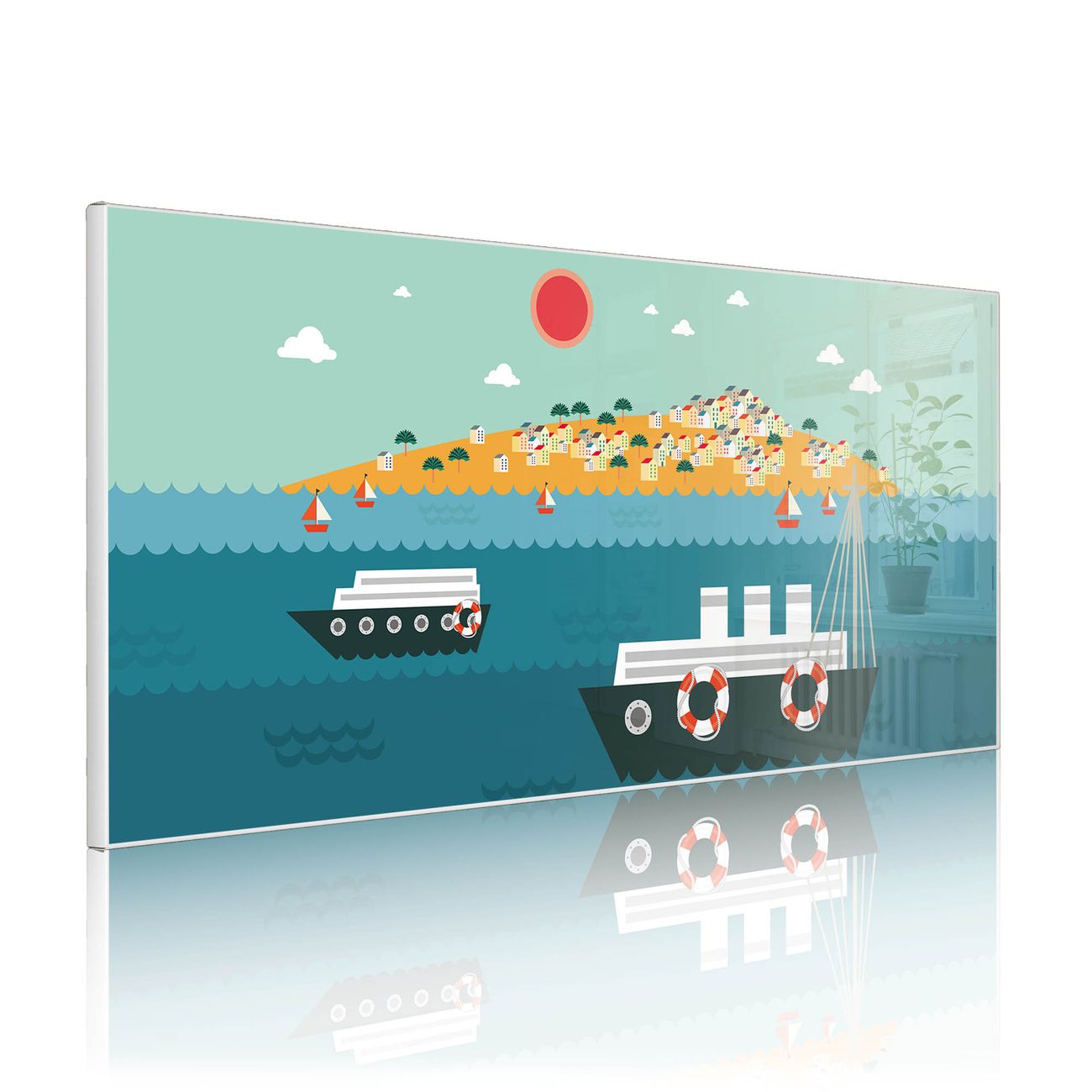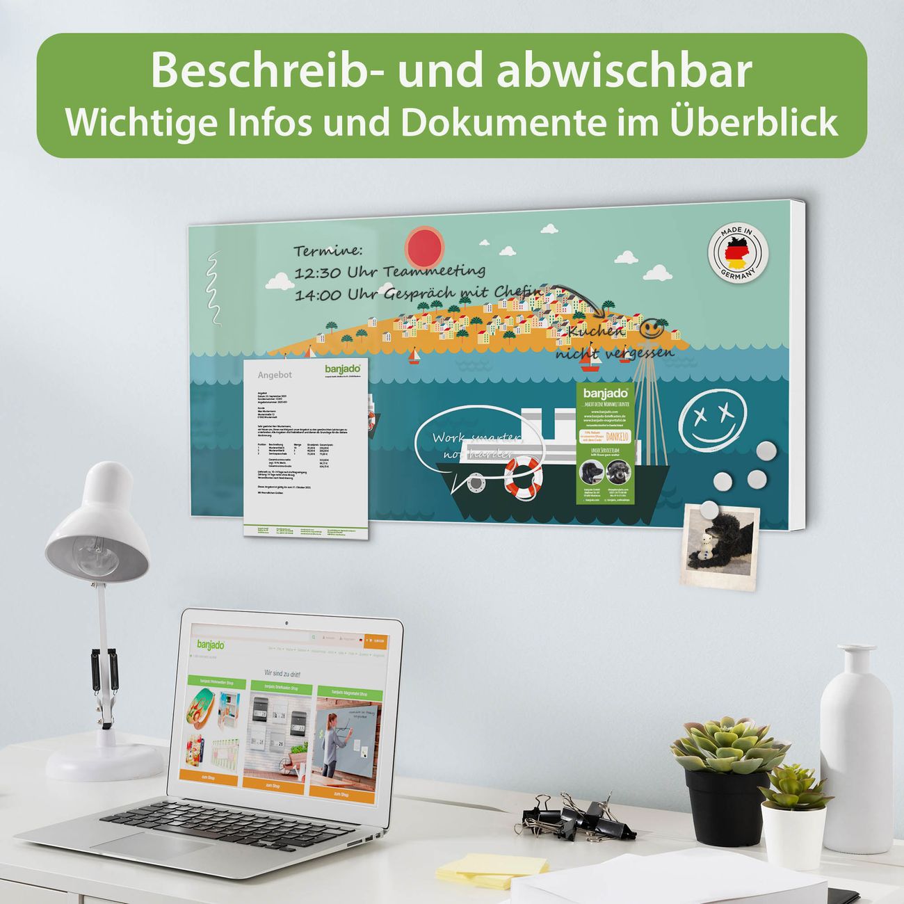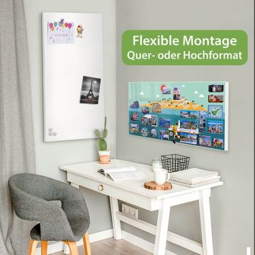 FUNKTION: Die banjado Magnettafel 78x37 cm im Design Motiv Land in Sicht vereint Funktionalität und modernes Wohndesign auf stilvolle Weise. Diese hochwertige Magnetwand aus Metall hilft Ihnen dabei, Notizen, Fotos, Termine, Einkaufslisten oder Rezepte übersichtlich zu organisieren. Als praktisches Memoboard sorgt sie für Struktur im Alltag und setzt gleichzeitig einen dekorativen Akzent an Ihrer Wand. DESIGN: Die Metalltafel besteht aus robustem, lackiertem Stahl und ist mit allen handelsüblichen Magneten nutzbar. Besonders praktisch ist die beschreibbare Oberfläche. Sie können die Magnettafel ganz einfach mit Kreidestiften beschriften und die Inhalte bei Bedarf mit einem feuchten Tuch wieder entfernen. So eignet sich das Memoboard ideal für Wochenpläne, Menüpläne, To Do Listen oder kreative Botschaften. DETAILS: Mit ihrem großzügigen Querformat von 78x37 cm bietet die Magnettafel ausreichend Platz für Ihre Organisation. Das Motiv Motiv Land in Sicht bringt eine warme, natürliche Optik in Küche, Flur, Büro oder Homeoffice und wirkt auch ohne Magnete oder Beschriftung wie ein modernes Wandbild. NUTZEN: Auf der Rückseite befinden sich vorgefertigte Löcher für eine schnelle und unkomplizierte Wandmontage. Jede banjado Magnettafel wird in Deutschland gefertigt und steht für Qualität, Langlebigkeit und liebevolle Verarbeitung. Dieses beschreibbare Memoboard ist die perfekte Kombination aus Metalltafel, Designobjekt und praktischer Magnetwand für Ihren Alltag. BANJADO: Wir sind ein kleines Team aus dem Herzen von Sachsen. Wir fertigen alle Artikel von Hand für Sie an, Sie erhalten keine preiswerte Importware. Auf Wunsch können Sie auch Ihr eigenes Foto auf die Magnettafel aufbringen, schreiben Sie uns an. Herzlichst, Ihr banjado-Team