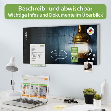 FUNKTION: Die banjado Magnettafel 78x37 cm im Design Motiv Leuchte vereint Funktionalität und modernes Wohndesign auf stilvolle Weise. Diese hochwertige Magnetwand aus Metall hilft Ihnen dabei, Notizen, Fotos, Termine, Einkaufslisten oder Rezepte übersichtlich zu organisieren. Als praktisches Memoboard sorgt sie für Struktur im Alltag und setzt gleichzeitig einen dekorativen Akzent an Ihrer Wand. DESIGN: Die Metalltafel besteht aus robustem, lackiertem Stahl und ist mit allen handelsüblichen Magneten nutzbar. Besonders praktisch ist die beschreibbare Oberfläche. Sie können die Magnettafel ganz einfach mit Kreidestiften beschriften und die Inhalte bei Bedarf mit einem feuchten Tuch wieder entfernen. So eignet sich das Memoboard ideal für Wochenpläne, Menüpläne, To Do Listen oder kreative Botschaften. DETAILS: Mit ihrem großzügigen Querformat von 78x37 cm bietet die Magnettafel ausreichend Platz für Ihre Organisation. Das Motiv Motiv Leuchte bringt eine warme, natürliche Optik in Küche, Flur, Büro oder Homeoffice und wirkt auch ohne Magnete oder Beschriftung wie ein modernes Wandbild. NUTZEN: Auf der Rückseite befinden sich vorgefertigte Löcher für eine schnelle und unkomplizierte Wandmontage. Jede banjado Magnettafel wird in Deutschland gefertigt und steht für Qualität, Langlebigkeit und liebevolle Verarbeitung. Dieses beschreibbare Memoboard ist die perfekte Kombination aus Metalltafel, Designobjekt und praktischer Magnetwand für Ihren Alltag. BANJADO: Wir sind ein kleines Team aus dem Herzen von Sachsen. Wir fertigen alle Artikel von Hand für Sie an, Sie erhalten keine preiswerte Importware. Auf Wunsch können Sie auch Ihr eigenes Foto auf die Magnettafel aufbringen, schreiben Sie uns an. Herzlichst, Ihr banjado-Team