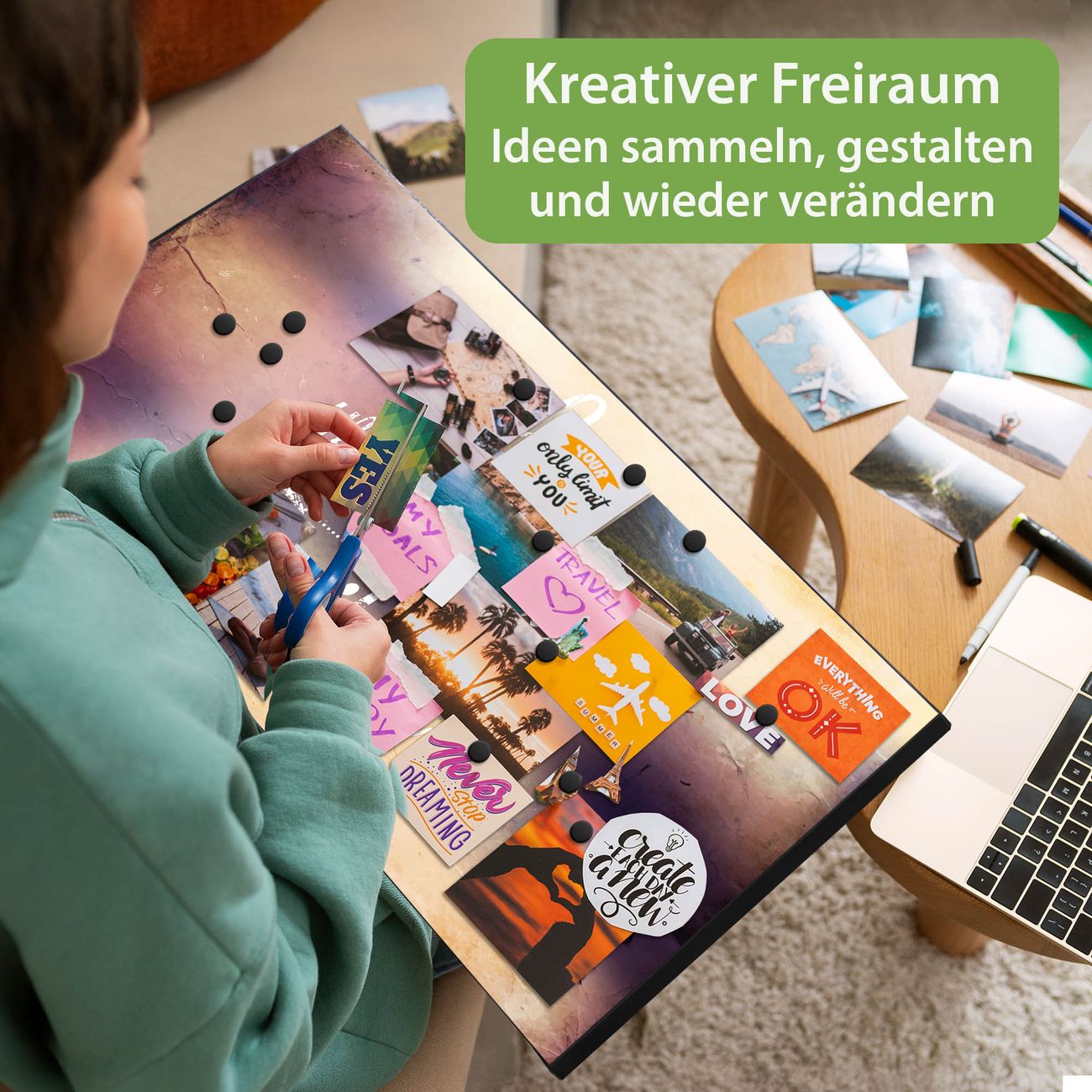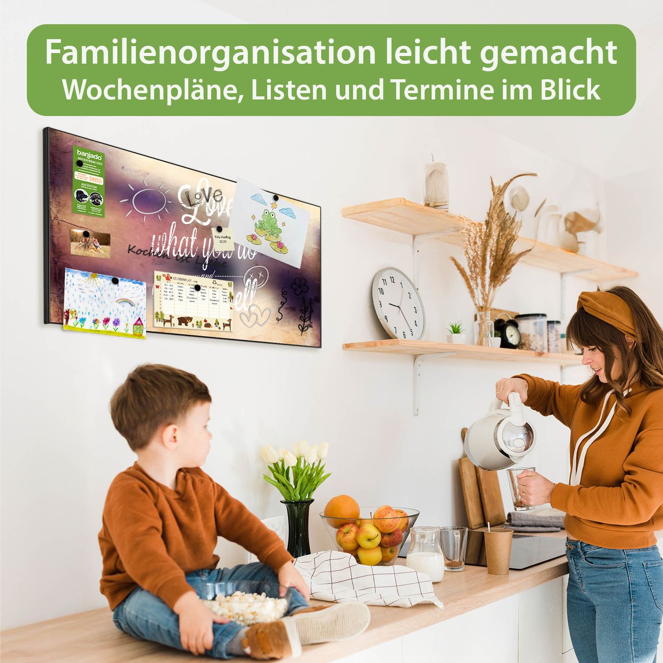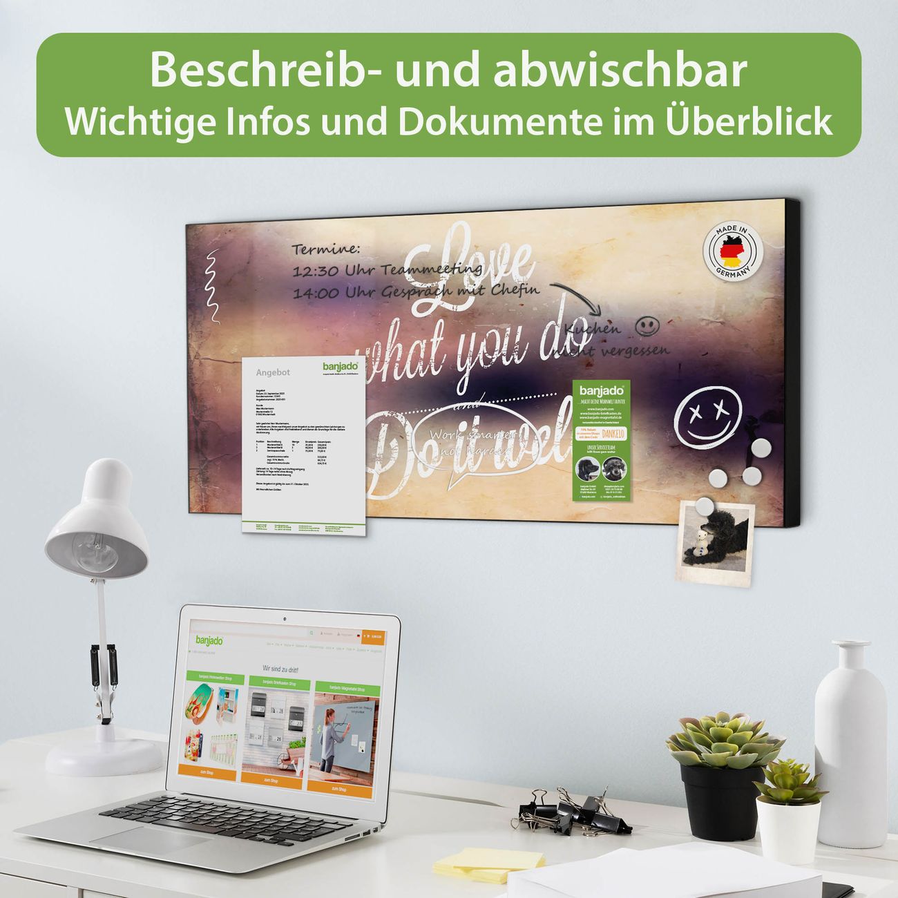 FUNKTION: Die banjado Magnettafel 78x37 cm im Design Motiv Love What You Do vereint Funktionalität und modernes Wohndesign auf stilvolle Weise. Diese hochwertige Magnetwand aus Metall hilft Ihnen dabei, Notizen, Fotos, Termine, Einkaufslisten oder Rezepte übersichtlich zu organisieren. Als praktisches Memoboard sorgt sie für Struktur im Alltag und setzt gleichzeitig einen dekorativen Akzent an Ihrer Wand. DESIGN: Die Metalltafel besteht aus robustem, lackiertem Stahl und ist mit allen handelsüblichen Magneten nutzbar. Besonders praktisch ist die beschreibbare Oberfläche. Sie können die Magnettafel ganz einfach mit Kreidestiften beschriften und die Inhalte bei Bedarf mit einem feuchten Tuch wieder entfernen. So eignet sich das Memoboard ideal für Wochenpläne, Menüpläne, To Do Listen oder kreative Botschaften. DETAILS: Mit ihrem großzügigen Querformat von 78x37 cm bietet die Magnettafel ausreichend Platz für Ihre Organisation. Das Motiv Motiv Love What You Do bringt eine warme, natürliche Optik in Küche, Flur, Büro oder Homeoffice und wirkt auch ohne Magnete oder Beschriftung wie ein modernes Wandbild. NUTZEN: Auf der Rückseite befinden sich vorgefertigte Löcher für eine schnelle und unkomplizierte Wandmontage. Jede banjado Magnettafel wird in Deutschland gefertigt und steht für Qualität, Langlebigkeit und liebevolle Verarbeitung. Dieses beschreibbare Memoboard ist die perfekte Kombination aus Metalltafel, Designobjekt und praktischer Magnetwand für Ihren Alltag. BANJADO: Wir sind ein kleines Team aus dem Herzen von Sachsen. Wir fertigen alle Artikel von Hand für Sie an, Sie erhalten keine preiswerte Importware. Auf Wunsch können Sie auch Ihr eigenes Foto auf die Magnettafel aufbringen, schreiben Sie uns an. Herzlichst, Ihr banjado-Team