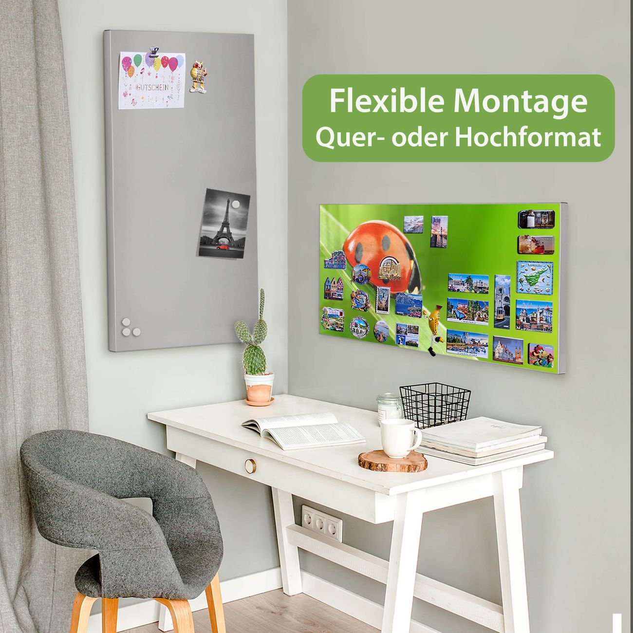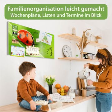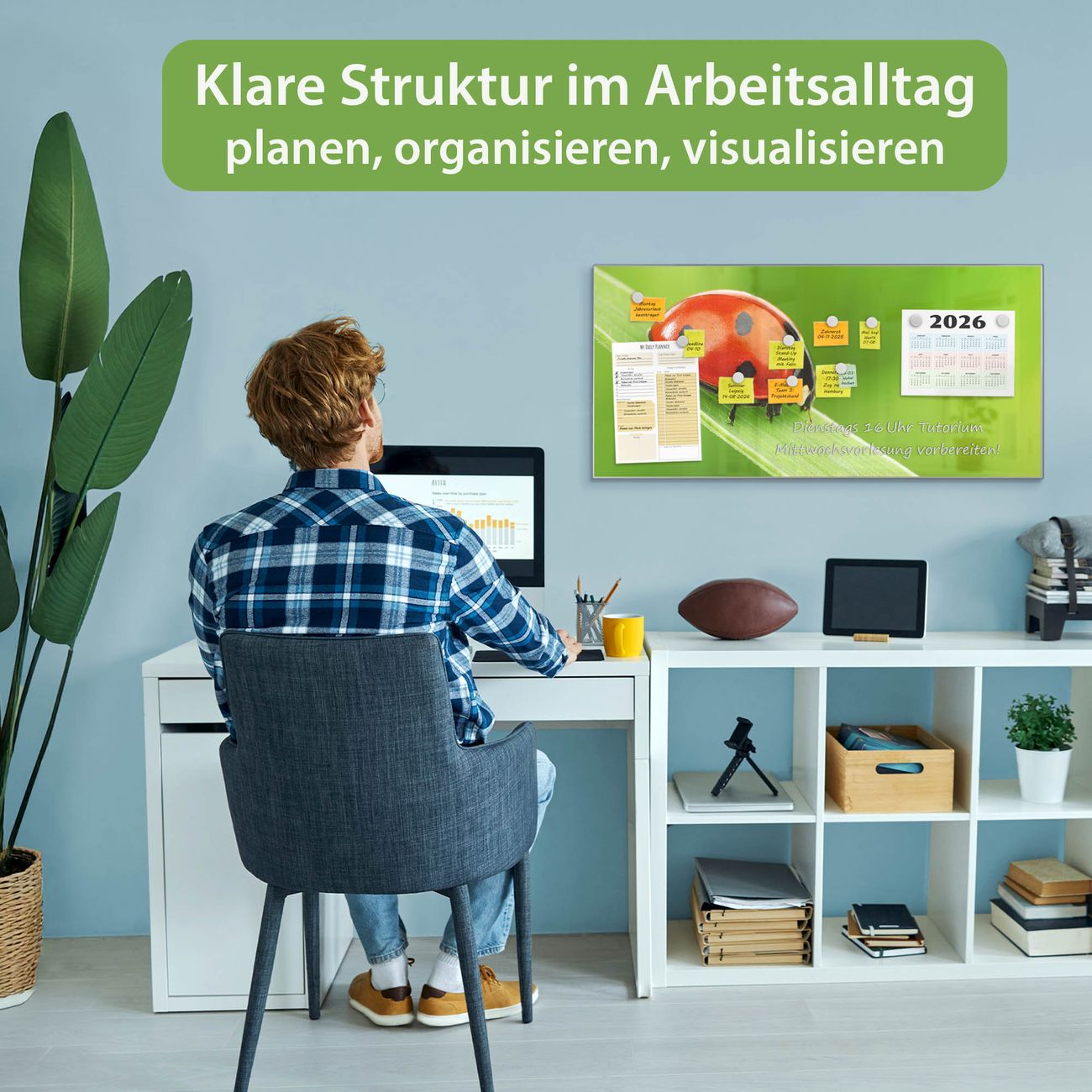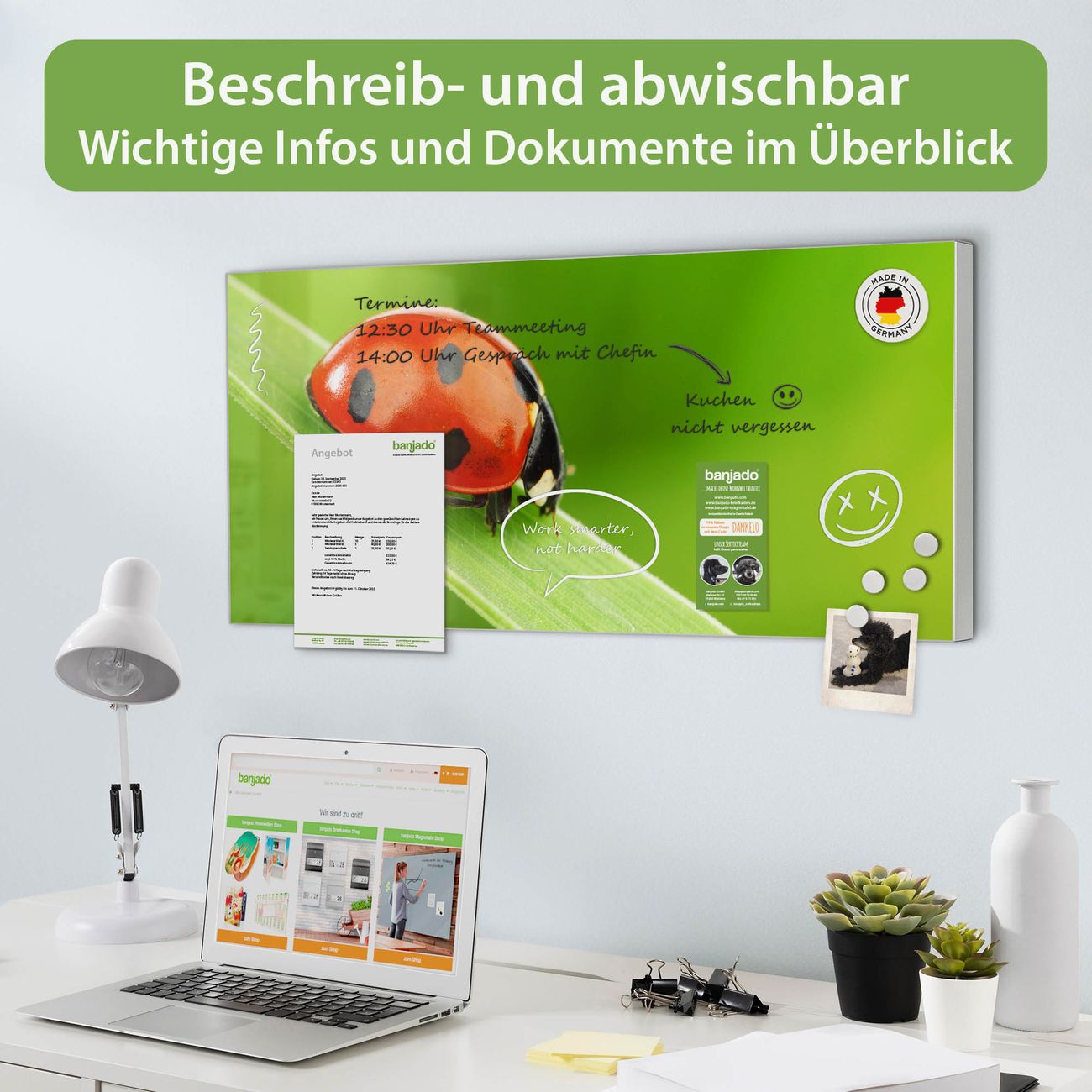 FUNKTION: Die banjado Magnettafel 78x37 cm im Design Motiv Marienkäfer vereint Funktionalität und modernes Wohndesign auf stilvolle Weise. Diese hochwertige Magnetwand aus Metall hilft Ihnen dabei, Notizen, Fotos, Termine, Einkaufslisten oder Rezepte übersichtlich zu organisieren. Als praktisches Memoboard sorgt sie für Struktur im Alltag und setzt gleichzeitig einen dekorativen Akzent an Ihrer Wand. DESIGN: Die Metalltafel besteht aus robustem, lackiertem Stahl und ist mit allen handelsüblichen Magneten nutzbar. Besonders praktisch ist die beschreibbare Oberfläche. Sie können die Magnettafel ganz einfach mit Kreidestiften beschriften und die Inhalte bei Bedarf mit einem feuchten Tuch wieder entfernen. So eignet sich das Memoboard ideal für Wochenpläne, Menüpläne, To Do Listen oder kreative Botschaften. DETAILS: Mit ihrem großzügigen Querformat von 78x37 cm bietet die Magnettafel ausreichend Platz für Ihre Organisation. Das Motiv Motiv Marienkäfer bringt eine warme, natürliche Optik in Küche, Flur, Büro oder Homeoffice und wirkt auch ohne Magnete oder Beschriftung wie ein modernes Wandbild. NUTZEN: Auf der Rückseite befinden sich vorgefertigte Löcher für eine schnelle und unkomplizierte Wandmontage. Jede banjado Magnettafel wird in Deutschland gefertigt und steht für Qualität, Langlebigkeit und liebevolle Verarbeitung. Dieses beschreibbare Memoboard ist die perfekte Kombination aus Metalltafel, Designobjekt und praktischer Magnetwand für Ihren Alltag. BANJADO: Wir sind ein kleines Team aus dem Herzen von Sachsen. Wir fertigen alle Artikel von Hand für Sie an, Sie erhalten keine preiswerte Importware. Auf Wunsch können Sie auch Ihr eigenes Foto auf die Magnettafel aufbringen, schreiben Sie uns an. Herzlichst, Ihr banjado-Team