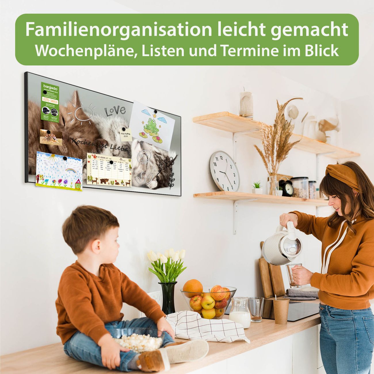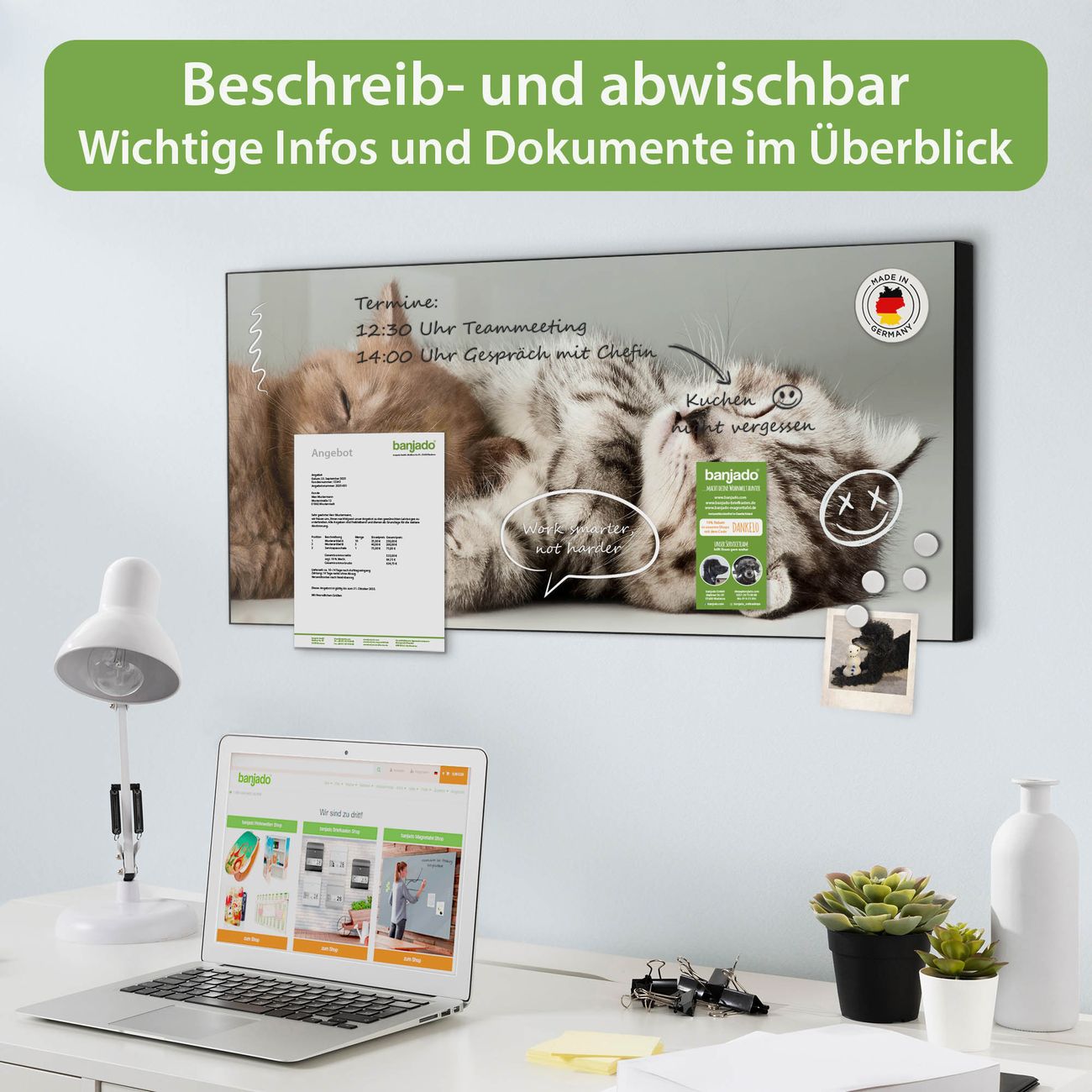 FUNKTION: Die banjado Magnettafel 78x37 cm im Design Motiv Mini Und Jerry vereint Funktionalität und modernes Wohndesign auf stilvolle Weise. Diese hochwertige Magnetwand aus Metall hilft Ihnen dabei, Notizen, Fotos, Termine, Einkaufslisten oder Rezepte übersichtlich zu organisieren. Als praktisches Memoboard sorgt sie für Struktur im Alltag und setzt gleichzeitig einen dekorativen Akzent an Ihrer Wand. DESIGN: Die Metalltafel besteht aus robustem, lackiertem Stahl und ist mit allen handelsüblichen Magneten nutzbar. Besonders praktisch ist die beschreibbare Oberfläche. Sie können die Magnettafel ganz einfach mit Kreidestiften beschriften und die Inhalte bei Bedarf mit einem feuchten Tuch wieder entfernen. So eignet sich das Memoboard ideal für Wochenpläne, Menüpläne, To Do Listen oder kreative Botschaften. DETAILS: Mit ihrem großzügigen Querformat von 78x37 cm bietet die Magnettafel ausreichend Platz für Ihre Organisation. Das Motiv Motiv Mini Und Jerry bringt eine warme, natürliche Optik in Küche, Flur, Büro oder Homeoffice und wirkt auch ohne Magnete oder Beschriftung wie ein modernes Wandbild. NUTZEN: Auf der Rückseite befinden sich vorgefertigte Löcher für eine schnelle und unkomplizierte Wandmontage. Jede banjado Magnettafel wird in Deutschland gefertigt und steht für Qualität, Langlebigkeit und liebevolle Verarbeitung. Dieses beschreibbare Memoboard ist die perfekte Kombination aus Metalltafel, Designobjekt und praktischer Magnetwand für Ihren Alltag. BANJADO: Wir sind ein kleines Team aus dem Herzen von Sachsen. Wir fertigen alle Artikel von Hand für Sie an, Sie erhalten keine preiswerte Importware. Auf Wunsch können Sie auch Ihr eigenes Foto auf die Magnettafel aufbringen, schreiben Sie uns an. Herzlichst, Ihr banjado-Team
