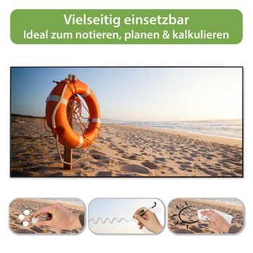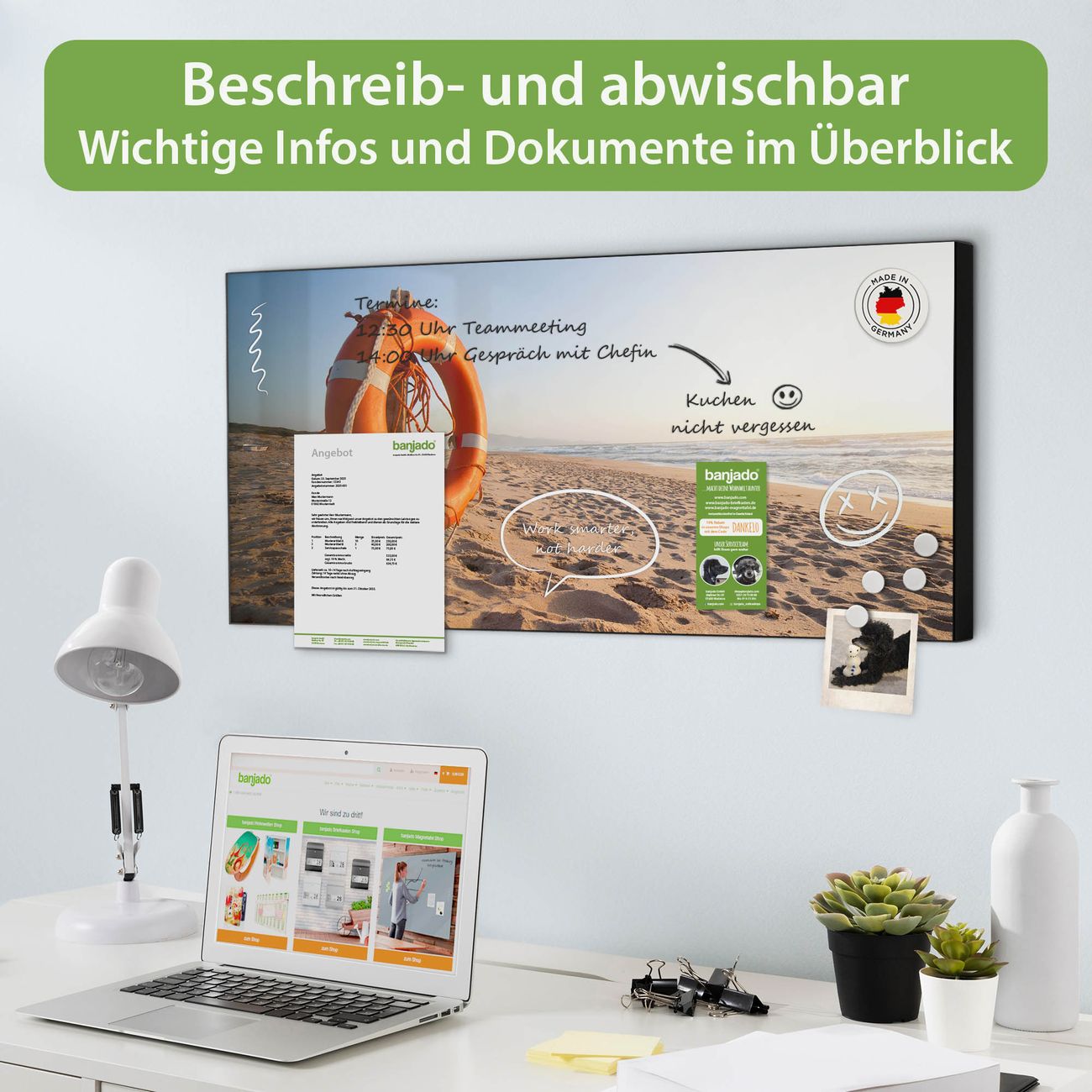 FUNKTION: Die banjado Magnettafel 78x37 cm im Design Motiv Morgens Am Strand vereint Funktionalität und modernes Wohndesign auf stilvolle Weise. Diese hochwertige Magnetwand aus Metall hilft Ihnen dabei, Notizen, Fotos, Termine, Einkaufslisten oder Rezepte übersichtlich zu organisieren. Als praktisches Memoboard sorgt sie für Struktur im Alltag und setzt gleichzeitig einen dekorativen Akzent an Ihrer Wand. DESIGN: Die Metalltafel besteht aus robustem, lackiertem Stahl und ist mit allen handelsüblichen Magneten nutzbar. Besonders praktisch ist die beschreibbare Oberfläche. Sie können die Magnettafel ganz einfach mit Kreidestiften beschriften und die Inhalte bei Bedarf mit einem feuchten Tuch wieder entfernen. So eignet sich das Memoboard ideal für Wochenpläne, Menüpläne, To Do Listen oder kreative Botschaften. DETAILS: Mit ihrem großzügigen Querformat von 78x37 cm bietet die Magnettafel ausreichend Platz für Ihre Organisation. Das Motiv Motiv Morgens Am Strand bringt eine warme, natürliche Optik in Küche, Flur, Büro oder Homeoffice und wirkt auch ohne Magnete oder Beschriftung wie ein modernes Wandbild. NUTZEN: Auf der Rückseite befinden sich vorgefertigte Löcher für eine schnelle und unkomplizierte Wandmontage. Jede banjado Magnettafel wird in Deutschland gefertigt und steht für Qualität, Langlebigkeit und liebevolle Verarbeitung. Dieses beschreibbare Memoboard ist die perfekte Kombination aus Metalltafel, Designobjekt und praktischer Magnetwand für Ihren Alltag. BANJADO: Wir sind ein kleines Team aus dem Herzen von Sachsen. Wir fertigen alle Artikel von Hand für Sie an, Sie erhalten keine preiswerte Importware. Auf Wunsch können Sie auch Ihr eigenes Foto auf die Magnettafel aufbringen, schreiben Sie uns an. Herzlichst, Ihr banjado-Team