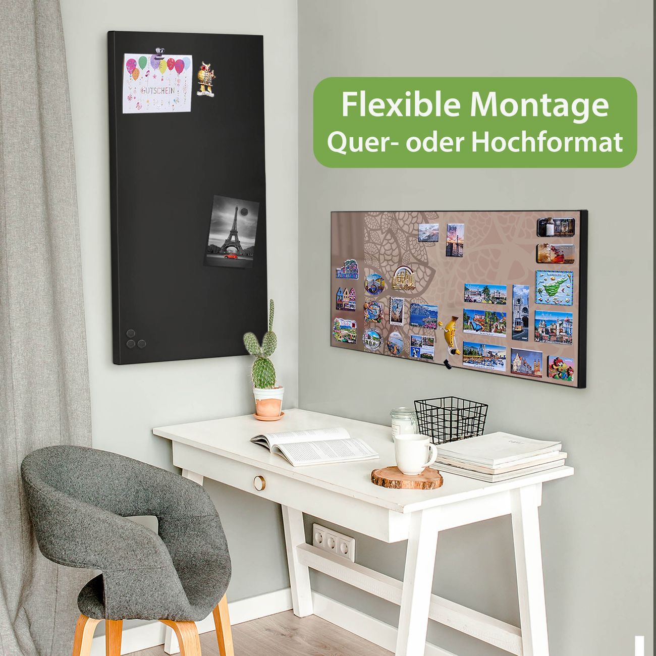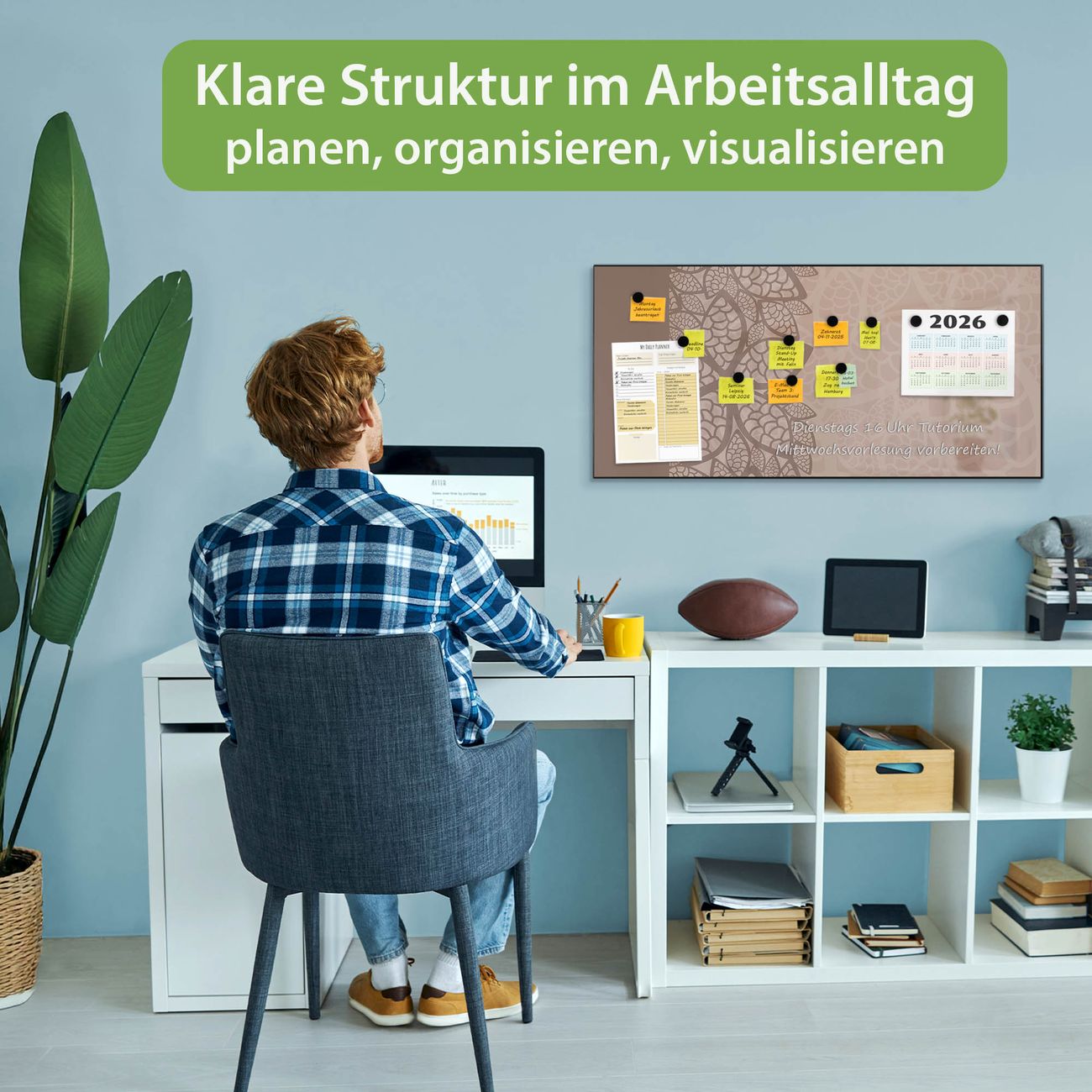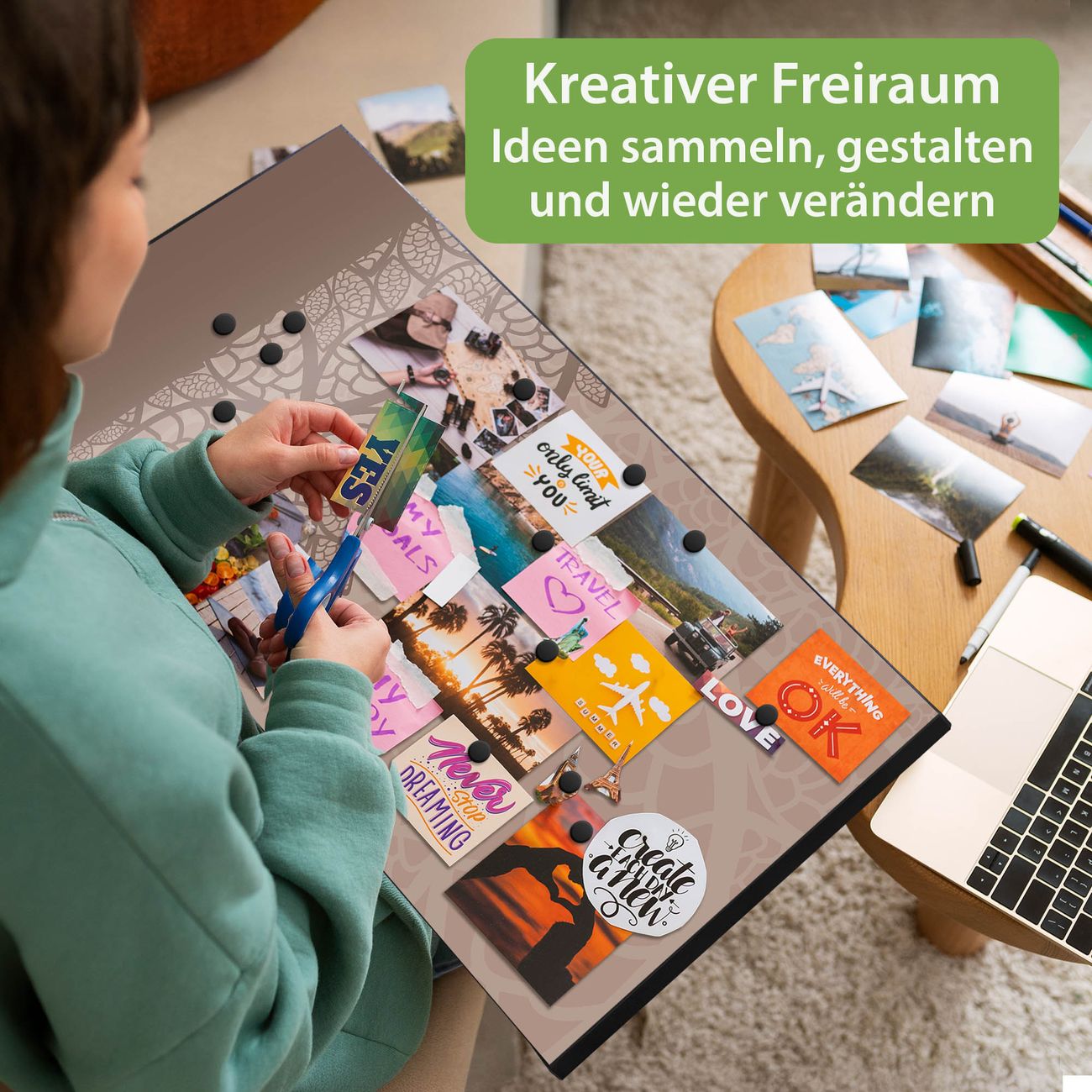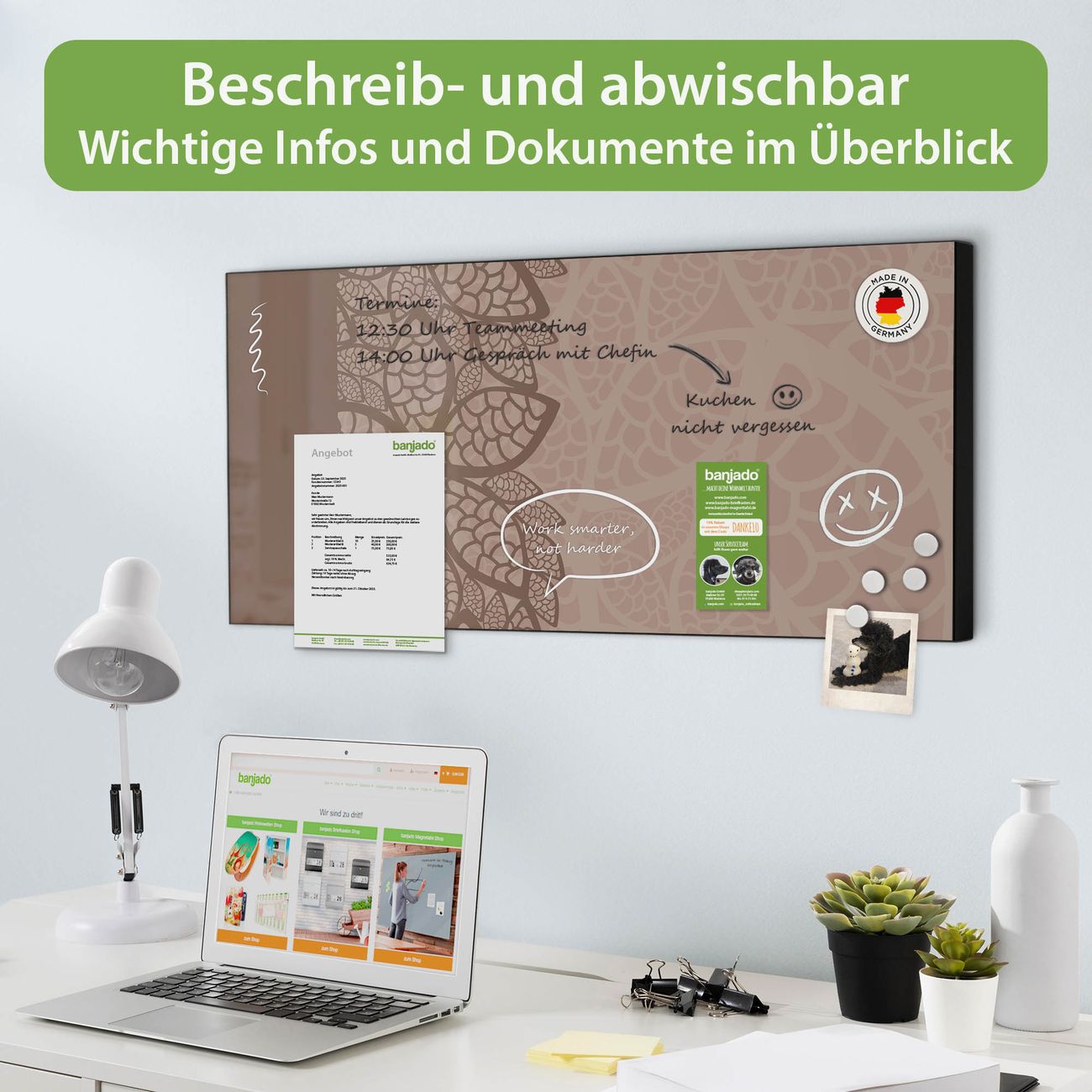FUNKTION: Die banjado Magnettafel 78x37 cm im Design Motiv Muster Blätter vereint Funktionalität und modernes Wohndesign auf stilvolle Weise. Diese hochwertige Magnetwand aus Metall hilft Ihnen dabei, Notizen, Fotos, Termine, Einkaufslisten oder Rezepte übersichtlich zu organisieren. Als praktisches Memoboard sorgt sie für Struktur im Alltag und setzt gleichzeitig einen dekorativen Akzent an Ihrer Wand. DESIGN: Die Metalltafel besteht aus robustem, lackiertem Stahl und ist mit allen handelsüblichen Magneten nutzbar. Besonders praktisch ist die beschreibbare Oberfläche. Sie können die Magnettafel ganz einfach mit Kreidestiften beschriften und die Inhalte bei Bedarf mit einem feuchten Tuch wieder entfernen. So eignet sich das Memoboard ideal für Wochenpläne, Menüpläne, To Do Listen oder kreative Botschaften. DETAILS: Mit ihrem großzügigen Querformat von 78x37 cm bietet die Magnettafel ausreichend Platz für Ihre Organisation. Das Motiv Motiv Muster Blätter bringt eine warme, natürliche Optik in Küche, Flur, Büro oder Homeoffice und wirkt auch ohne Magnete oder Beschriftung wie ein modernes Wandbild. NUTZEN: Auf der Rückseite befinden sich vorgefertigte Löcher für eine schnelle und unkomplizierte Wandmontage. Jede banjado Magnettafel wird in Deutschland gefertigt und steht für Qualität, Langlebigkeit und liebevolle Verarbeitung. Dieses beschreibbare Memoboard ist die perfekte Kombination aus Metalltafel, Designobjekt und praktischer Magnetwand für Ihren Alltag. BANJADO: Wir sind ein kleines Team aus dem Herzen von Sachsen. Wir fertigen alle Artikel von Hand für Sie an, Sie erhalten keine preiswerte Importware. Auf Wunsch können Sie auch Ihr eigenes Foto auf die Magnettafel aufbringen, schreiben Sie uns an. Herzlichst, Ihr banjado-Team