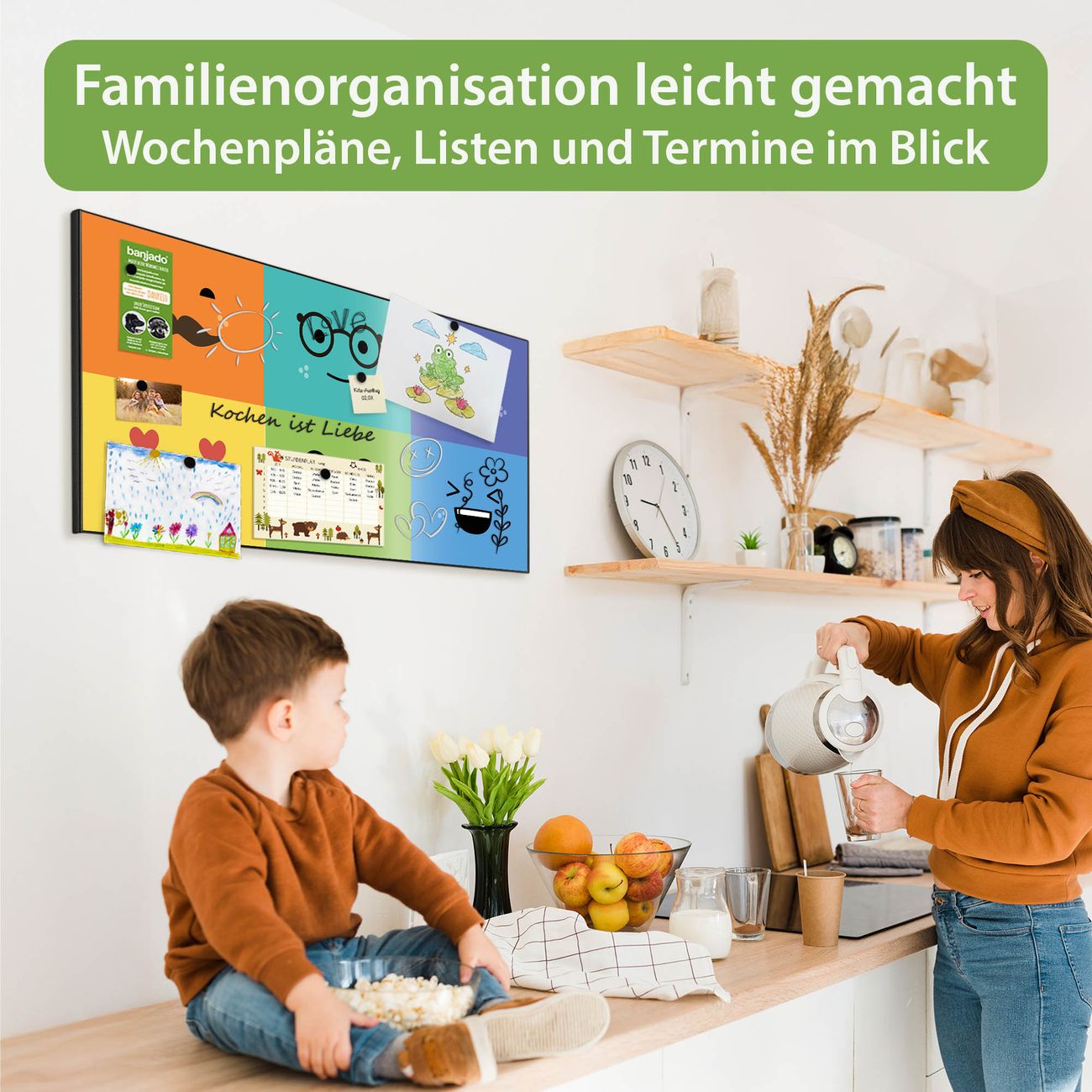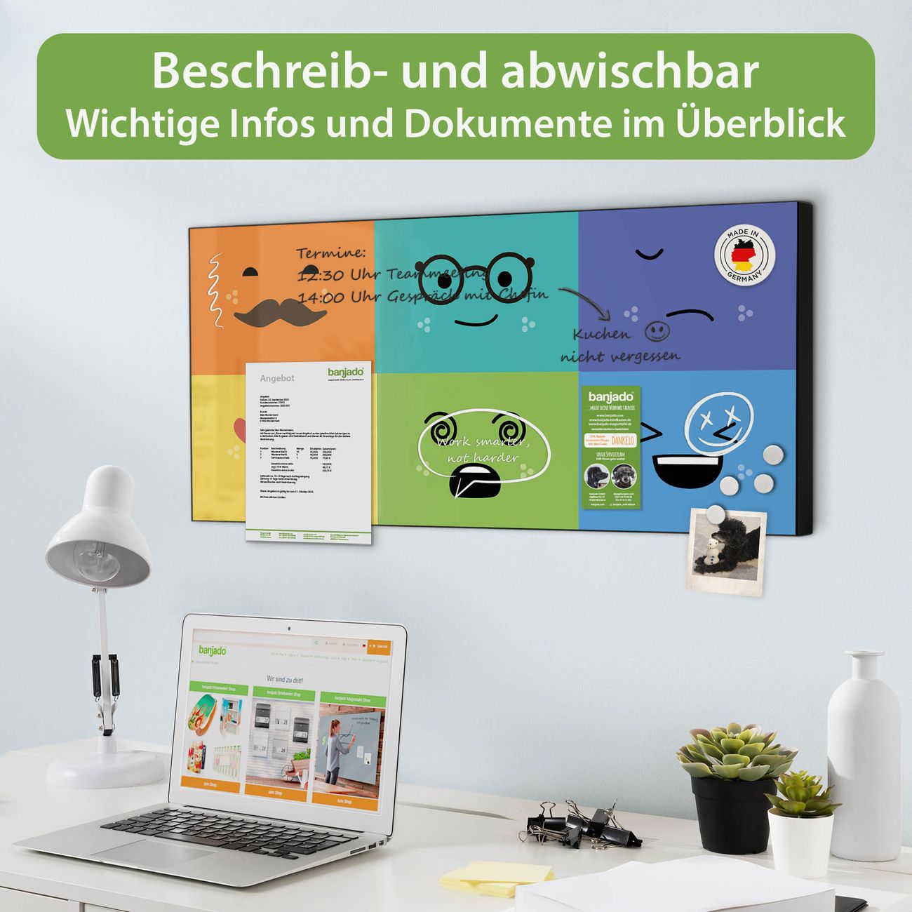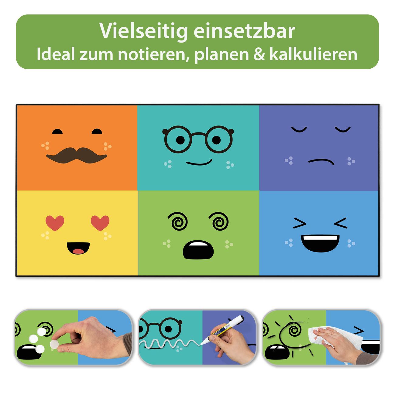 FUNKTION: Die banjado Magnettafel 78x37 cm im Design Motiv Neun Keinenasen vereint Funktionalität und modernes Wohndesign auf stilvolle Weise. Diese hochwertige Magnetwand aus Metall hilft Ihnen dabei, Notizen, Fotos, Termine, Einkaufslisten oder Rezepte übersichtlich zu organisieren. Als praktisches Memoboard sorgt sie für Struktur im Alltag und setzt gleichzeitig einen dekorativen Akzent an Ihrer Wand. DESIGN: Die Metalltafel besteht aus robustem, lackiertem Stahl und ist mit allen handelsüblichen Magneten nutzbar. Besonders praktisch ist die beschreibbare Oberfläche. Sie können die Magnettafel ganz einfach mit Kreidestiften beschriften und die Inhalte bei Bedarf mit einem feuchten Tuch wieder entfernen. So eignet sich das Memoboard ideal für Wochenpläne, Menüpläne, To Do Listen oder kreative Botschaften. DETAILS: Mit ihrem großzügigen Querformat von 78x37 cm bietet die Magnettafel ausreichend Platz für Ihre Organisation. Das Motiv Motiv Neun Keinenasen bringt eine warme, natürliche Optik in Küche, Flur, Büro oder Homeoffice und wirkt auch ohne Magnete oder Beschriftung wie ein modernes Wandbild. NUTZEN: Auf der Rückseite befinden sich vorgefertigte Löcher für eine schnelle und unkomplizierte Wandmontage. Jede banjado Magnettafel wird in Deutschland gefertigt und steht für Qualität, Langlebigkeit und liebevolle Verarbeitung. Dieses beschreibbare Memoboard ist die perfekte Kombination aus Metalltafel, Designobjekt und praktischer Magnetwand für Ihren Alltag. BANJADO: Wir sind ein kleines Team aus dem Herzen von Sachsen. Wir fertigen alle Artikel von Hand für Sie an, Sie erhalten keine preiswerte Importware. Auf Wunsch können Sie auch Ihr eigenes Foto auf die Magnettafel aufbringen, schreiben Sie uns an. Herzlichst, Ihr banjado-Team