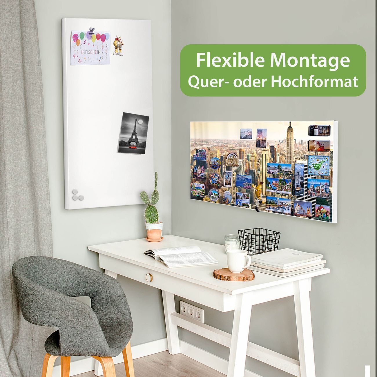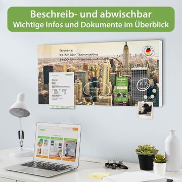 FUNKTION: Die banjado Magnettafel 78x37 cm im Design Motiv New York City vereint Funktionalität und modernes Wohndesign auf stilvolle Weise. Diese hochwertige Magnetwand aus Metall hilft Ihnen dabei, Notizen, Fotos, Termine, Einkaufslisten oder Rezepte übersichtlich zu organisieren. Als praktisches Memoboard sorgt sie für Struktur im Alltag und setzt gleichzeitig einen dekorativen Akzent an Ihrer Wand. DESIGN: Die Metalltafel besteht aus robustem, lackiertem Stahl und ist mit allen handelsüblichen Magneten nutzbar. Besonders praktisch ist die beschreibbare Oberfläche. Sie können die Magnettafel ganz einfach mit Kreidestiften beschriften und die Inhalte bei Bedarf mit einem feuchten Tuch wieder entfernen. So eignet sich das Memoboard ideal für Wochenpläne, Menüpläne, To Do Listen oder kreative Botschaften. DETAILS: Mit ihrem großzügigen Querformat von 78x37 cm bietet die Magnettafel ausreichend Platz für Ihre Organisation. Das Motiv Motiv New York City bringt eine warme, natürliche Optik in Küche, Flur, Büro oder Homeoffice und wirkt auch ohne Magnete oder Beschriftung wie ein modernes Wandbild. NUTZEN: Auf der Rückseite befinden sich vorgefertigte Löcher für eine schnelle und unkomplizierte Wandmontage. Jede banjado Magnettafel wird in Deutschland gefertigt und steht für Qualität, Langlebigkeit und liebevolle Verarbeitung. Dieses beschreibbare Memoboard ist die perfekte Kombination aus Metalltafel, Designobjekt und praktischer Magnetwand für Ihren Alltag. BANJADO: Wir sind ein kleines Team aus dem Herzen von Sachsen. Wir fertigen alle Artikel von Hand für Sie an, Sie erhalten keine preiswerte Importware. Auf Wunsch können Sie auch Ihr eigenes Foto auf die Magnettafel aufbringen, schreiben Sie uns an. Herzlichst, Ihr banjado-Team