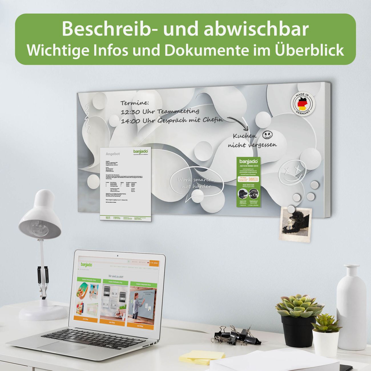 FUNKTION: Die banjado Magnettafel 78x37 cm im Design Motiv Papiertropfen vereint Funktionalität und modernes Wohndesign auf stilvolle Weise. Diese hochwertige Magnetwand aus Metall hilft Ihnen dabei, Notizen, Fotos, Termine, Einkaufslisten oder Rezepte übersichtlich zu organisieren. Als praktisches Memoboard sorgt sie für Struktur im Alltag und setzt gleichzeitig einen dekorativen Akzent an Ihrer Wand. DESIGN: Die Metalltafel besteht aus robustem, lackiertem Stahl und ist mit allen handelsüblichen Magneten nutzbar. Besonders praktisch ist die beschreibbare Oberfläche. Sie können die Magnettafel ganz einfach mit Kreidestiften beschriften und die Inhalte bei Bedarf mit einem feuchten Tuch wieder entfernen. So eignet sich das Memoboard ideal für Wochenpläne, Menüpläne, To Do Listen oder kreative Botschaften. DETAILS: Mit ihrem großzügigen Querformat von 78x37 cm bietet die Magnettafel ausreichend Platz für Ihre Organisation. Das Motiv Motiv Papiertropfen bringt eine warme, natürliche Optik in Küche, Flur, Büro oder Homeoffice und wirkt auch ohne Magnete oder Beschriftung wie ein modernes Wandbild. NUTZEN: Auf der Rückseite befinden sich vorgefertigte Löcher für eine schnelle und unkomplizierte Wandmontage. Jede banjado Magnettafel wird in Deutschland gefertigt und steht für Qualität, Langlebigkeit und liebevolle Verarbeitung. Dieses beschreibbare Memoboard ist die perfekte Kombination aus Metalltafel, Designobjekt und praktischer Magnetwand für Ihren Alltag. BANJADO: Wir sind ein kleines Team aus dem Herzen von Sachsen. Wir fertigen alle Artikel von Hand für Sie an, Sie erhalten keine preiswerte Importware. Auf Wunsch können Sie auch Ihr eigenes Foto auf die Magnettafel aufbringen, schreiben Sie uns an. Herzlichst, Ihr banjado-Team