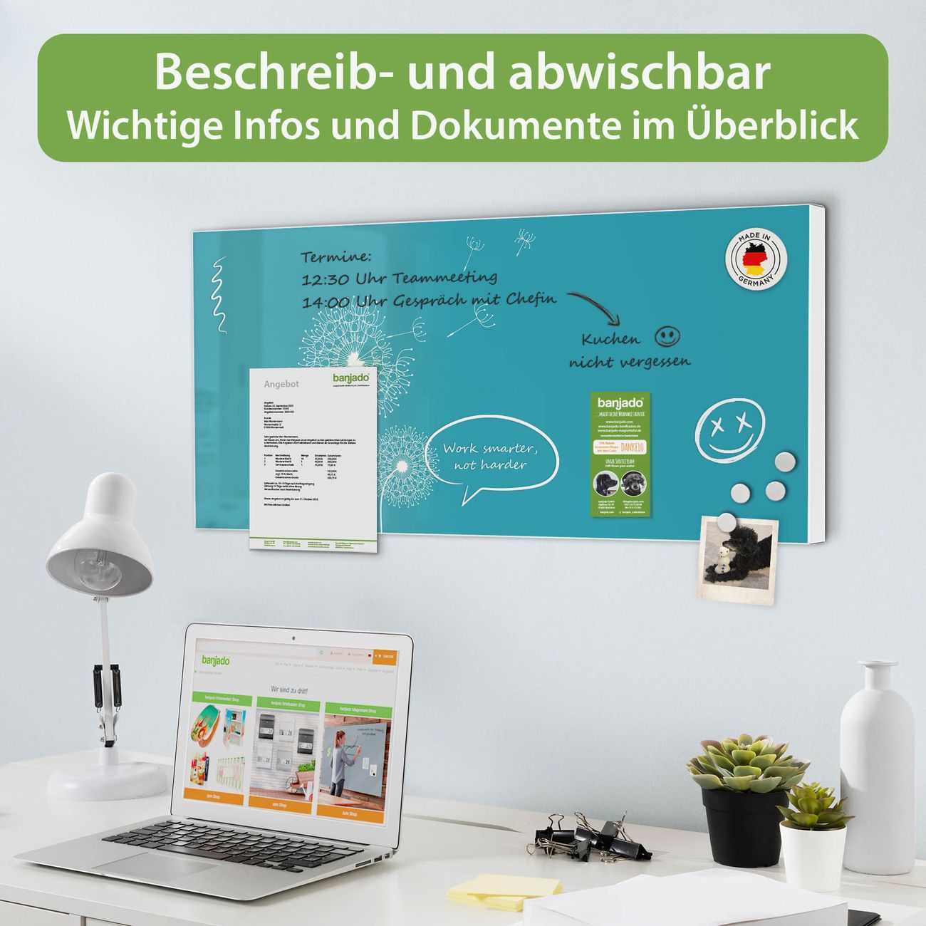 FUNKTION: Die banjado Magnettafel 78x37 cm im Design Motiv Pusteblume 4 vereint Funktionalität und modernes Wohndesign auf stilvolle Weise. Diese hochwertige Magnetwand aus Metall hilft Ihnen dabei, Notizen, Fotos, Termine, Einkaufslisten oder Rezepte übersichtlich zu organisieren. Als praktisches Memoboard sorgt sie für Struktur im Alltag und setzt gleichzeitig einen dekorativen Akzent an Ihrer Wand. DESIGN: Die Metalltafel besteht aus robustem, lackiertem Stahl und ist mit allen handelsüblichen Magneten nutzbar. Besonders praktisch ist die beschreibbare Oberfläche. Sie können die Magnettafel ganz einfach mit Kreidestiften beschriften und die Inhalte bei Bedarf mit einem feuchten Tuch wieder entfernen. So eignet sich das Memoboard ideal für Wochenpläne, Menüpläne, To Do Listen oder kreative Botschaften. DETAILS: Mit ihrem großzügigen Querformat von 78x37 cm bietet die Magnettafel ausreichend Platz für Ihre Organisation. Das Motiv Motiv Pusteblume 4 bringt eine warme, natürliche Optik in Küche, Flur, Büro oder Homeoffice und wirkt auch ohne Magnete oder Beschriftung wie ein modernes Wandbild. NUTZEN: Auf der Rückseite befinden sich vorgefertigte Löcher für eine schnelle und unkomplizierte Wandmontage. Jede banjado Magnettafel wird in Deutschland gefertigt und steht für Qualität, Langlebigkeit und liebevolle Verarbeitung. Dieses beschreibbare Memoboard ist die perfekte Kombination aus Metalltafel, Designobjekt und praktischer Magnetwand für Ihren Alltag. BANJADO: Wir sind ein kleines Team aus dem Herzen von Sachsen. Wir fertigen alle Artikel von Hand für Sie an, Sie erhalten keine preiswerte Importware. Auf Wunsch können Sie auch Ihr eigenes Foto auf die Magnettafel aufbringen, schreiben Sie uns an. Herzlichst, Ihr banjado-Team