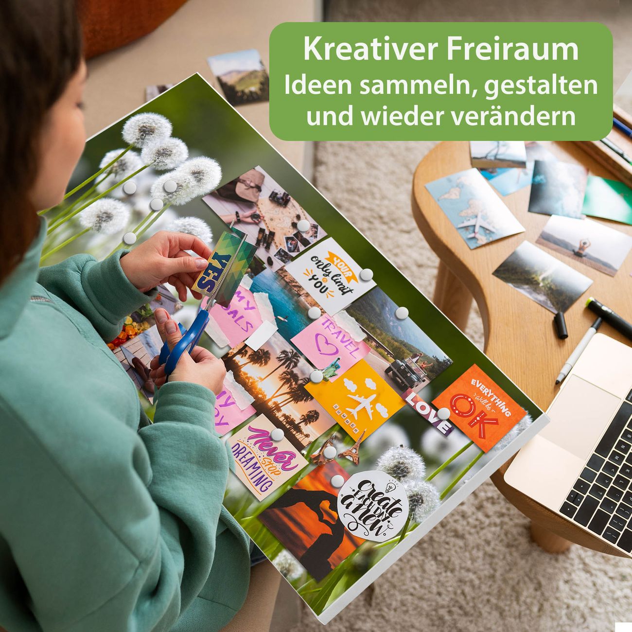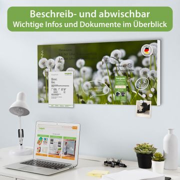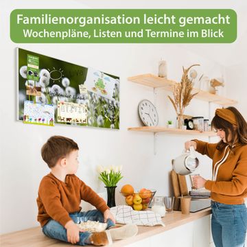 FUNKTION: Die banjado Magnettafel 78x37 cm im Design Motiv Pusteblumenwiese vereint Funktionalität und modernes Wohndesign auf stilvolle Weise. Diese hochwertige Magnetwand aus Metall hilft Ihnen dabei, Notizen, Fotos, Termine, Einkaufslisten oder Rezepte übersichtlich zu organisieren. Als praktisches Memoboard sorgt sie für Struktur im Alltag und setzt gleichzeitig einen dekorativen Akzent an Ihrer Wand. DESIGN: Die Metalltafel besteht aus robustem, lackiertem Stahl und ist mit allen handelsüblichen Magneten nutzbar. Besonders praktisch ist die beschreibbare Oberfläche. Sie können die Magnettafel ganz einfach mit Kreidestiften beschriften und die Inhalte bei Bedarf mit einem feuchten Tuch wieder entfernen. So eignet sich das Memoboard ideal für Wochenpläne, Menüpläne, To Do Listen oder kreative Botschaften. DETAILS: Mit ihrem großzügigen Querformat von 78x37 cm bietet die Magnettafel ausreichend Platz für Ihre Organisation. Das Motiv Motiv Pusteblumenwiese bringt eine warme, natürliche Optik in Küche, Flur, Büro oder Homeoffice und wirkt auch ohne Magnete oder Beschriftung wie ein modernes Wandbild. NUTZEN: Auf der Rückseite befinden sich vorgefertigte Löcher für eine schnelle und unkomplizierte Wandmontage. Jede banjado Magnettafel wird in Deutschland gefertigt und steht für Qualität, Langlebigkeit und liebevolle Verarbeitung. Dieses beschreibbare Memoboard ist die perfekte Kombination aus Metalltafel, Designobjekt und praktischer Magnetwand für Ihren Alltag. BANJADO: Wir sind ein kleines Team aus dem Herzen von Sachsen. Wir fertigen alle Artikel von Hand für Sie an, Sie erhalten keine preiswerte Importware. Auf Wunsch können Sie auch Ihr eigenes Foto auf die Magnettafel aufbringen, schreiben Sie uns an. Herzlichst, Ihr banjado-Team
