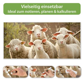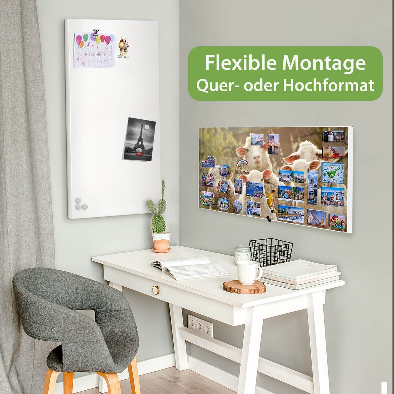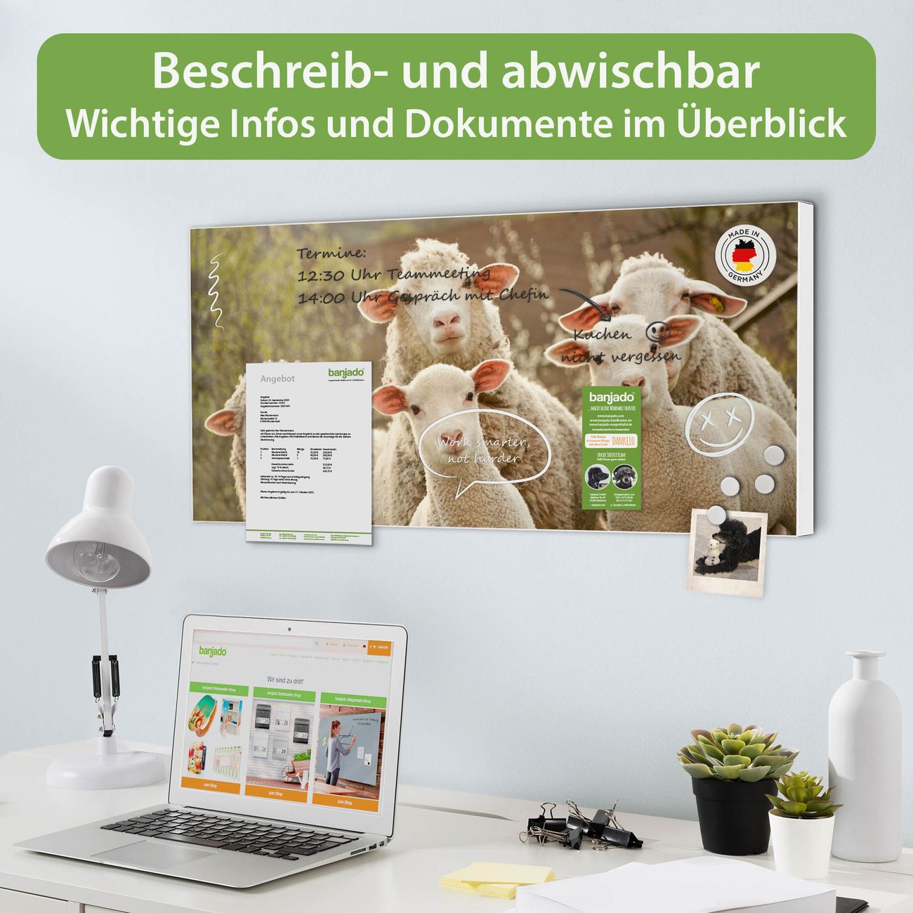 FUNKTION: Die banjado Magnettafel 78x37 cm im Design Motiv Schaffamilie vereint Funktionalität und modernes Wohndesign auf stilvolle Weise. Diese hochwertige Magnetwand aus Metall hilft Ihnen dabei, Notizen, Fotos, Termine, Einkaufslisten oder Rezepte übersichtlich zu organisieren. Als praktisches Memoboard sorgt sie für Struktur im Alltag und setzt gleichzeitig einen dekorativen Akzent an Ihrer Wand. DESIGN: Die Metalltafel besteht aus robustem, lackiertem Stahl und ist mit allen handelsüblichen Magneten nutzbar. Besonders praktisch ist die beschreibbare Oberfläche. Sie können die Magnettafel ganz einfach mit Kreidestiften beschriften und die Inhalte bei Bedarf mit einem feuchten Tuch wieder entfernen. So eignet sich das Memoboard ideal für Wochenpläne, Menüpläne, To Do Listen oder kreative Botschaften. DETAILS: Mit ihrem großzügigen Querformat von 78x37 cm bietet die Magnettafel ausreichend Platz für Ihre Organisation. Das Motiv Motiv Schaffamilie bringt eine warme, natürliche Optik in Küche, Flur, Büro oder Homeoffice und wirkt auch ohne Magnete oder Beschriftung wie ein modernes Wandbild. NUTZEN: Auf der Rückseite befinden sich vorgefertigte Löcher für eine schnelle und unkomplizierte Wandmontage. Jede banjado Magnettafel wird in Deutschland gefertigt und steht für Qualität, Langlebigkeit und liebevolle Verarbeitung. Dieses beschreibbare Memoboard ist die perfekte Kombination aus Metalltafel, Designobjekt und praktischer Magnetwand für Ihren Alltag. BANJADO: Wir sind ein kleines Team aus dem Herzen von Sachsen. Wir fertigen alle Artikel von Hand für Sie an, Sie erhalten keine preiswerte Importware. Auf Wunsch können Sie auch Ihr eigenes Foto auf die Magnettafel aufbringen, schreiben Sie uns an. Herzlichst, Ihr banjado-Team
