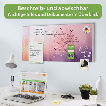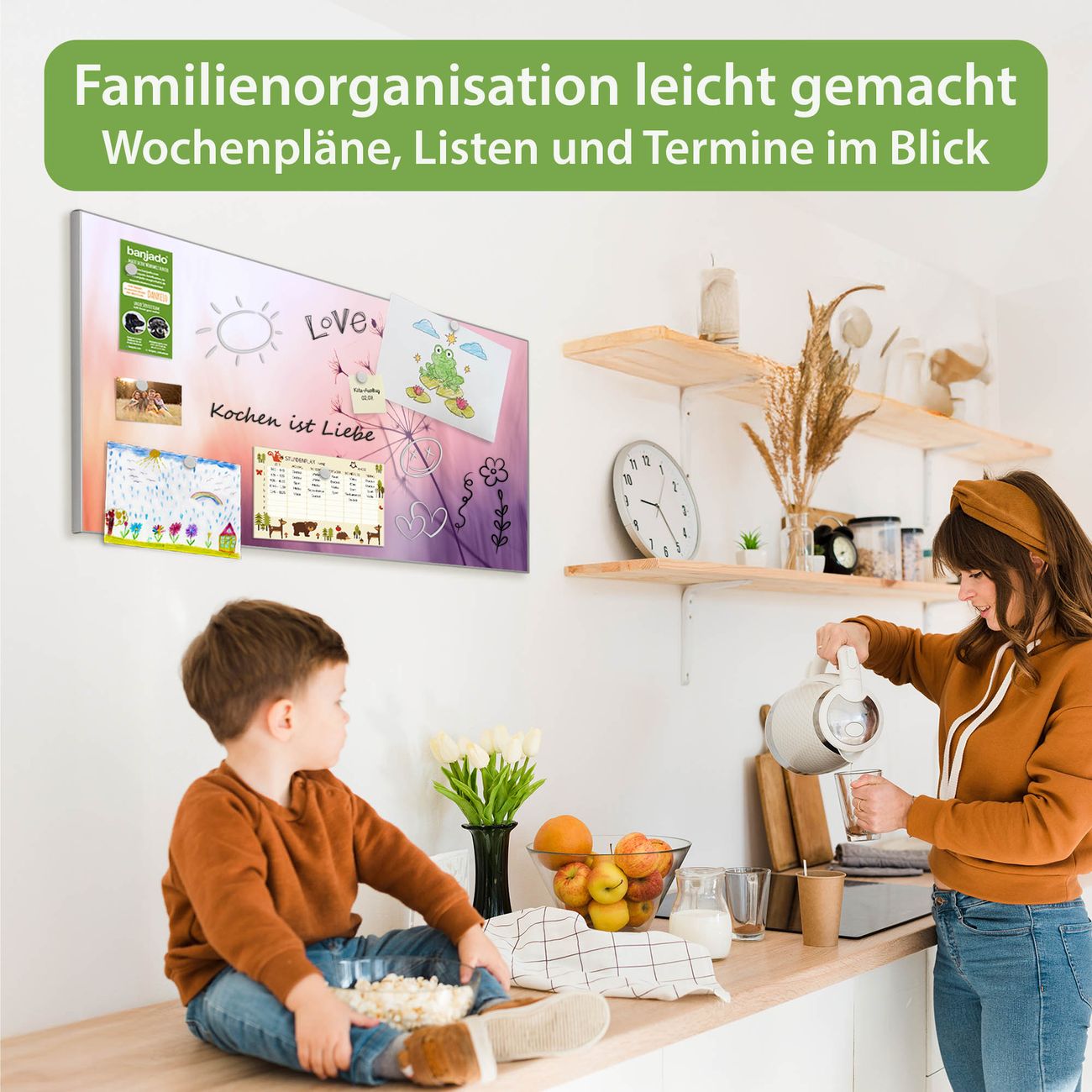 FUNKTION: Die banjado Magnettafel 78x37 cm im Design Motiv Sommergras vereint Funktionalität und modernes Wohndesign auf stilvolle Weise. Diese hochwertige Magnetwand aus Metall hilft Ihnen dabei, Notizen, Fotos, Termine, Einkaufslisten oder Rezepte übersichtlich zu organisieren. Als praktisches Memoboard sorgt sie für Struktur im Alltag und setzt gleichzeitig einen dekorativen Akzent an Ihrer Wand. DESIGN: Die Metalltafel besteht aus robustem, lackiertem Stahl und ist mit allen handelsüblichen Magneten nutzbar. Besonders praktisch ist die beschreibbare Oberfläche. Sie können die Magnettafel ganz einfach mit Kreidestiften beschriften und die Inhalte bei Bedarf mit einem feuchten Tuch wieder entfernen. So eignet sich das Memoboard ideal für Wochenpläne, Menüpläne, To Do Listen oder kreative Botschaften. DETAILS: Mit ihrem großzügigen Querformat von 78x37 cm bietet die Magnettafel ausreichend Platz für Ihre Organisation. Das Motiv Motiv Sommergras bringt eine warme, natürliche Optik in Küche, Flur, Büro oder Homeoffice und wirkt auch ohne Magnete oder Beschriftung wie ein modernes Wandbild. NUTZEN: Auf der Rückseite befinden sich vorgefertigte Löcher für eine schnelle und unkomplizierte Wandmontage. Jede banjado Magnettafel wird in Deutschland gefertigt und steht für Qualität, Langlebigkeit und liebevolle Verarbeitung. Dieses beschreibbare Memoboard ist die perfekte Kombination aus Metalltafel, Designobjekt und praktischer Magnetwand für Ihren Alltag. BANJADO: Wir sind ein kleines Team aus dem Herzen von Sachsen. Wir fertigen alle Artikel von Hand für Sie an, Sie erhalten keine preiswerte Importware. Auf Wunsch können Sie auch Ihr eigenes Foto auf die Magnettafel aufbringen, schreiben Sie uns an. Herzlichst, Ihr banjado-Team