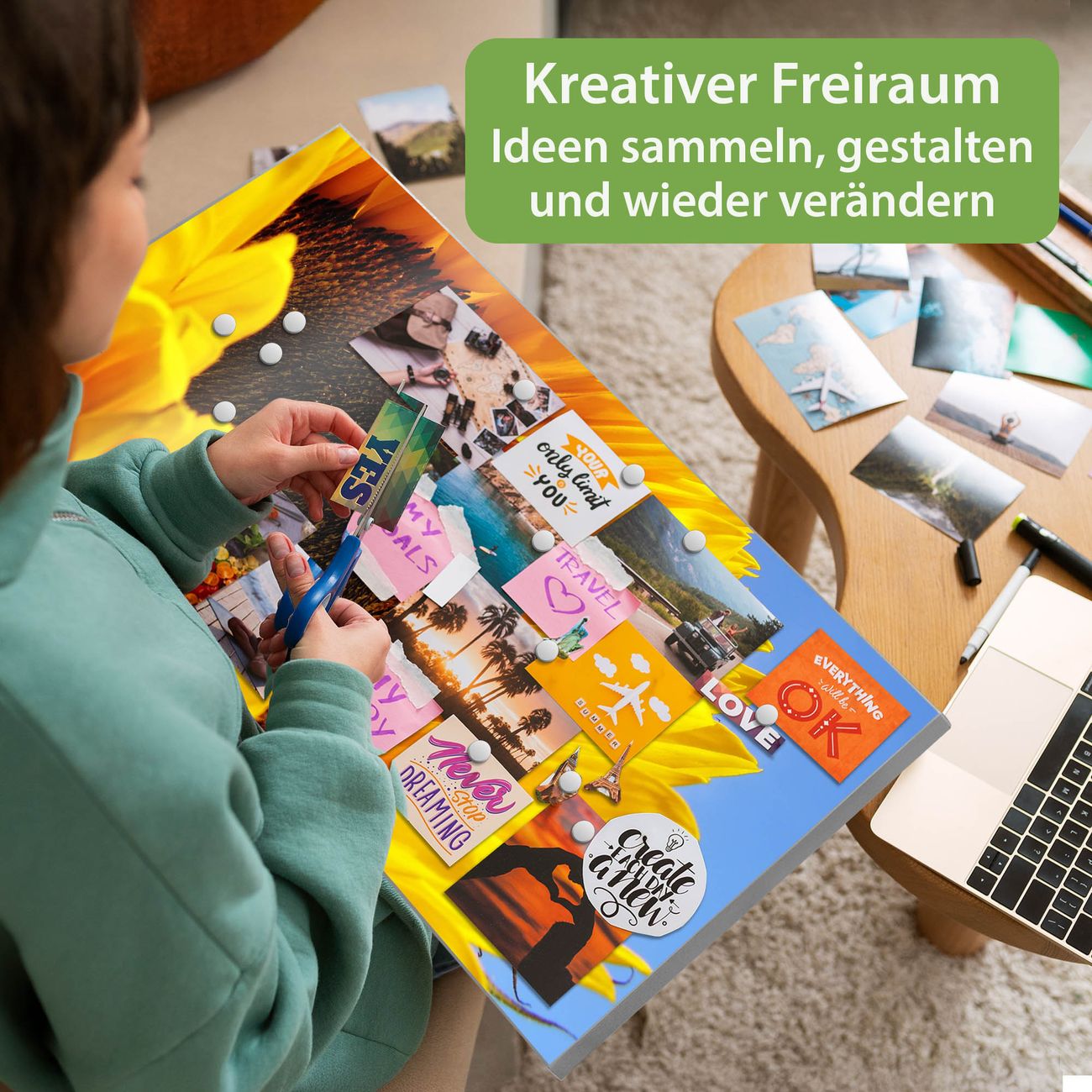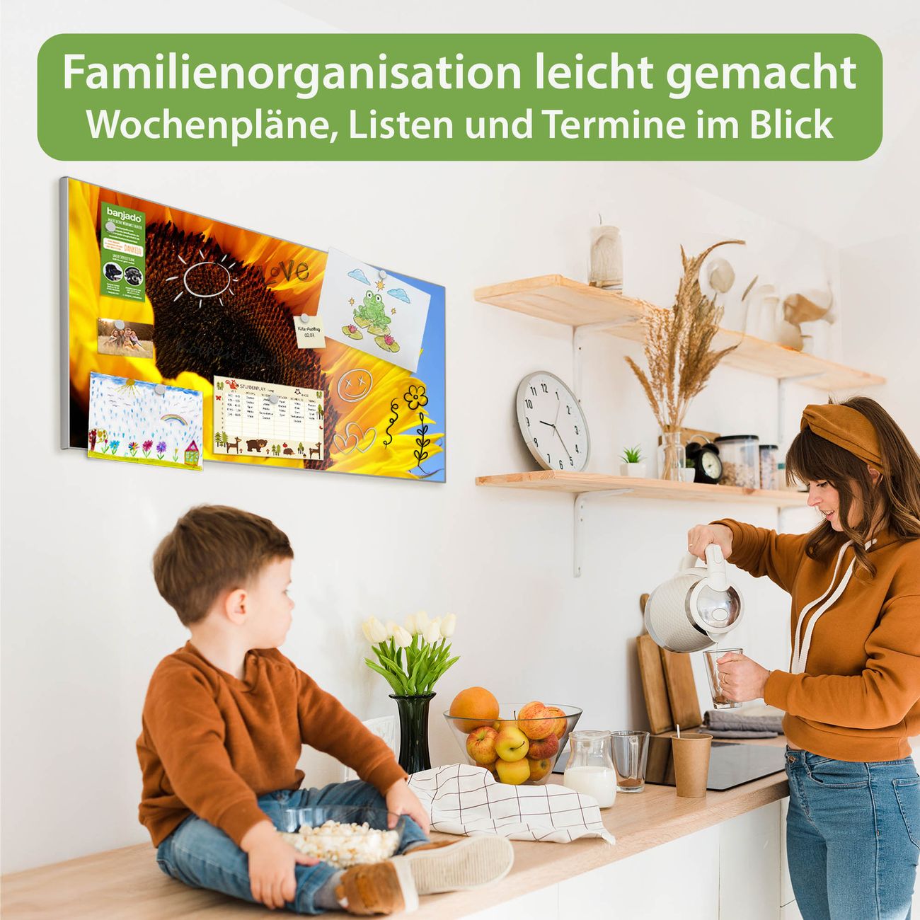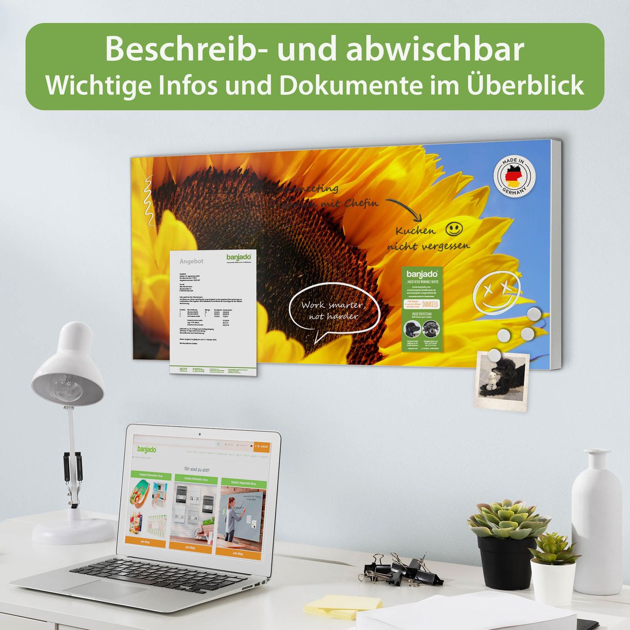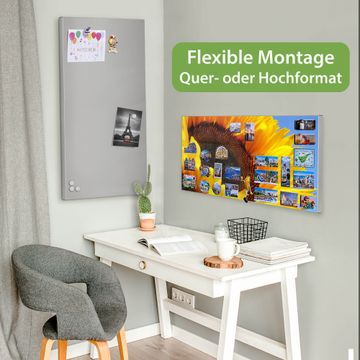 FUNKTION: Die banjado Magnettafel 78x37 cm im Design Motiv Sonnenblume vereint Funktionalität und modernes Wohndesign auf stilvolle Weise. Diese hochwertige Magnetwand aus Metall hilft Ihnen dabei, Notizen, Fotos, Termine, Einkaufslisten oder Rezepte übersichtlich zu organisieren. Als praktisches Memoboard sorgt sie für Struktur im Alltag und setzt gleichzeitig einen dekorativen Akzent an Ihrer Wand. DESIGN: Die Metalltafel besteht aus robustem, lackiertem Stahl und ist mit allen handelsüblichen Magneten nutzbar. Besonders praktisch ist die beschreibbare Oberfläche. Sie können die Magnettafel ganz einfach mit Kreidestiften beschriften und die Inhalte bei Bedarf mit einem feuchten Tuch wieder entfernen. So eignet sich das Memoboard ideal für Wochenpläne, Menüpläne, To Do Listen oder kreative Botschaften. DETAILS: Mit ihrem großzügigen Querformat von 78x37 cm bietet die Magnettafel ausreichend Platz für Ihre Organisation. Das Motiv Motiv Sonnenblume bringt eine warme, natürliche Optik in Küche, Flur, Büro oder Homeoffice und wirkt auch ohne Magnete oder Beschriftung wie ein modernes Wandbild. NUTZEN: Auf der Rückseite befinden sich vorgefertigte Löcher für eine schnelle und unkomplizierte Wandmontage. Jede banjado Magnettafel wird in Deutschland gefertigt und steht für Qualität, Langlebigkeit und liebevolle Verarbeitung. Dieses beschreibbare Memoboard ist die perfekte Kombination aus Metalltafel, Designobjekt und praktischer Magnetwand für Ihren Alltag. BANJADO: Wir sind ein kleines Team aus dem Herzen von Sachsen. Wir fertigen alle Artikel von Hand für Sie an, Sie erhalten keine preiswerte Importware. Auf Wunsch können Sie auch Ihr eigenes Foto auf die Magnettafel aufbringen, schreiben Sie uns an. Herzlichst, Ihr banjado-Team