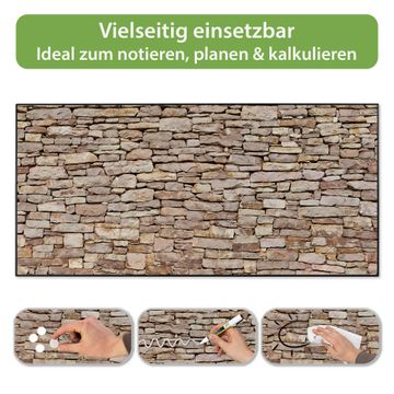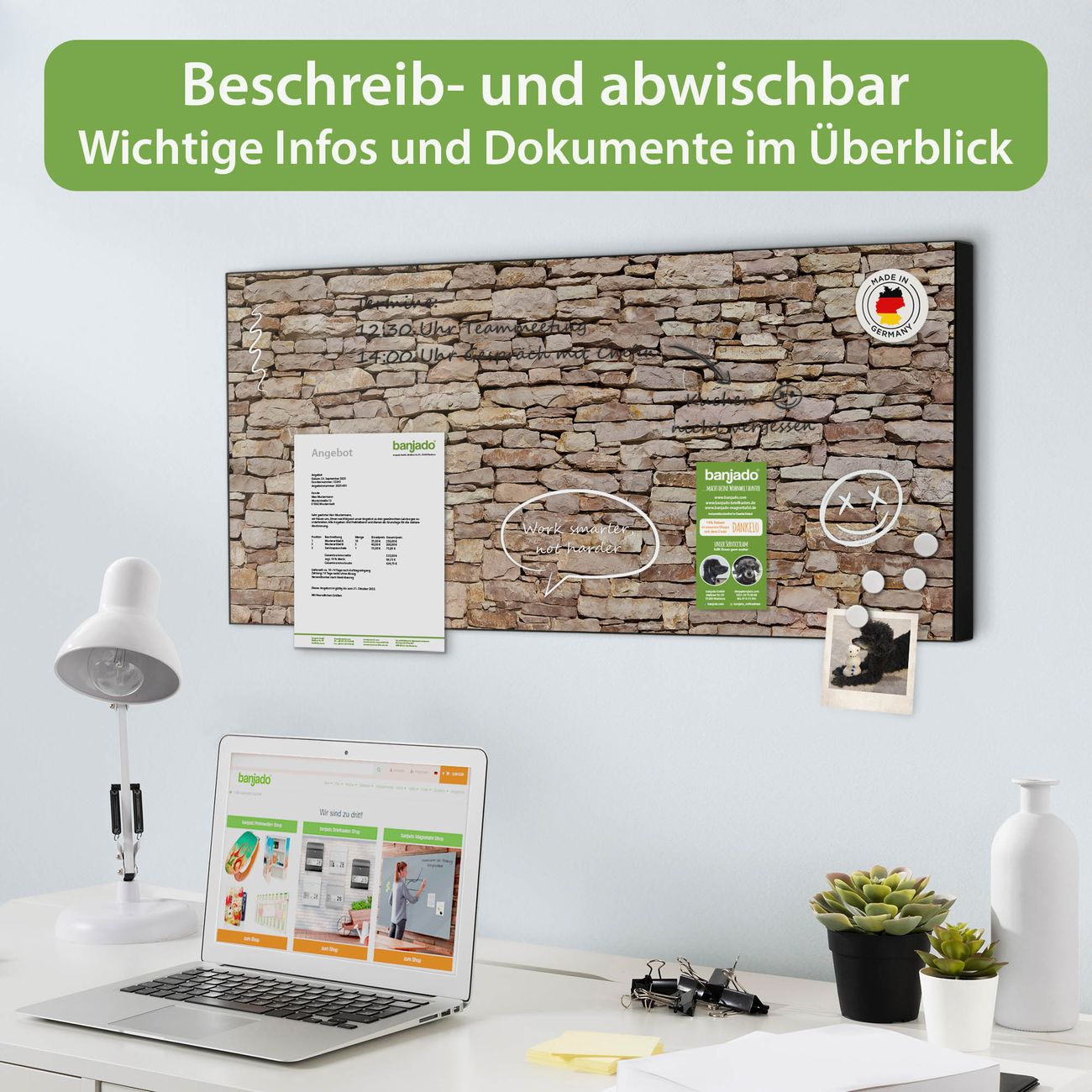 FUNKTION: Die banjado Magnettafel 78x37 cm im Design Motiv Stadtmauer vereint Funktionalität und modernes Wohndesign auf stilvolle Weise. Diese hochwertige Magnetwand aus Metall hilft Ihnen dabei, Notizen, Fotos, Termine, Einkaufslisten oder Rezepte übersichtlich zu organisieren. Als praktisches Memoboard sorgt sie für Struktur im Alltag und setzt gleichzeitig einen dekorativen Akzent an Ihrer Wand. DESIGN: Die Metalltafel besteht aus robustem, lackiertem Stahl und ist mit allen handelsüblichen Magneten nutzbar. Besonders praktisch ist die beschreibbare Oberfläche. Sie können die Magnettafel ganz einfach mit Kreidestiften beschriften und die Inhalte bei Bedarf mit einem feuchten Tuch wieder entfernen. So eignet sich das Memoboard ideal für Wochenpläne, Menüpläne, To Do Listen oder kreative Botschaften. DETAILS: Mit ihrem großzügigen Querformat von 78x37 cm bietet die Magnettafel ausreichend Platz für Ihre Organisation. Das Motiv Motiv Stadtmauer bringt eine warme, natürliche Optik in Küche, Flur, Büro oder Homeoffice und wirkt auch ohne Magnete oder Beschriftung wie ein modernes Wandbild. NUTZEN: Auf der Rückseite befinden sich vorgefertigte Löcher für eine schnelle und unkomplizierte Wandmontage. Jede banjado Magnettafel wird in Deutschland gefertigt und steht für Qualität, Langlebigkeit und liebevolle Verarbeitung. Dieses beschreibbare Memoboard ist die perfekte Kombination aus Metalltafel, Designobjekt und praktischer Magnetwand für Ihren Alltag. BANJADO: Wir sind ein kleines Team aus dem Herzen von Sachsen. Wir fertigen alle Artikel von Hand für Sie an, Sie erhalten keine preiswerte Importware. Auf Wunsch können Sie auch Ihr eigenes Foto auf die Magnettafel aufbringen, schreiben Sie uns an. Herzlichst, Ihr banjado-Team