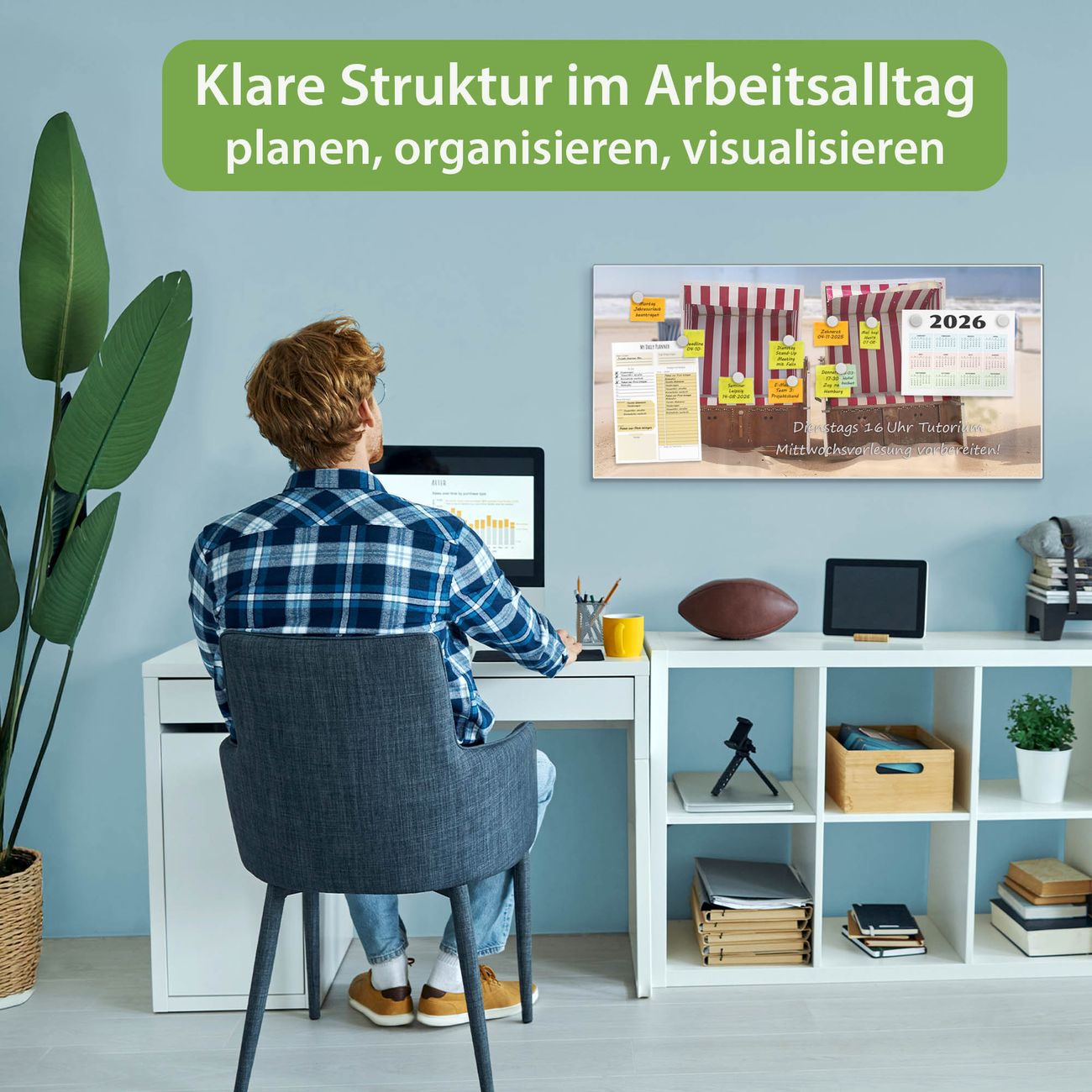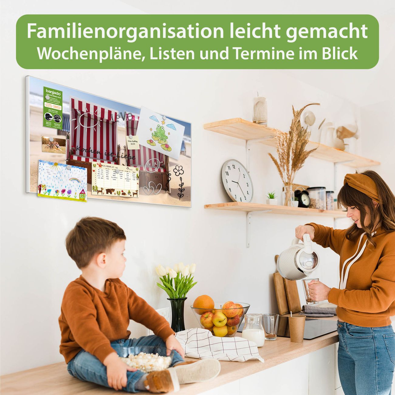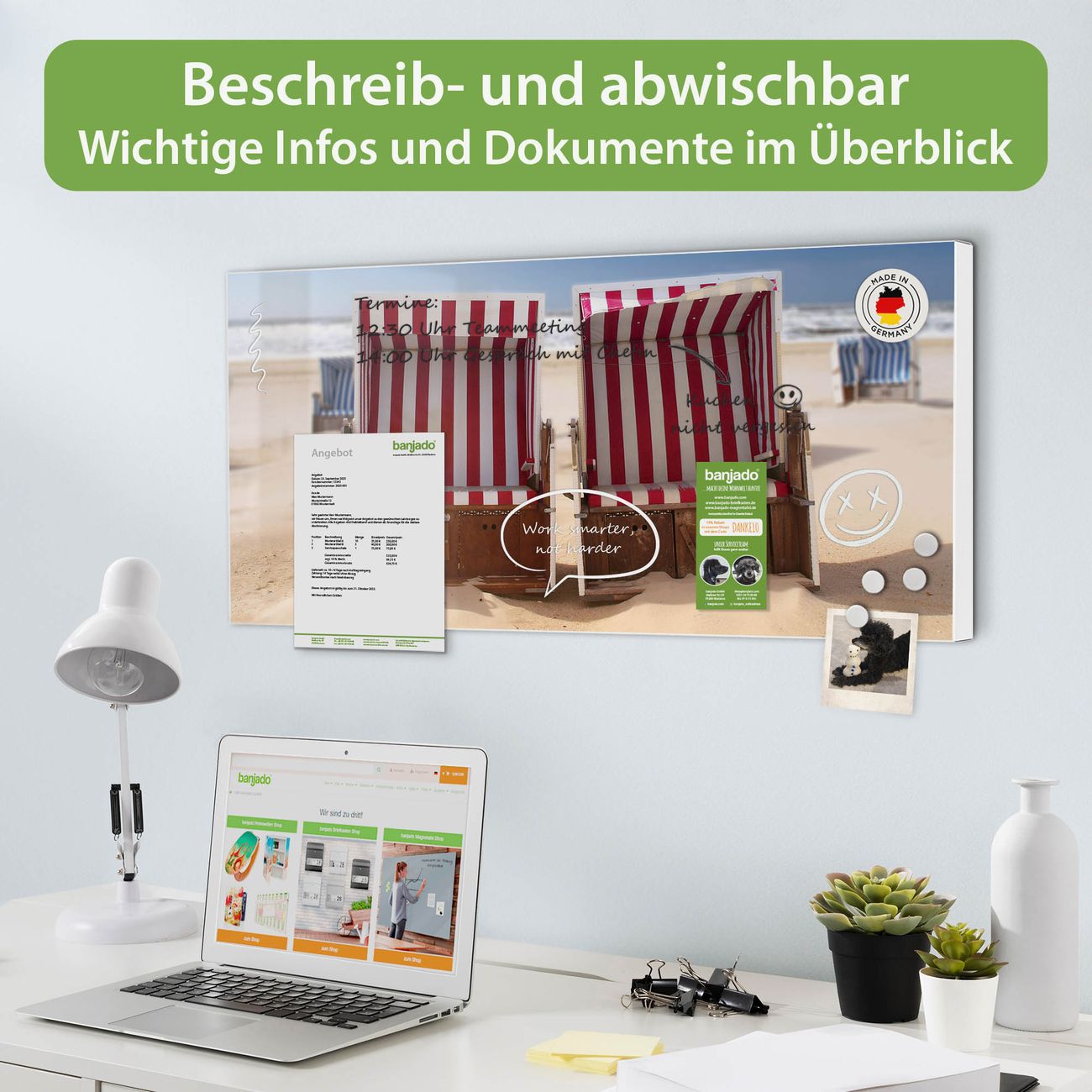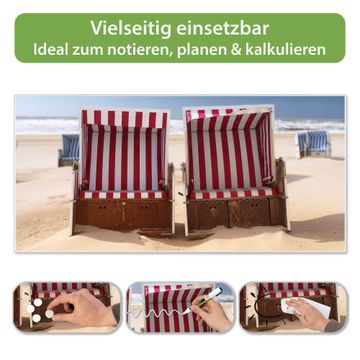 FUNKTION: Die banjado Magnettafel 78x37 cm im Design Motiv Strandkörbe vereint Funktionalität und modernes Wohndesign auf stilvolle Weise. Diese hochwertige Magnetwand aus Metall hilft Ihnen dabei, Notizen, Fotos, Termine, Einkaufslisten oder Rezepte übersichtlich zu organisieren. Als praktisches Memoboard sorgt sie für Struktur im Alltag und setzt gleichzeitig einen dekorativen Akzent an Ihrer Wand. DESIGN: Die Metalltafel besteht aus robustem, lackiertem Stahl und ist mit allen handelsüblichen Magneten nutzbar. Besonders praktisch ist die beschreibbare Oberfläche. Sie können die Magnettafel ganz einfach mit Kreidestiften beschriften und die Inhalte bei Bedarf mit einem feuchten Tuch wieder entfernen. So eignet sich das Memoboard ideal für Wochenpläne, Menüpläne, To Do Listen oder kreative Botschaften. DETAILS: Mit ihrem großzügigen Querformat von 78x37 cm bietet die Magnettafel ausreichend Platz für Ihre Organisation. Das Motiv Motiv Strandkörbe bringt eine warme, natürliche Optik in Küche, Flur, Büro oder Homeoffice und wirkt auch ohne Magnete oder Beschriftung wie ein modernes Wandbild. NUTZEN: Auf der Rückseite befinden sich vorgefertigte Löcher für eine schnelle und unkomplizierte Wandmontage. Jede banjado Magnettafel wird in Deutschland gefertigt und steht für Qualität, Langlebigkeit und liebevolle Verarbeitung. Dieses beschreibbare Memoboard ist die perfekte Kombination aus Metalltafel, Designobjekt und praktischer Magnetwand für Ihren Alltag. BANJADO: Wir sind ein kleines Team aus dem Herzen von Sachsen. Wir fertigen alle Artikel von Hand für Sie an, Sie erhalten keine preiswerte Importware. Auf Wunsch können Sie auch Ihr eigenes Foto auf die Magnettafel aufbringen, schreiben Sie uns an. Herzlichst, Ihr banjado-Team