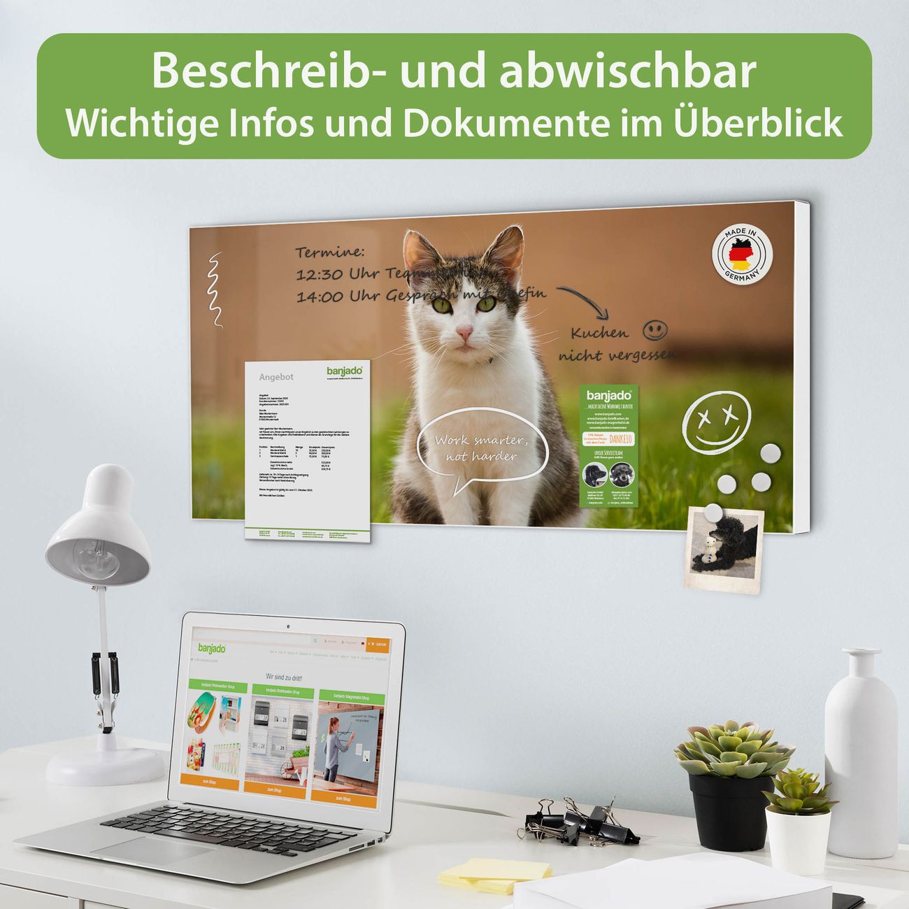 FUNKTION: Die banjado Magnettafel 78x37 cm im Design Motiv Suse vereint Funktionalität und modernes Wohndesign auf stilvolle Weise. Diese hochwertige Magnetwand aus Metall hilft Ihnen dabei, Notizen, Fotos, Termine, Einkaufslisten oder Rezepte übersichtlich zu organisieren. Als praktisches Memoboard sorgt sie für Struktur im Alltag und setzt gleichzeitig einen dekorativen Akzent an Ihrer Wand. DESIGN: Die Metalltafel besteht aus robustem, lackiertem Stahl und ist mit allen handelsüblichen Magneten nutzbar. Besonders praktisch ist die beschreibbare Oberfläche. Sie können die Magnettafel ganz einfach mit Kreidestiften beschriften und die Inhalte bei Bedarf mit einem feuchten Tuch wieder entfernen. So eignet sich das Memoboard ideal für Wochenpläne, Menüpläne, To Do Listen oder kreative Botschaften. DETAILS: Mit ihrem großzügigen Querformat von 78x37 cm bietet die Magnettafel ausreichend Platz für Ihre Organisation. Das Motiv Motiv Suse bringt eine warme, natürliche Optik in Küche, Flur, Büro oder Homeoffice und wirkt auch ohne Magnete oder Beschriftung wie ein modernes Wandbild. NUTZEN: Auf der Rückseite befinden sich vorgefertigte Löcher für eine schnelle und unkomplizierte Wandmontage. Jede banjado Magnettafel wird in Deutschland gefertigt und steht für Qualität, Langlebigkeit und liebevolle Verarbeitung. Dieses beschreibbare Memoboard ist die perfekte Kombination aus Metalltafel, Designobjekt und praktischer Magnetwand für Ihren Alltag. BANJADO: Wir sind ein kleines Team aus dem Herzen von Sachsen. Wir fertigen alle Artikel von Hand für Sie an, Sie erhalten keine preiswerte Importware. Auf Wunsch können Sie auch Ihr eigenes Foto auf die Magnettafel aufbringen, schreiben Sie uns an. Herzlichst, Ihr banjado-Team
