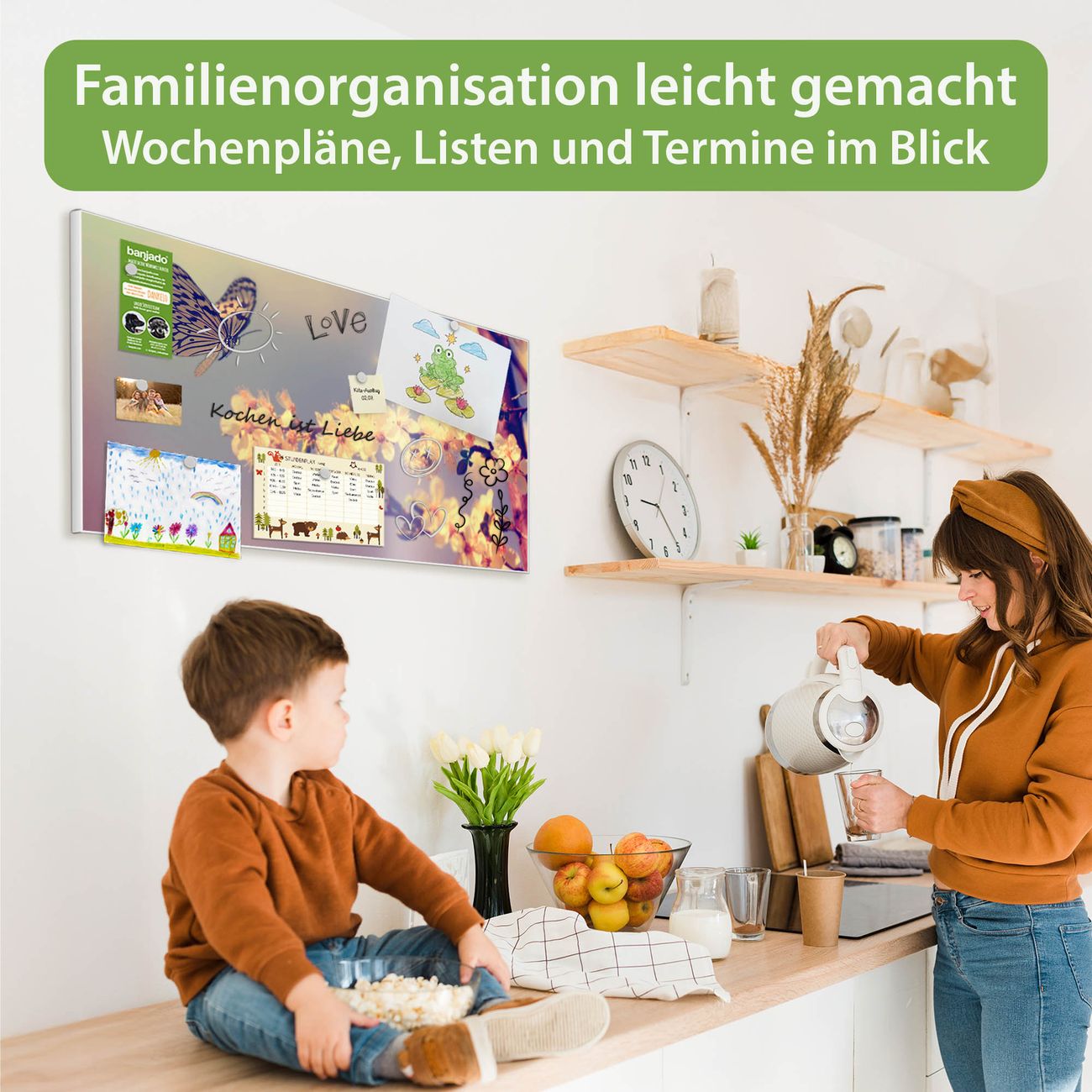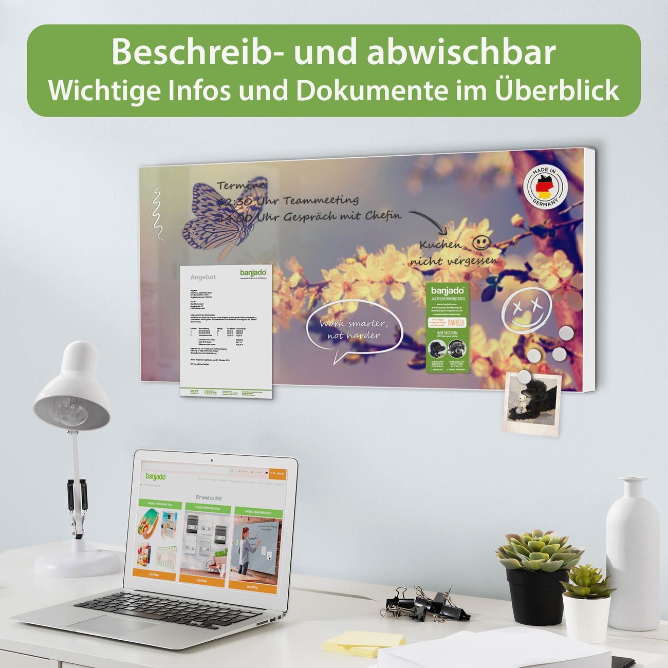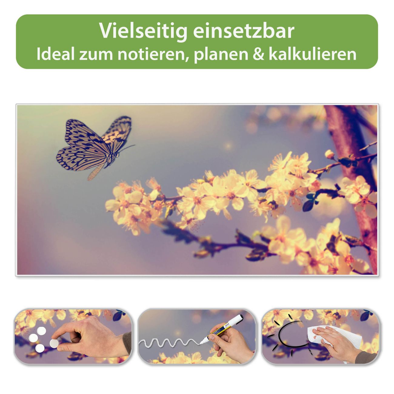 FUNKTION: Die banjado Magnettafel 78x37 cm im Design Motiv Tag Im Mai vereint Funktionalität und modernes Wohndesign auf stilvolle Weise. Diese hochwertige Magnetwand aus Metall hilft Ihnen dabei, Notizen, Fotos, Termine, Einkaufslisten oder Rezepte übersichtlich zu organisieren. Als praktisches Memoboard sorgt sie für Struktur im Alltag und setzt gleichzeitig einen dekorativen Akzent an Ihrer Wand. DESIGN: Die Metalltafel besteht aus robustem, lackiertem Stahl und ist mit allen handelsüblichen Magneten nutzbar. Besonders praktisch ist die beschreibbare Oberfläche. Sie können die Magnettafel ganz einfach mit Kreidestiften beschriften und die Inhalte bei Bedarf mit einem feuchten Tuch wieder entfernen. So eignet sich das Memoboard ideal für Wochenpläne, Menüpläne, To Do Listen oder kreative Botschaften. DETAILS: Mit ihrem großzügigen Querformat von 78x37 cm bietet die Magnettafel ausreichend Platz für Ihre Organisation. Das Motiv Motiv Tag Im Mai bringt eine warme, natürliche Optik in Küche, Flur, Büro oder Homeoffice und wirkt auch ohne Magnete oder Beschriftung wie ein modernes Wandbild. NUTZEN: Auf der Rückseite befinden sich vorgefertigte Löcher für eine schnelle und unkomplizierte Wandmontage. Jede banjado Magnettafel wird in Deutschland gefertigt und steht für Qualität, Langlebigkeit und liebevolle Verarbeitung. Dieses beschreibbare Memoboard ist die perfekte Kombination aus Metalltafel, Designobjekt und praktischer Magnetwand für Ihren Alltag. BANJADO: Wir sind ein kleines Team aus dem Herzen von Sachsen. Wir fertigen alle Artikel von Hand für Sie an, Sie erhalten keine preiswerte Importware. Auf Wunsch können Sie auch Ihr eigenes Foto auf die Magnettafel aufbringen, schreiben Sie uns an. Herzlichst, Ihr banjado-Team