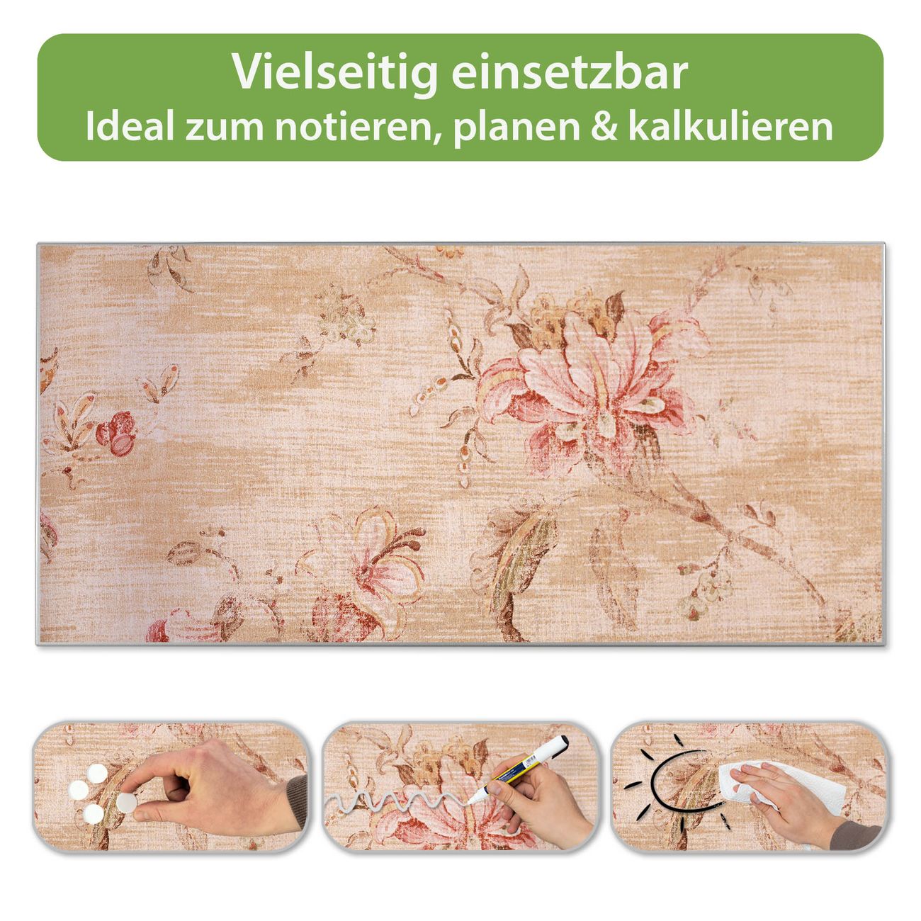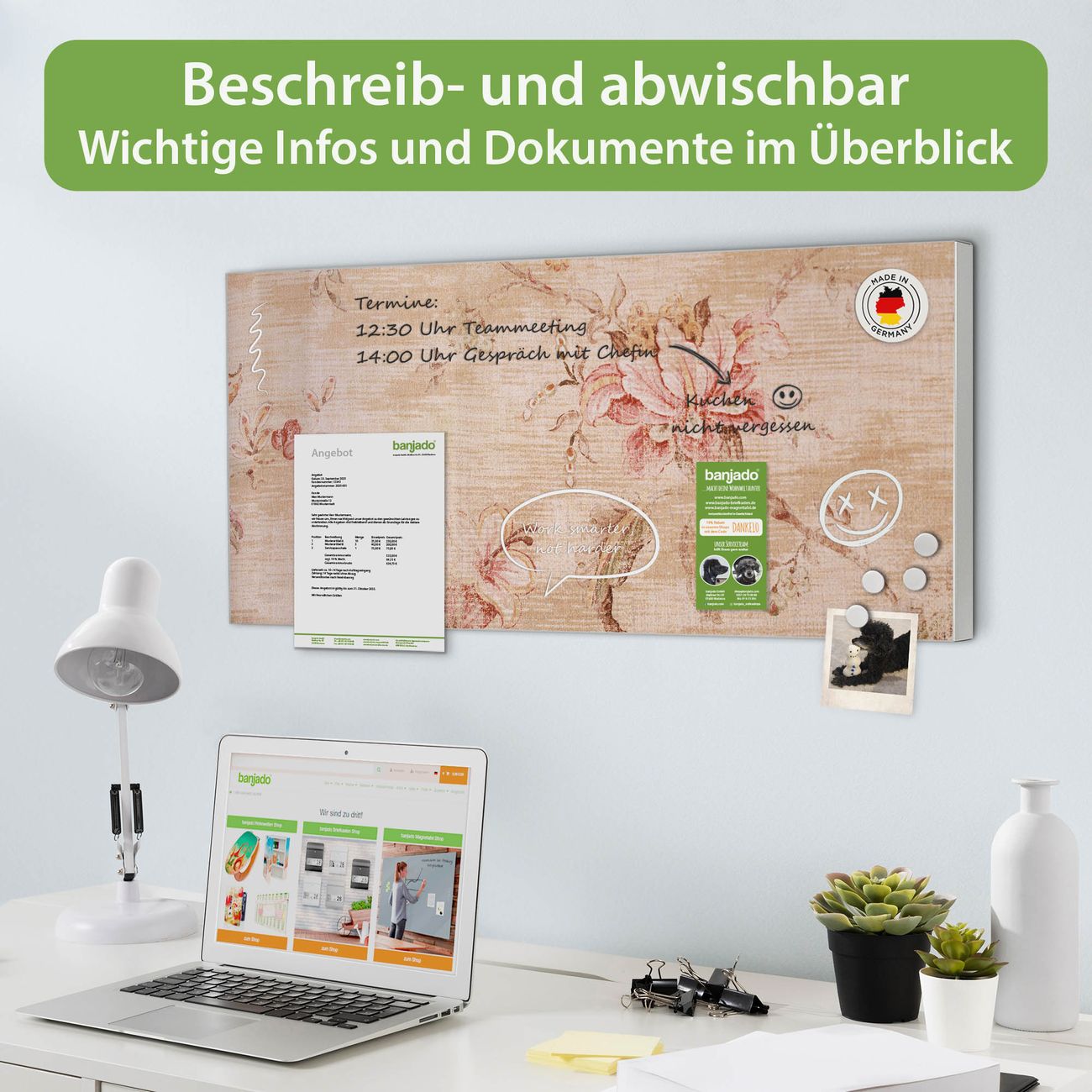 FUNKTION: Die banjado Magnettafel 78x37 cm im Design Motiv Verschwindend vereint Funktionalität und modernes Wohndesign auf stilvolle Weise. Diese hochwertige Magnetwand aus Metall hilft Ihnen dabei, Notizen, Fotos, Termine, Einkaufslisten oder Rezepte übersichtlich zu organisieren. Als praktisches Memoboard sorgt sie für Struktur im Alltag und setzt gleichzeitig einen dekorativen Akzent an Ihrer Wand. DESIGN: Die Metalltafel besteht aus robustem, lackiertem Stahl und ist mit allen handelsüblichen Magneten nutzbar. Besonders praktisch ist die beschreibbare Oberfläche. Sie können die Magnettafel ganz einfach mit Kreidestiften beschriften und die Inhalte bei Bedarf mit einem feuchten Tuch wieder entfernen. So eignet sich das Memoboard ideal für Wochenpläne, Menüpläne, To Do Listen oder kreative Botschaften. DETAILS: Mit ihrem großzügigen Querformat von 78x37 cm bietet die Magnettafel ausreichend Platz für Ihre Organisation. Das Motiv Motiv Verschwindend bringt eine warme, natürliche Optik in Küche, Flur, Büro oder Homeoffice und wirkt auch ohne Magnete oder Beschriftung wie ein modernes Wandbild. NUTZEN: Auf der Rückseite befinden sich vorgefertigte Löcher für eine schnelle und unkomplizierte Wandmontage. Jede banjado Magnettafel wird in Deutschland gefertigt und steht für Qualität, Langlebigkeit und liebevolle Verarbeitung. Dieses beschreibbare Memoboard ist die perfekte Kombination aus Metalltafel, Designobjekt und praktischer Magnetwand für Ihren Alltag. BANJADO: Wir sind ein kleines Team aus dem Herzen von Sachsen. Wir fertigen alle Artikel von Hand für Sie an, Sie erhalten keine preiswerte Importware. Auf Wunsch können Sie auch Ihr eigenes Foto auf die Magnettafel aufbringen, schreiben Sie uns an. Herzlichst, Ihr banjado-Team