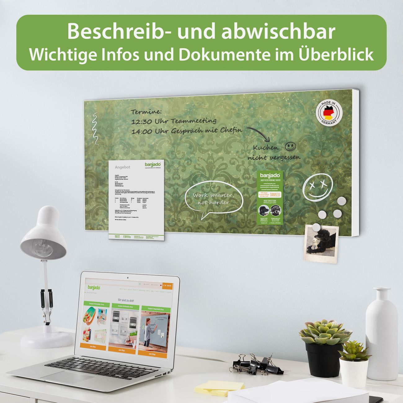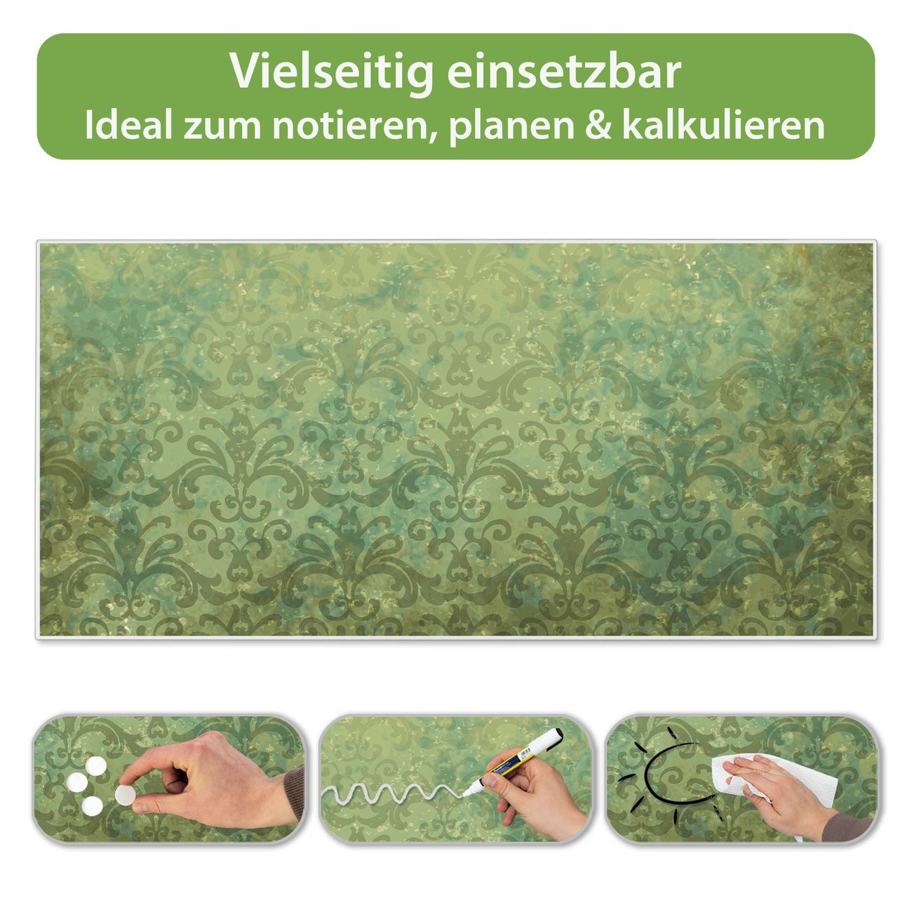 FUNKTION: Die banjado Magnettafel 78x37 cm im Design Motiv Vintage Messing vereint Funktionalität und modernes Wohndesign auf stilvolle Weise. Diese hochwertige Magnetwand aus Metall hilft Ihnen dabei, Notizen, Fotos, Termine, Einkaufslisten oder Rezepte übersichtlich zu organisieren. Als praktisches Memoboard sorgt sie für Struktur im Alltag und setzt gleichzeitig einen dekorativen Akzent an Ihrer Wand. DESIGN: Die Metalltafel besteht aus robustem, lackiertem Stahl und ist mit allen handelsüblichen Magneten nutzbar. Besonders praktisch ist die beschreibbare Oberfläche. Sie können die Magnettafel ganz einfach mit Kreidestiften beschriften und die Inhalte bei Bedarf mit einem feuchten Tuch wieder entfernen. So eignet sich das Memoboard ideal für Wochenpläne, Menüpläne, To Do Listen oder kreative Botschaften. DETAILS: Mit ihrem großzügigen Querformat von 78x37 cm bietet die Magnettafel ausreichend Platz für Ihre Organisation. Das Motiv Motiv Vintage Messing bringt eine warme, natürliche Optik in Küche, Flur, Büro oder Homeoffice und wirkt auch ohne Magnete oder Beschriftung wie ein modernes Wandbild. NUTZEN: Auf der Rückseite befinden sich vorgefertigte Löcher für eine schnelle und unkomplizierte Wandmontage. Jede banjado Magnettafel wird in Deutschland gefertigt und steht für Qualität, Langlebigkeit und liebevolle Verarbeitung. Dieses beschreibbare Memoboard ist die perfekte Kombination aus Metalltafel, Designobjekt und praktischer Magnetwand für Ihren Alltag. BANJADO: Wir sind ein kleines Team aus dem Herzen von Sachsen. Wir fertigen alle Artikel von Hand für Sie an, Sie erhalten keine preiswerte Importware. Auf Wunsch können Sie auch Ihr eigenes Foto auf die Magnettafel aufbringen, schreiben Sie uns an. Herzlichst, Ihr banjado-Team