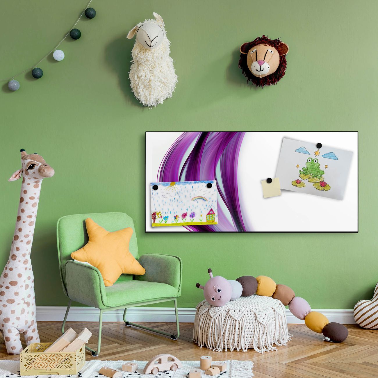 FUNKTION:  Die banjado Magnettafel mit Motiv Violet Element Motiv bringt Ordnung in Ihr Zettelchaos. Fotos, Termine, Notizen oder Rezepte lassen Sich hier stilvoll mit Magneten ordnen, Sie behalten alles im Blick. An der Design Magnetwand halten alle handesüblichen Magnete. DESIGN:  Die Metall Pinnwand mit dem Motiv Motiv Violet Element ist ein eleganter Begleiter im Alltag. Mit dieser Magnettafel haben Sie auch ohne Notizen und Magnete ein schönes Dekoelement. Das Format bietet Ihnen ausreichend Platz um alle wichtigen Informationen im Blick zu behalten. DETAILS: Die magnetische Pinnwand besteht aus silber-grau, weiß oder schwarz lackiertem Stahl. Sie hat eine Größe von 78cm x 37cm. Es befinden sich auf der Rückseite vorgefertigte Löcher die eine schnelle und unkomplizierte Anbringung ermöglichen. Das Motiv ist mit einem seidenmatten Laminat versehen und schützt so zusätzlich vor Kratzern. NUTZEN:  Sie können diese Magnettafel wunderbar als Wandbild nutzen, es halten alle handelsüblichen Magneten daran. Das Memoboard ist mit einem feuchten Lappen oder Schwamm abwischbar. Sie finden bei uns eine große Auswahl an passenden Magneten. BANJADO:  Wir sind ein kleines Team aus dem Herzen von Sachsen. Wir fertigen alle Artikel von Hand für Sie an, Sie erhalten keine preiswerte Importware. Auf Wunsch können Sie auch Ihr eigenes Foto auf die Magnettafel aufbringen, schreiben Sie uns an. Herzlichst, Ihr banjado-Team