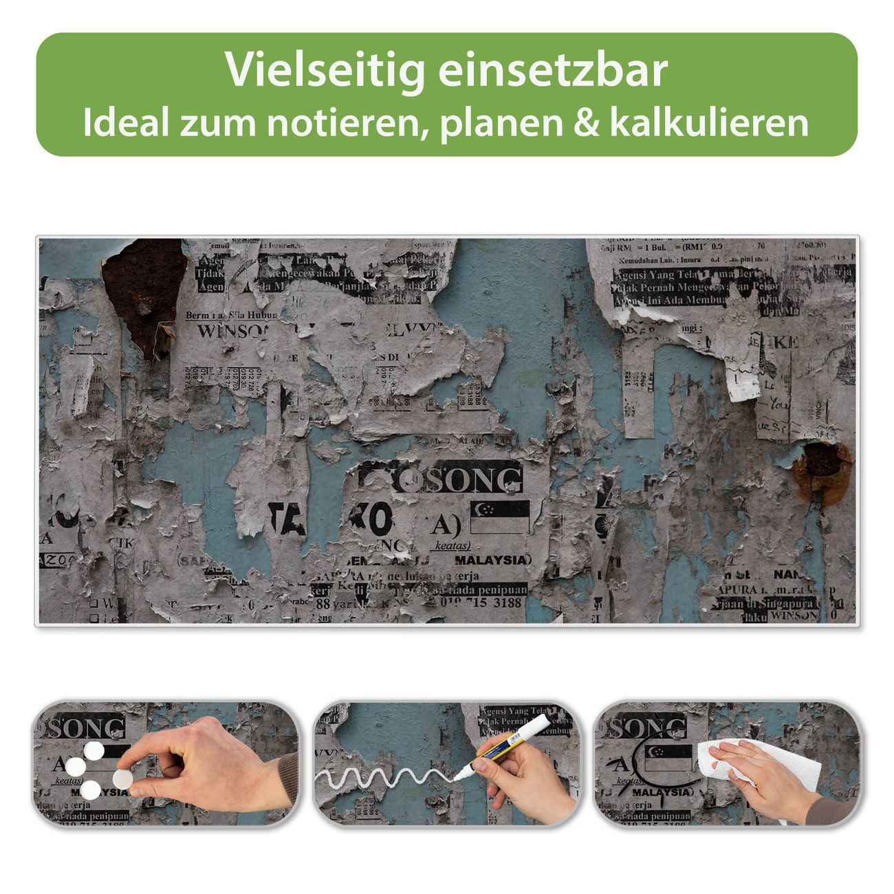 FUNKTION: Die banjado Magnettafel 78x37 cm im Design Motiv Wand mit Zeitungen vereint Funktionalität und modernes Wohndesign auf stilvolle Weise. Diese hochwertige Magnetwand aus Metall hilft Ihnen dabei, Notizen, Fotos, Termine, Einkaufslisten oder Rezepte übersichtlich zu organisieren. Als praktisches Memoboard sorgt sie für Struktur im Alltag und setzt gleichzeitig einen dekorativen Akzent an Ihrer Wand. DESIGN: Die Metalltafel besteht aus robustem, lackiertem Stahl und ist mit allen handelsüblichen Magneten nutzbar. Besonders praktisch ist die beschreibbare Oberfläche. Sie können die Magnettafel ganz einfach mit Kreidestiften beschriften und die Inhalte bei Bedarf mit einem feuchten Tuch wieder entfernen. So eignet sich das Memoboard ideal für Wochenpläne, Menüpläne, To Do Listen oder kreative Botschaften. DETAILS: Mit ihrem großzügigen Querformat von 78x37 cm bietet die Magnettafel ausreichend Platz für Ihre Organisation. Das Motiv Motiv Wand mit Zeitungen bringt eine warme, natürliche Optik in Küche, Flur, Büro oder Homeoffice und wirkt auch ohne Magnete oder Beschriftung wie ein modernes Wandbild. NUTZEN: Auf der Rückseite befinden sich vorgefertigte Löcher für eine schnelle und unkomplizierte Wandmontage. Jede banjado Magnettafel wird in Deutschland gefertigt und steht für Qualität, Langlebigkeit und liebevolle Verarbeitung. Dieses beschreibbare Memoboard ist die perfekte Kombination aus Metalltafel, Designobjekt und praktischer Magnetwand für Ihren Alltag. BANJADO: Wir sind ein kleines Team aus dem Herzen von Sachsen. Wir fertigen alle Artikel von Hand für Sie an, Sie erhalten keine preiswerte Importware. Auf Wunsch können Sie auch Ihr eigenes Foto auf die Magnettafel aufbringen, schreiben Sie uns an. Herzlichst, Ihr banjado-Team