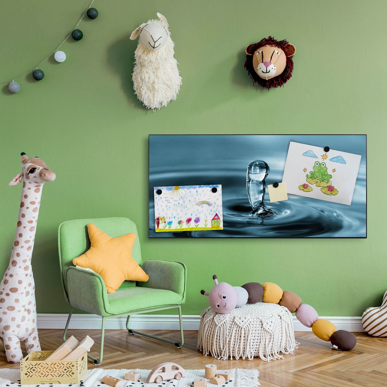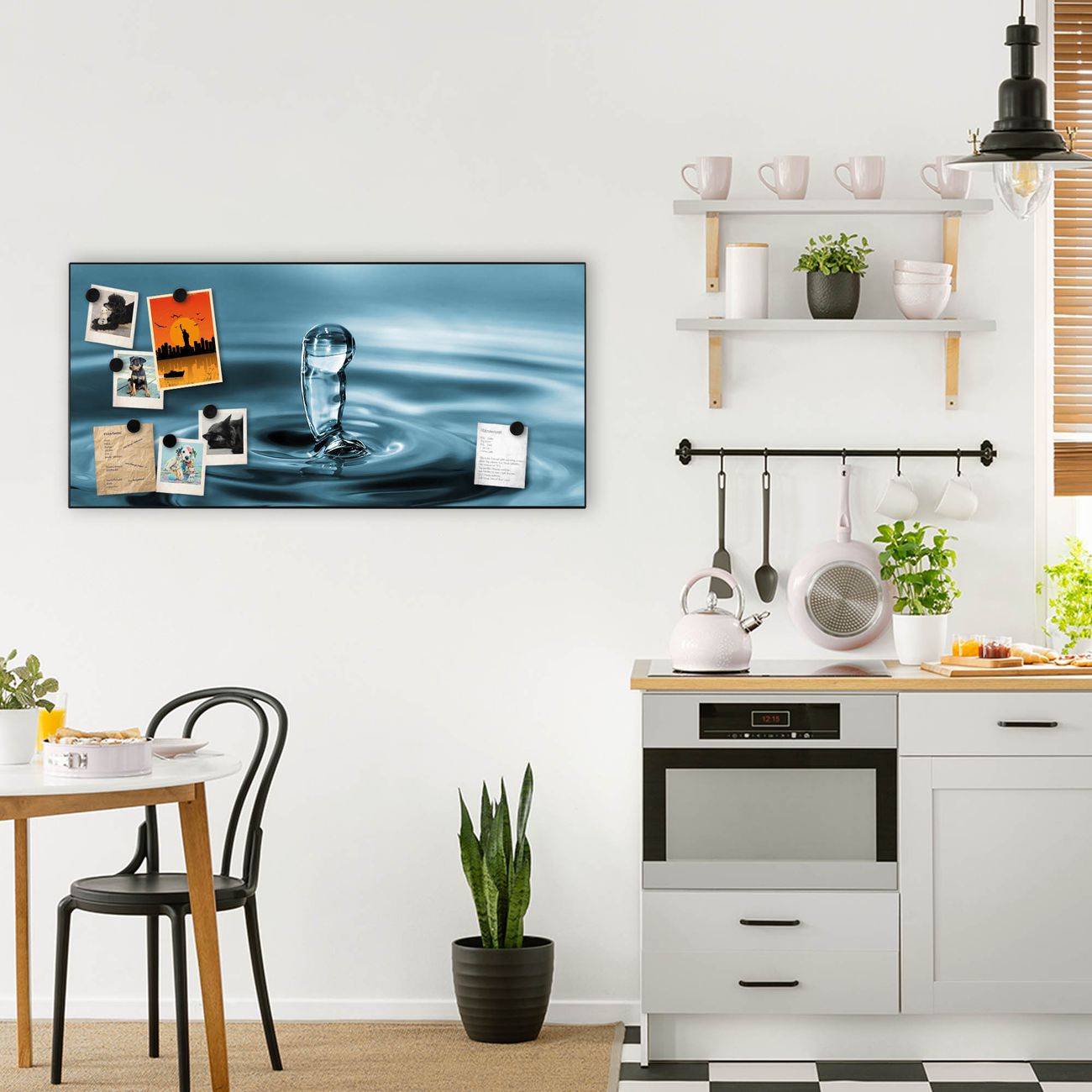 FUNKTION:  Die banjado Magnettafel mit Motiv Wassertropfen Motiv bringt Ordnung in Ihr Zettelchaos. Fotos, Termine, Notizen oder Rezepte lassen Sich hier stilvoll mit Magneten ordnen, Sie behalten alles im Blick. An der Design Magnetwand halten alle handesüblichen Magnete. DESIGN:  Die Metall Pinnwand mit dem Motiv Motiv Wassertropfen ist ein eleganter Begleiter im Alltag. Mit dieser Magnettafel haben Sie auch ohne Notizen und Magnete ein schönes Dekoelement. Das Format bietet Ihnen ausreichend Platz um alle wichtigen Informationen im Blick zu behalten. DETAILS: Die magnetische Pinnwand besteht aus silber-grau, weiß oder schwarz lackiertem Stahl. Sie hat eine Größe von 78cm x 37cm. Es befinden sich auf der Rückseite vorgefertigte Löcher die eine schnelle und unkomplizierte Anbringung ermöglichen. Das Motiv ist mit einem seidenmatten Laminat versehen und schützt so zusätzlich vor Kratzern. NUTZEN:  Sie können diese Magnettafel wunderbar als Wandbild nutzen, es halten alle handelsüblichen Magneten daran. Das Memoboard ist mit einem feuchten Lappen oder Schwamm abwischbar. Sie finden bei uns eine große Auswahl an passenden Magneten. BANJADO:  Wir sind ein kleines Team aus dem Herzen von Sachsen. Wir fertigen alle Artikel von Hand für Sie an, Sie erhalten keine preiswerte Importware. Auf Wunsch können Sie auch Ihr eigenes Foto auf die Magnettafel aufbringen, schreiben Sie uns an. Herzlichst, Ihr banjado-Team